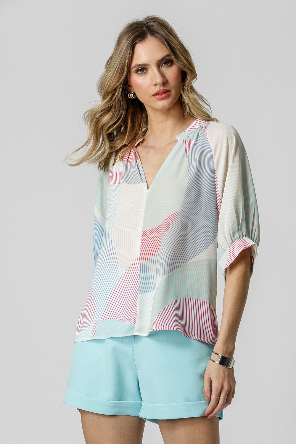 Blusa confeccionada en crepe estampado, de corte más holgado, tiene cuello americano y sisa. Detalle fruncido y puño con abertura. Una prenda esencial y versátil que se puede coordinar con todo tu guardarropa.