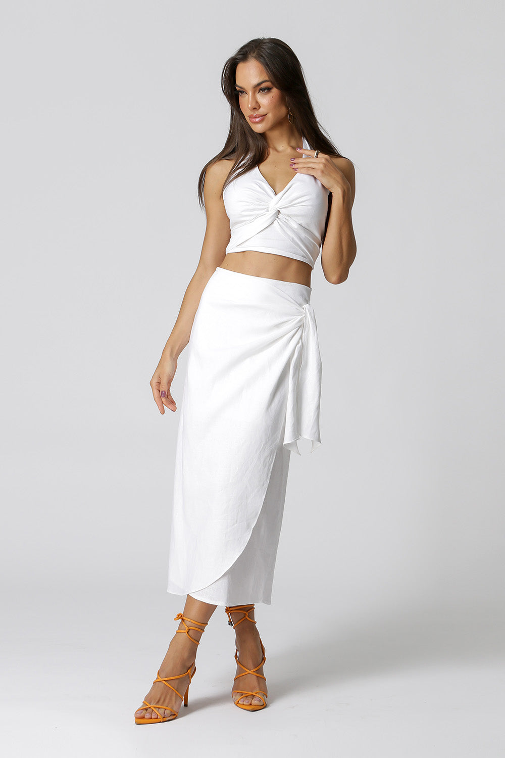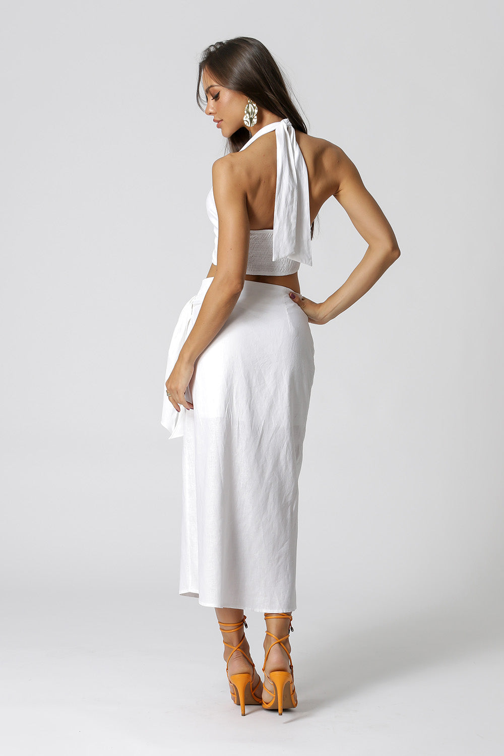 Blusa halter con elástico en la espalda y lazo en el cuello. Fabricado en tejido de lino. Una pieza súper cómoda y una gran opción para usar en diferentes looks.