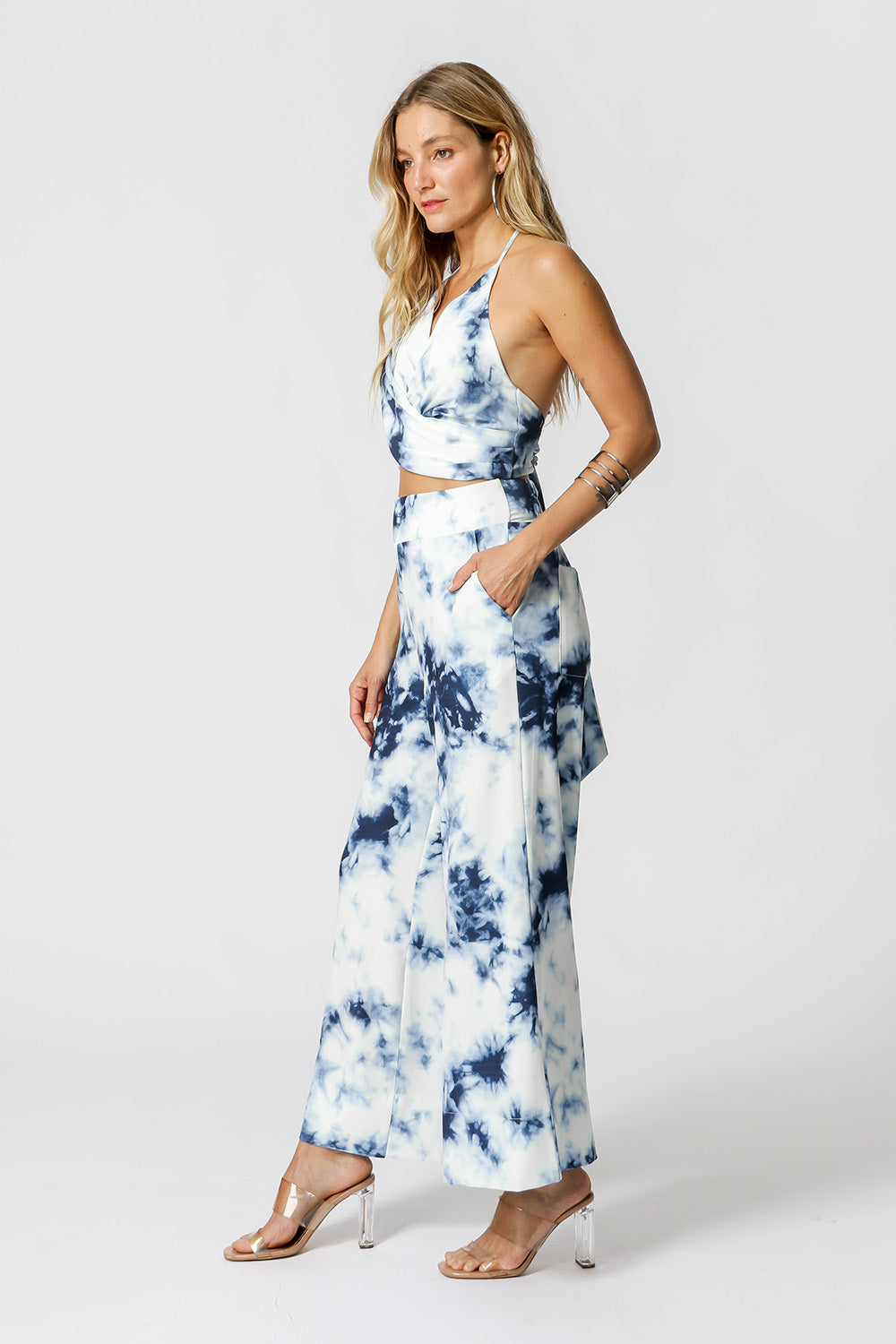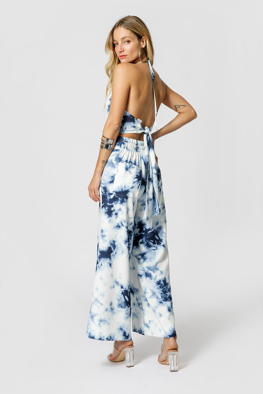 Blusa halter con lazos en cuello y espalda, con detalle de puntas de pedrería. Pieza confeccionada en tejido crepe estampado con ligera caída. Un modelo precioso, perfecto para un look casual lleno de encanto, anímate a por él.