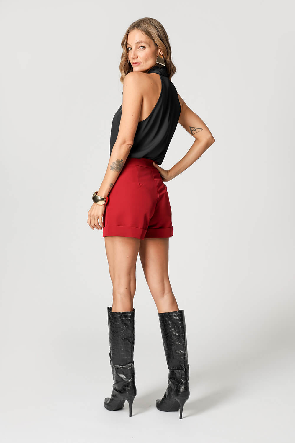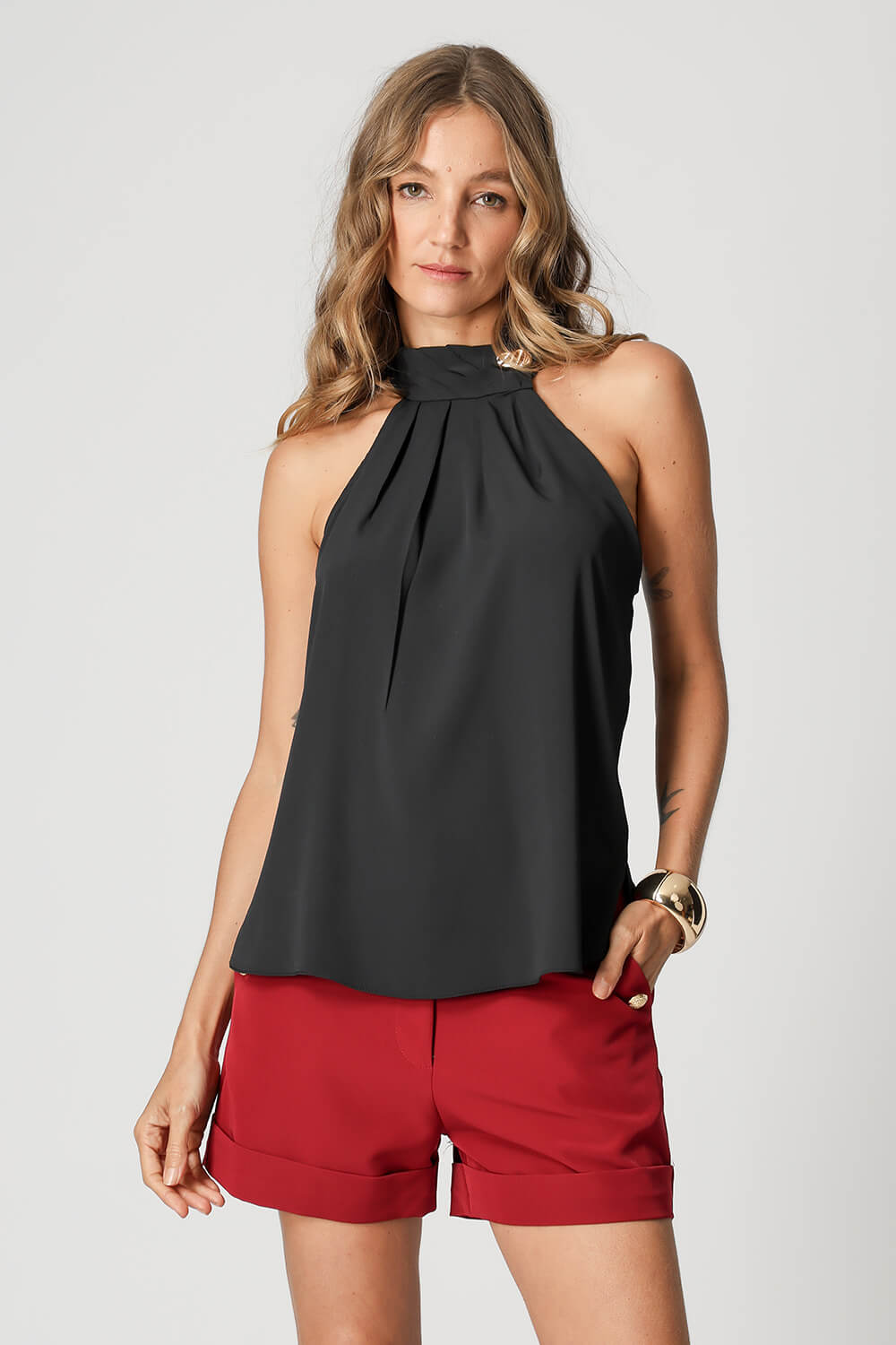 Esta blusa de cuello alto con cierre de botones ofrece un aspecto elegante y sofisticado. Sin mangas, es perfecta para crear looks ligeros y modernos, ideal para diferentes ocasiones.