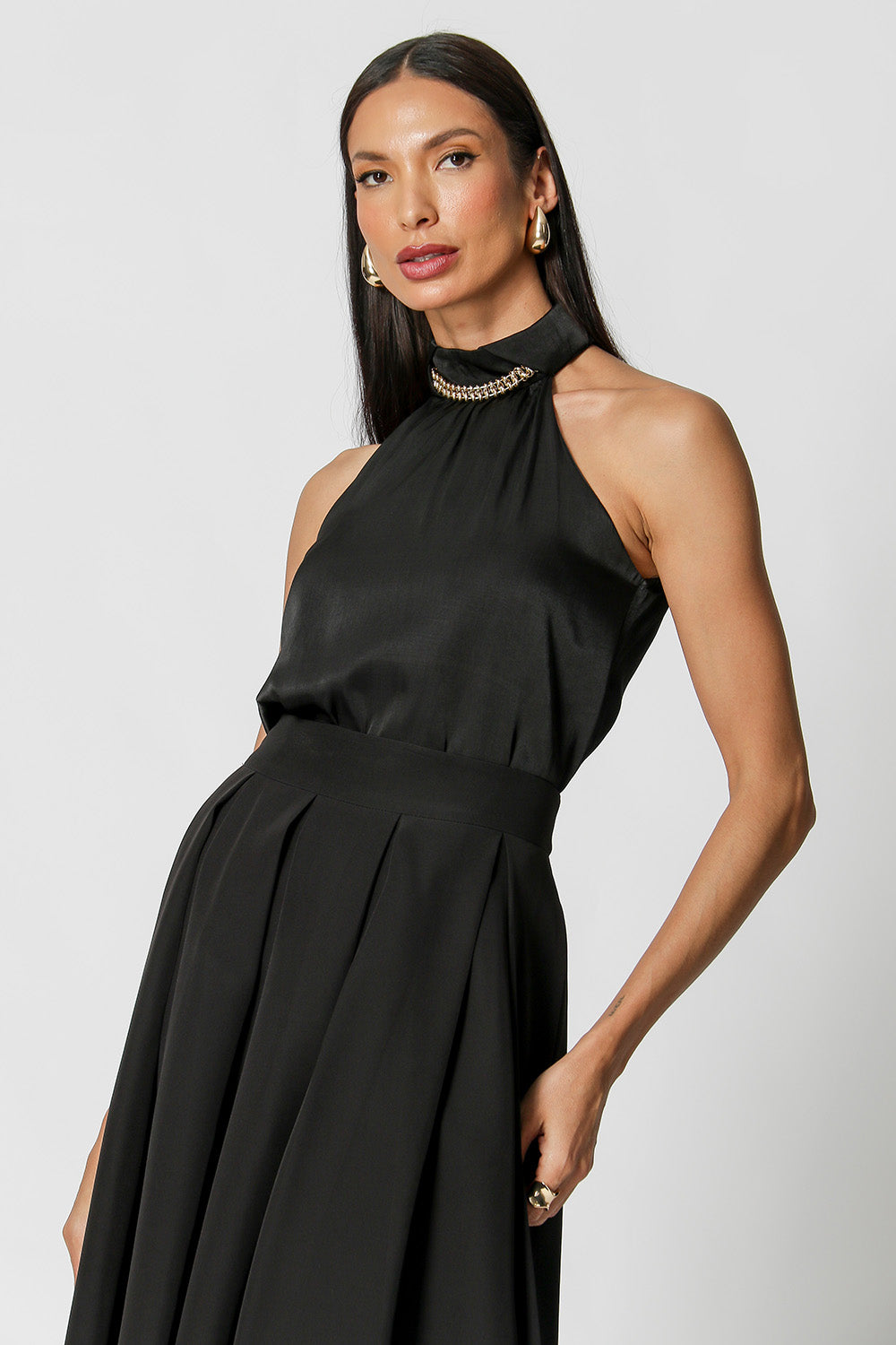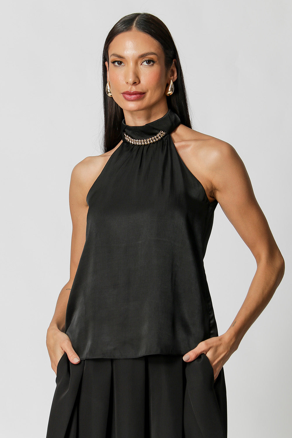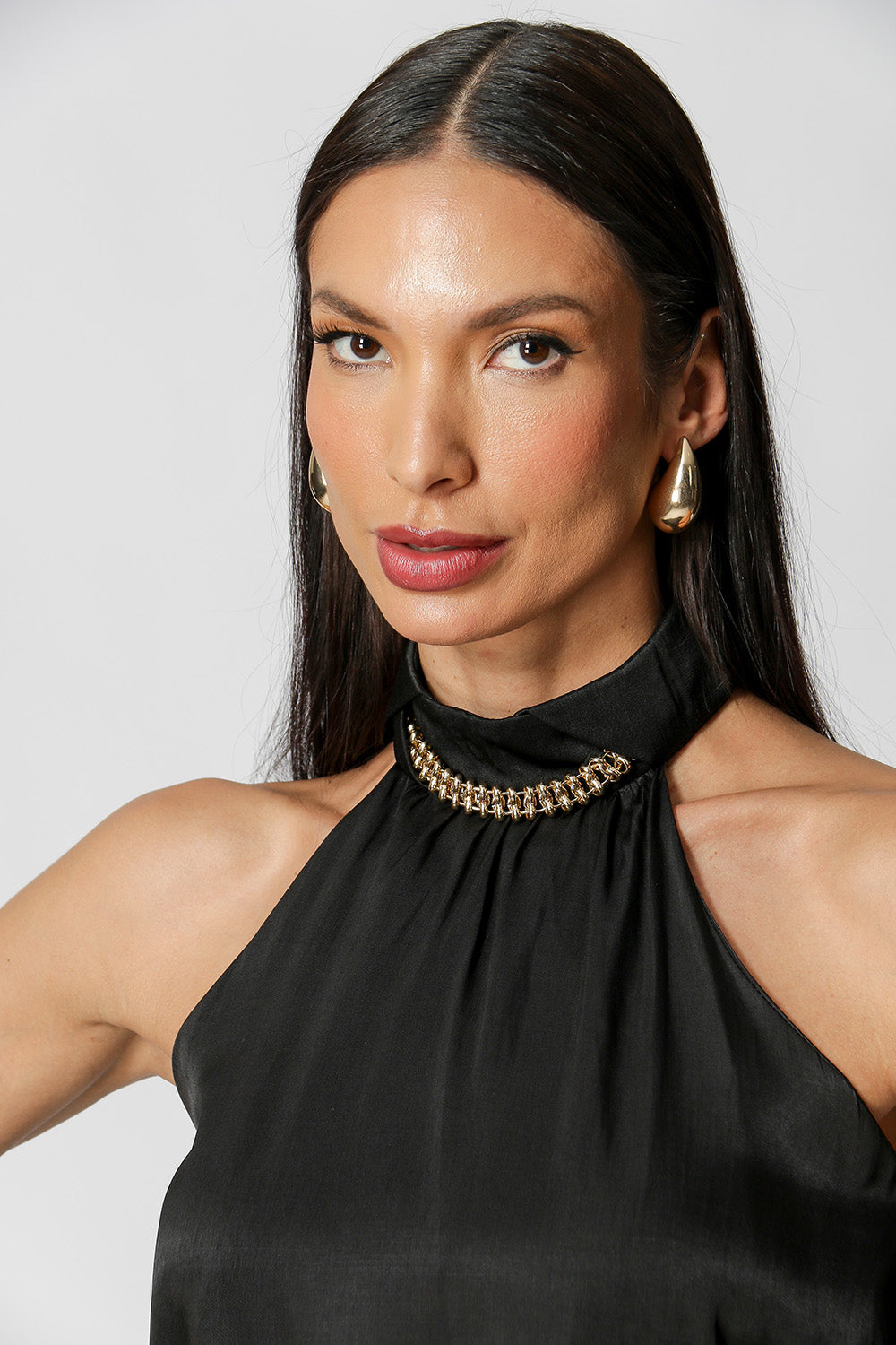 Blusa de satén con cadena, modelo con información de moda, opción ideal para quienes buscan un look elegante para la noche.