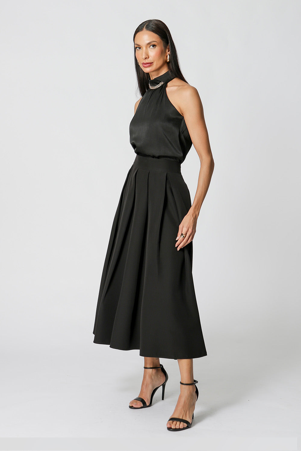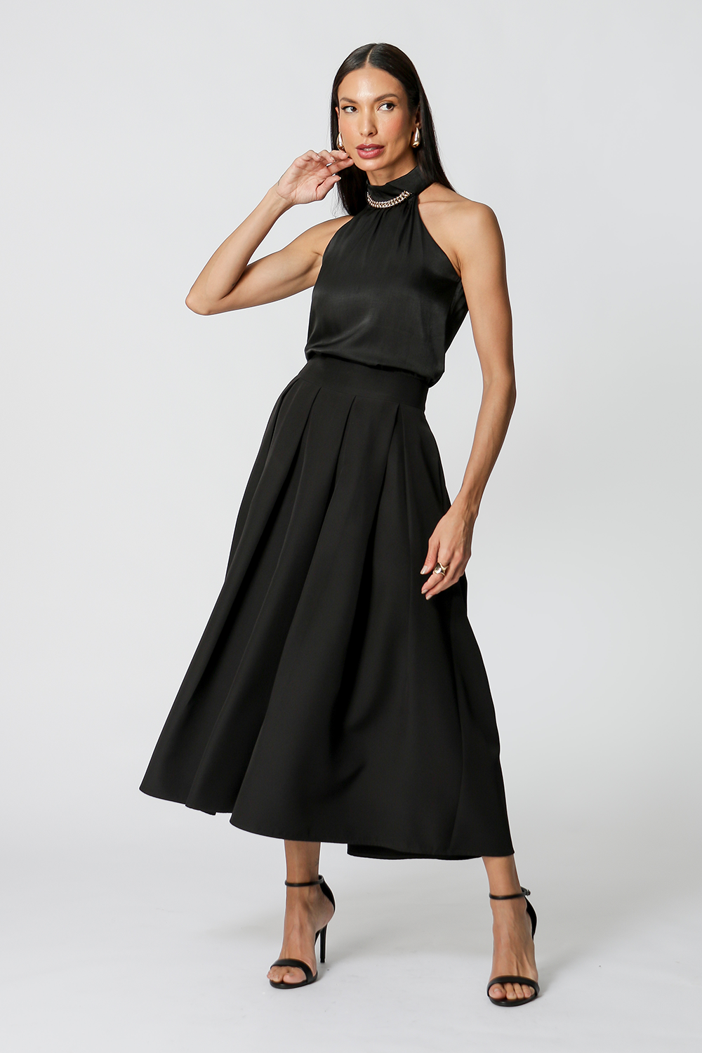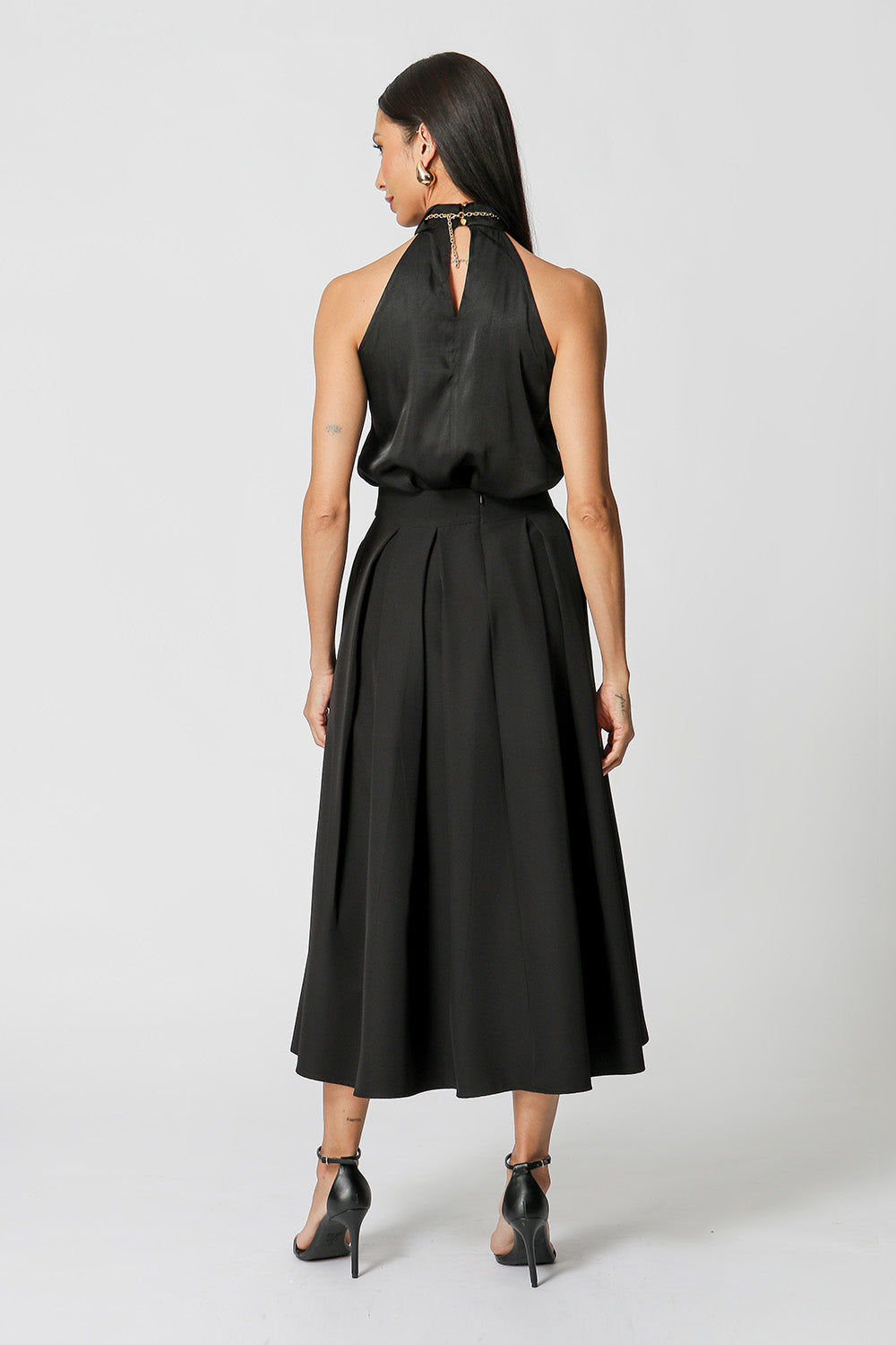 Blusa de satén con cadena, modelo con información de moda, opción ideal para quienes buscan un look elegante para la noche.