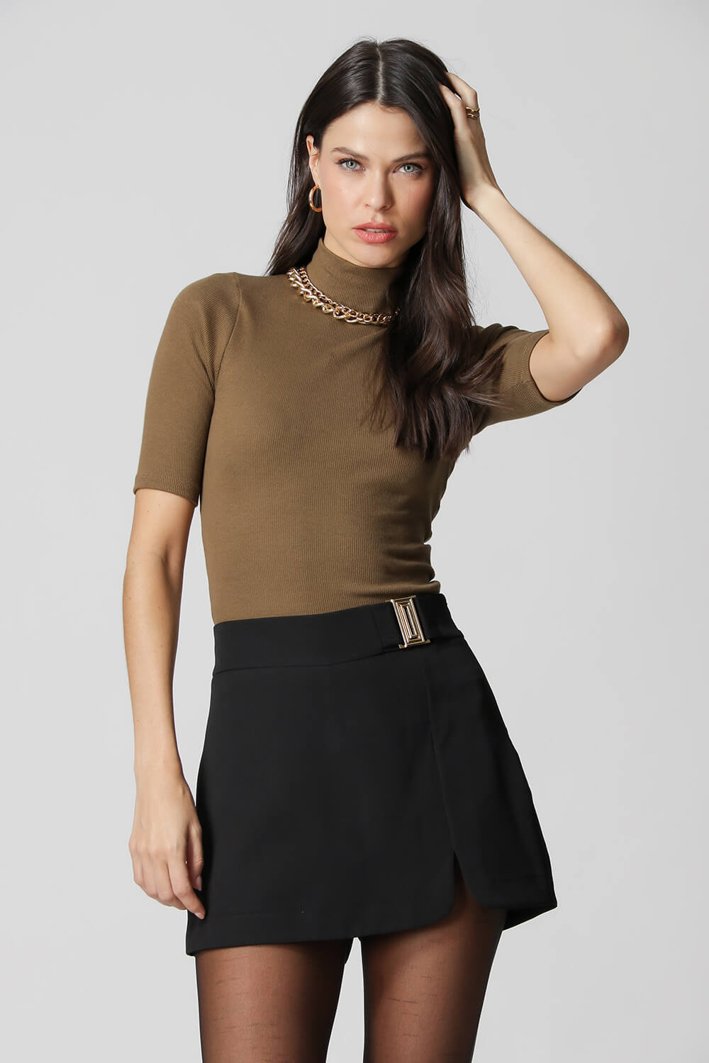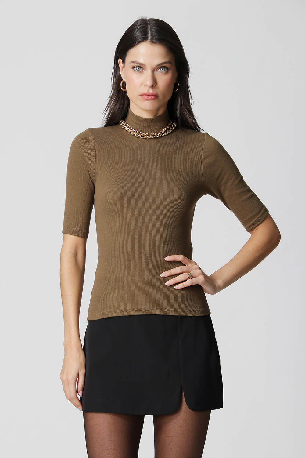 Blusa de cuello alto y manga corta. Fabricado en tejido de punto acanalado. Modelo básico de corte entallado, pieza ideal para un look casual.