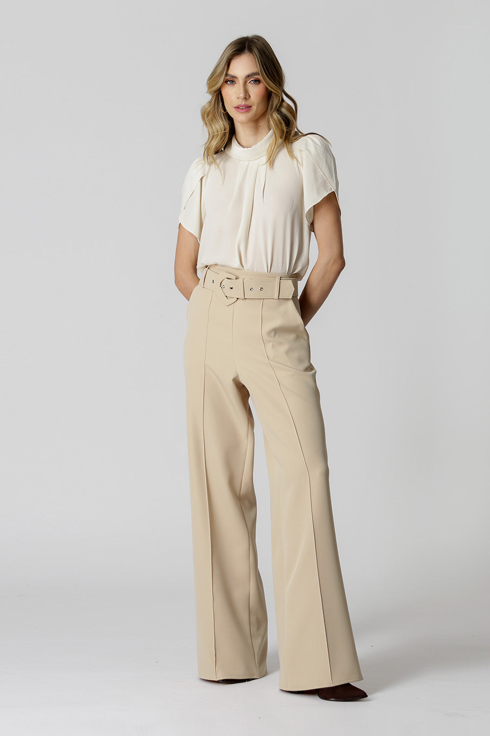Blusa de cuello alto con pliegues. Pieza confeccionada en tejido crepe fluido. Un modelo suelto, elegante y cómodo para un ambiente laboral.
