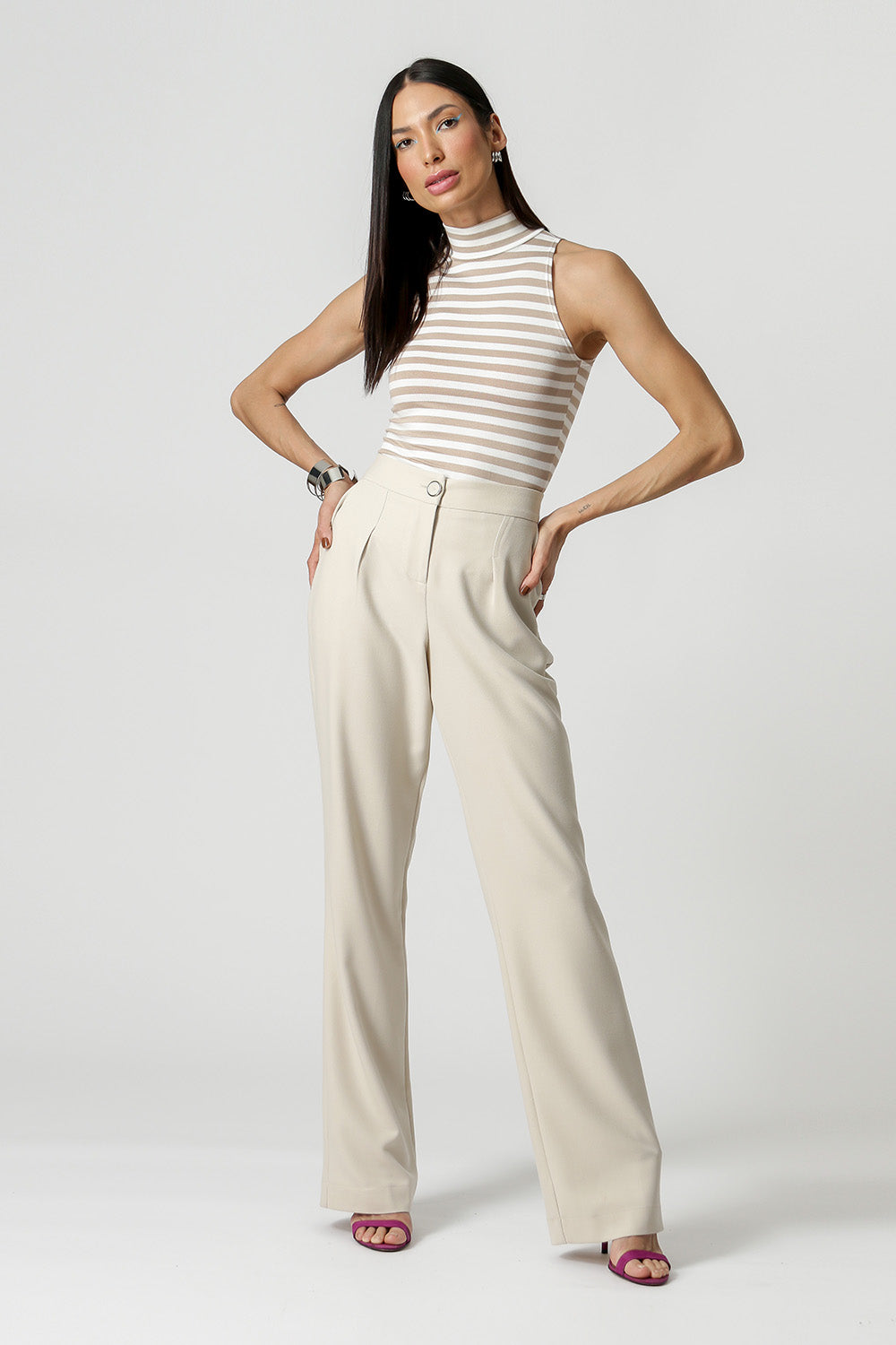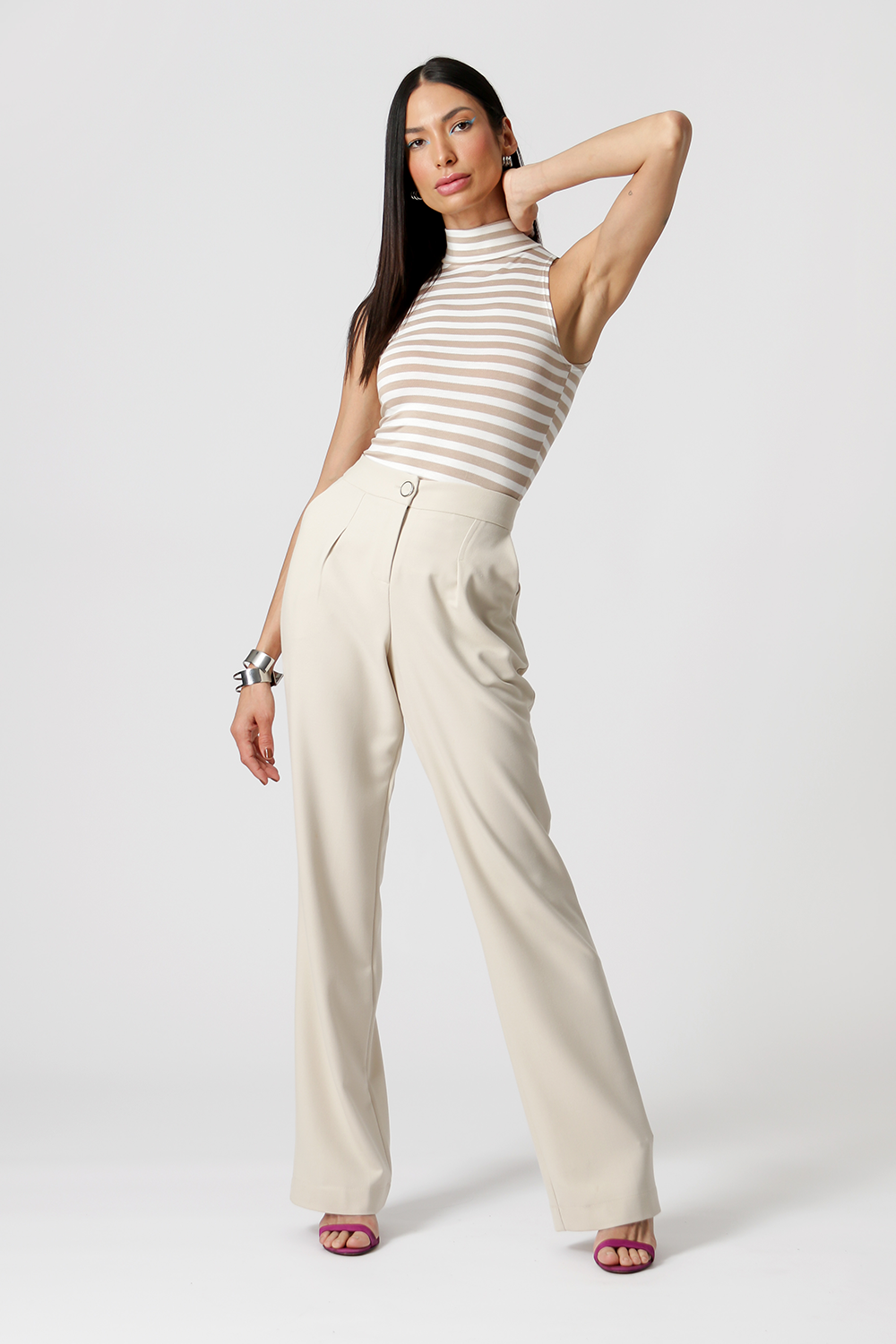Blusa de cuello alto a rayas - BEIGE 90142