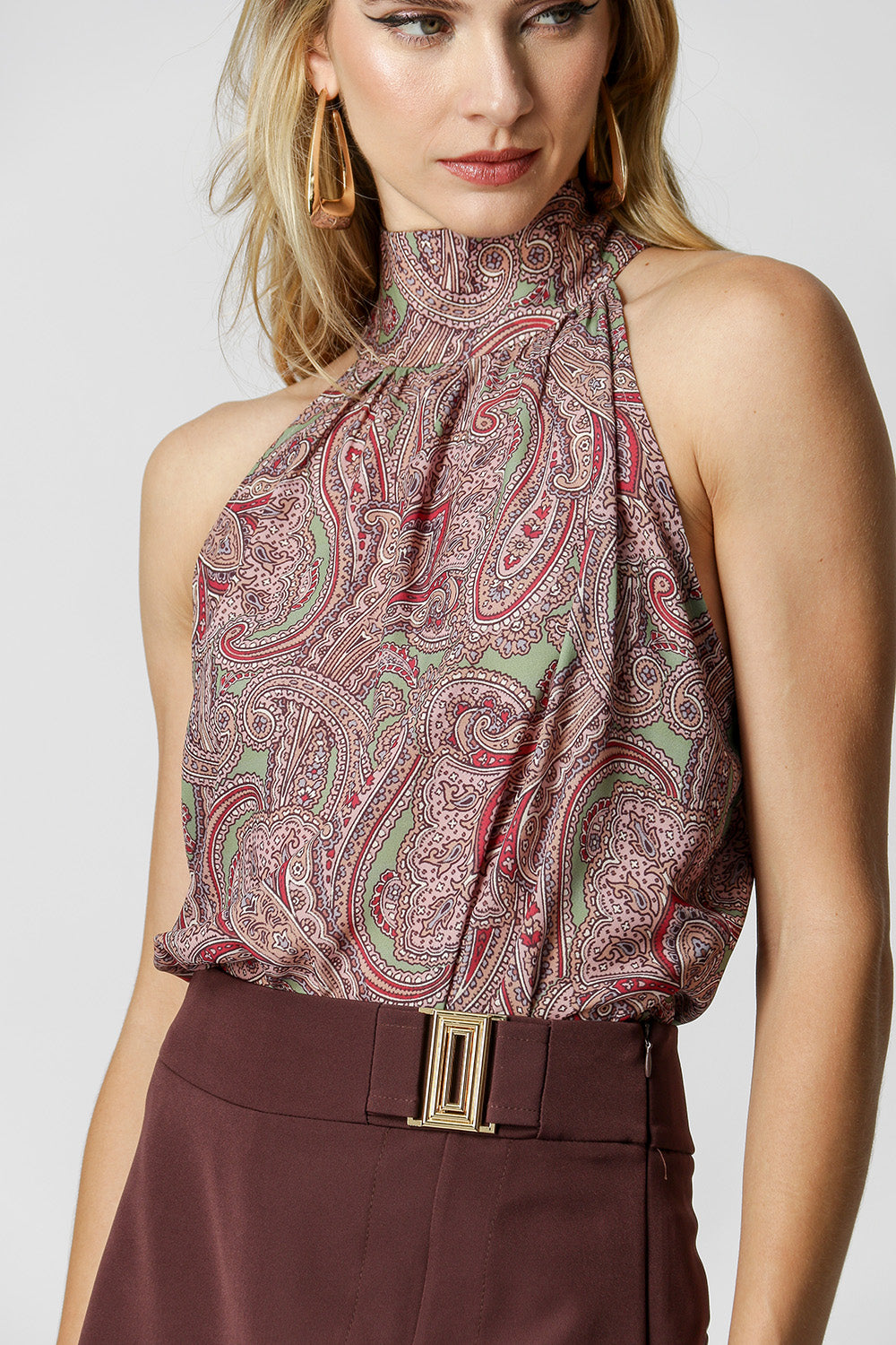 Camiseta de tirantes estilo americano, confeccionada en crepe fluido estampado. Tiene detalle de cuello con lazo y espalda abierta. ¡Pieza elegante, ideal para ocasiones especiales!