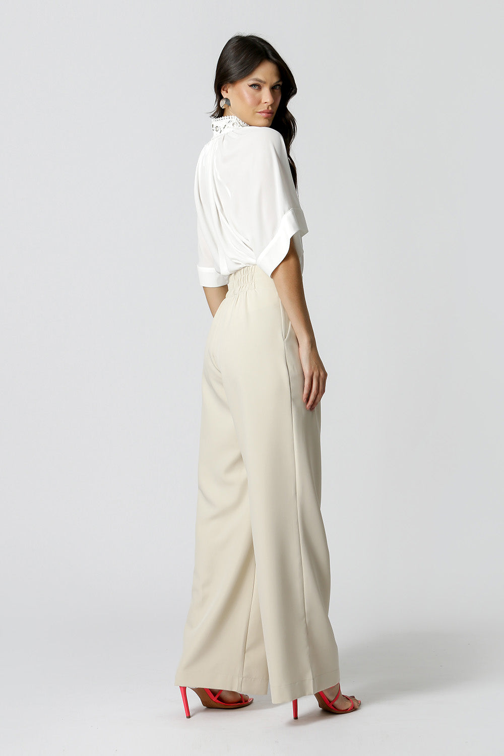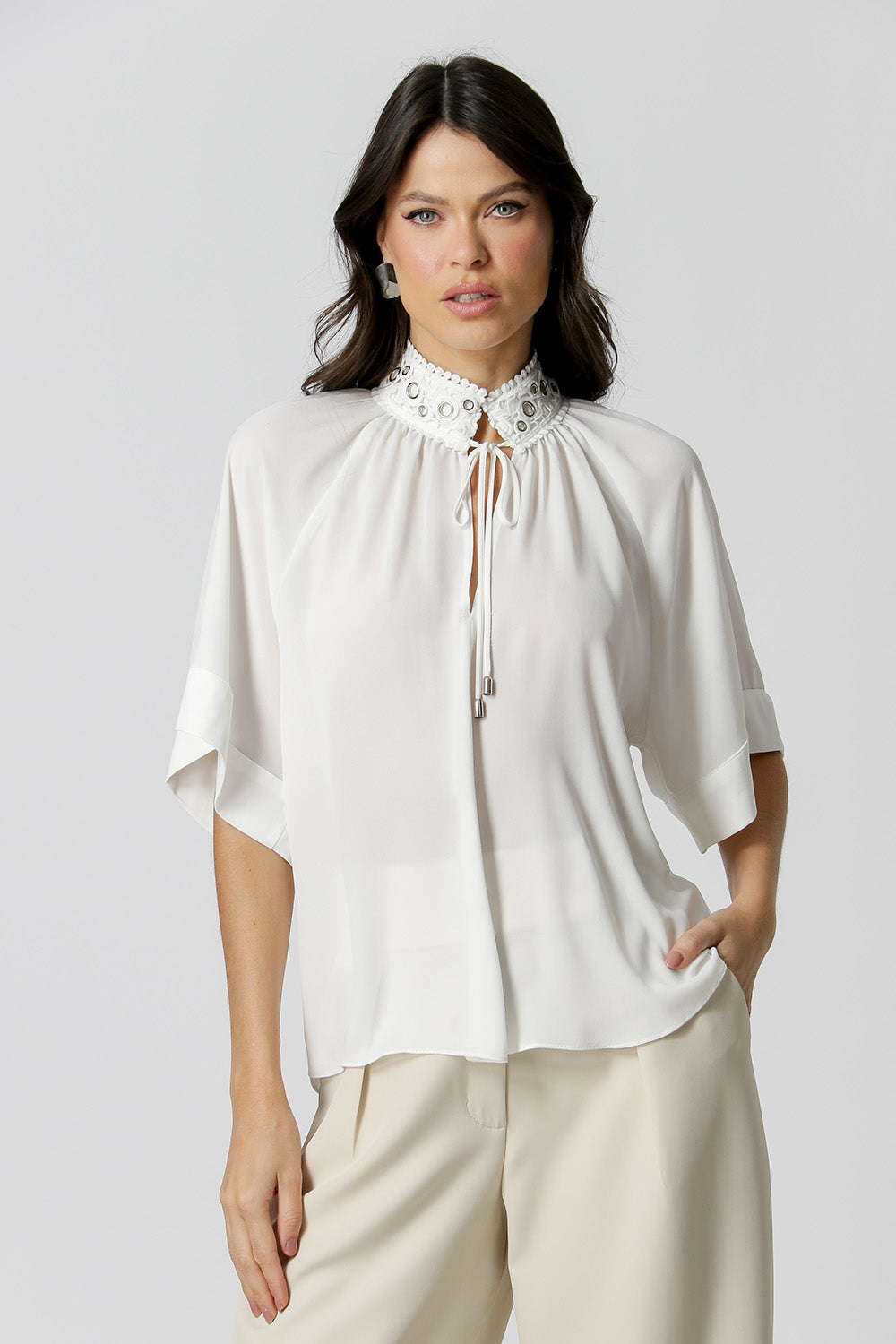 Blusa confeccionada en crepe, con mangas de ángel y cuello bordado. Una pieza de corte ligero y holgado, con un detalle único.