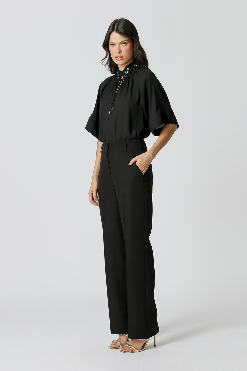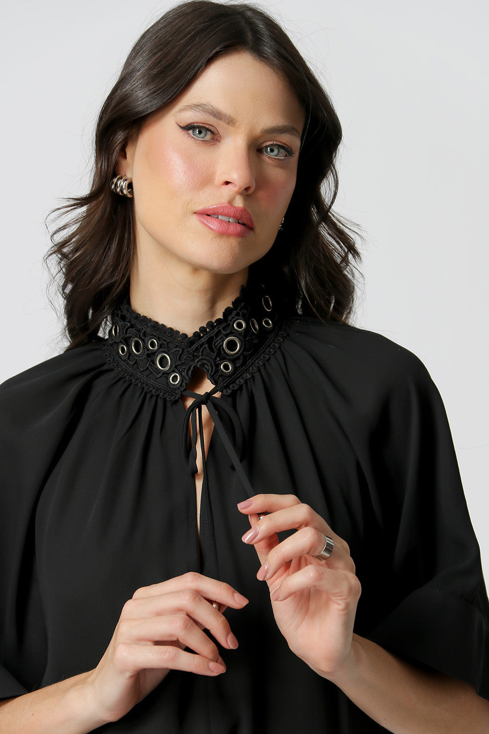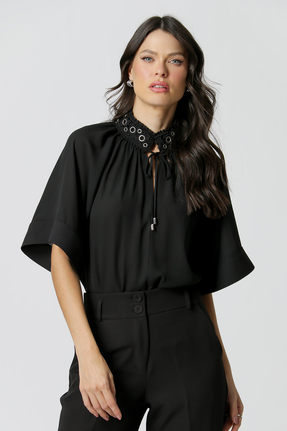 Blusa confeccionada en crepe, con mangas de ángel y cuello bordado. Una pieza de corte ligero y holgado, con un detalle único.