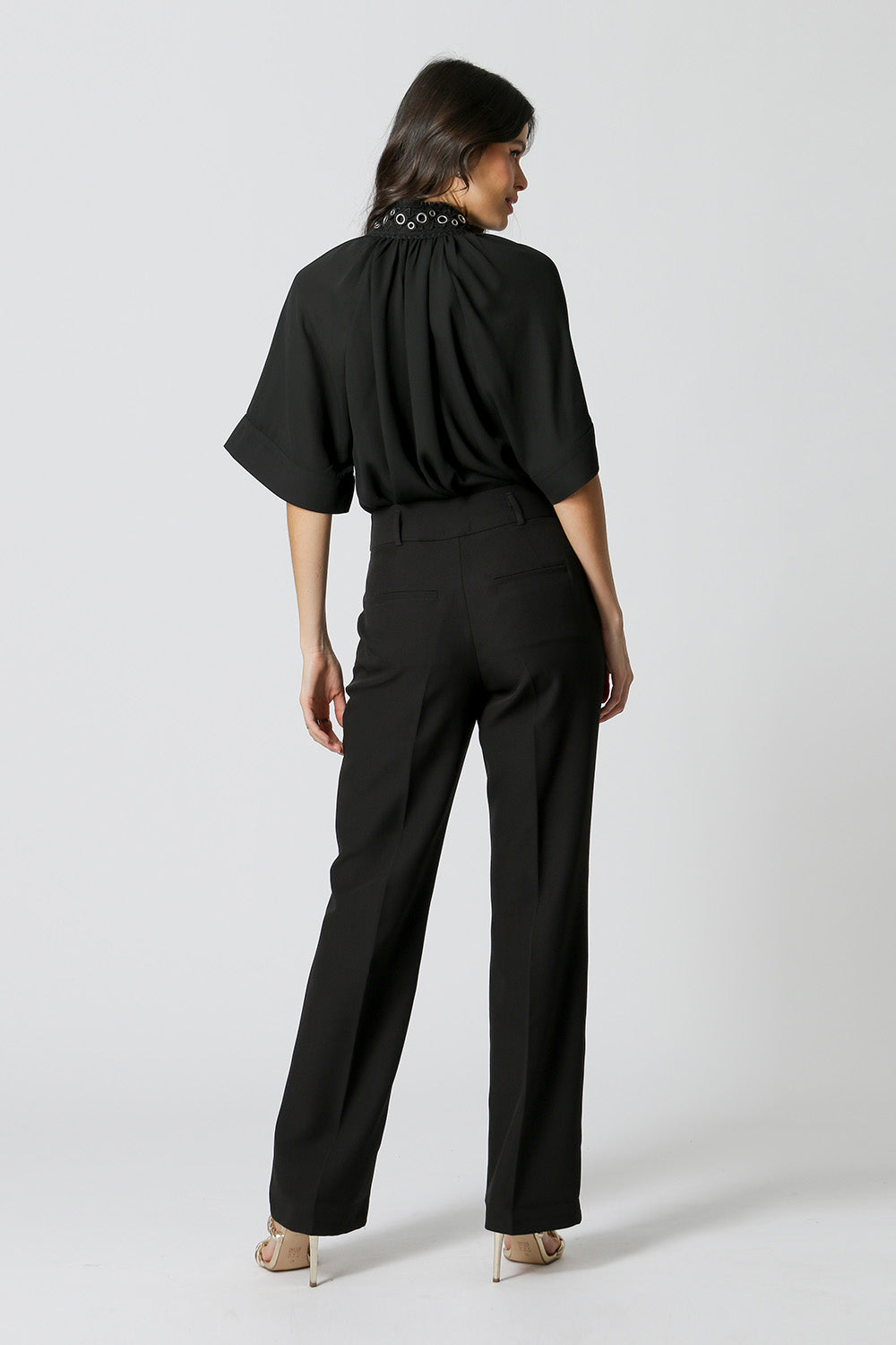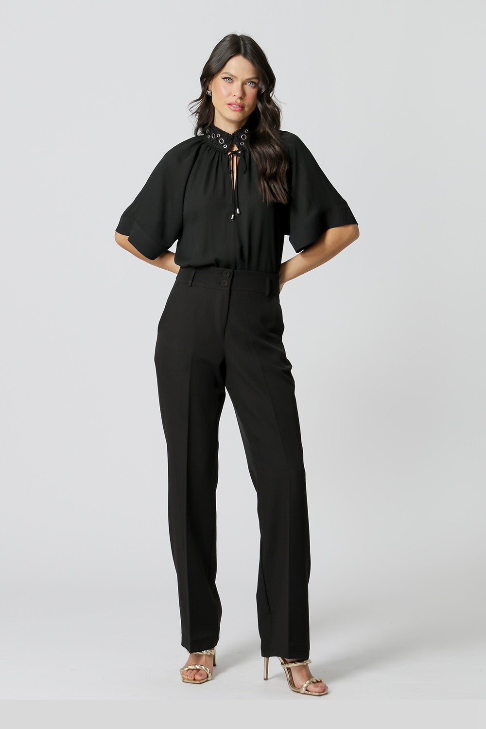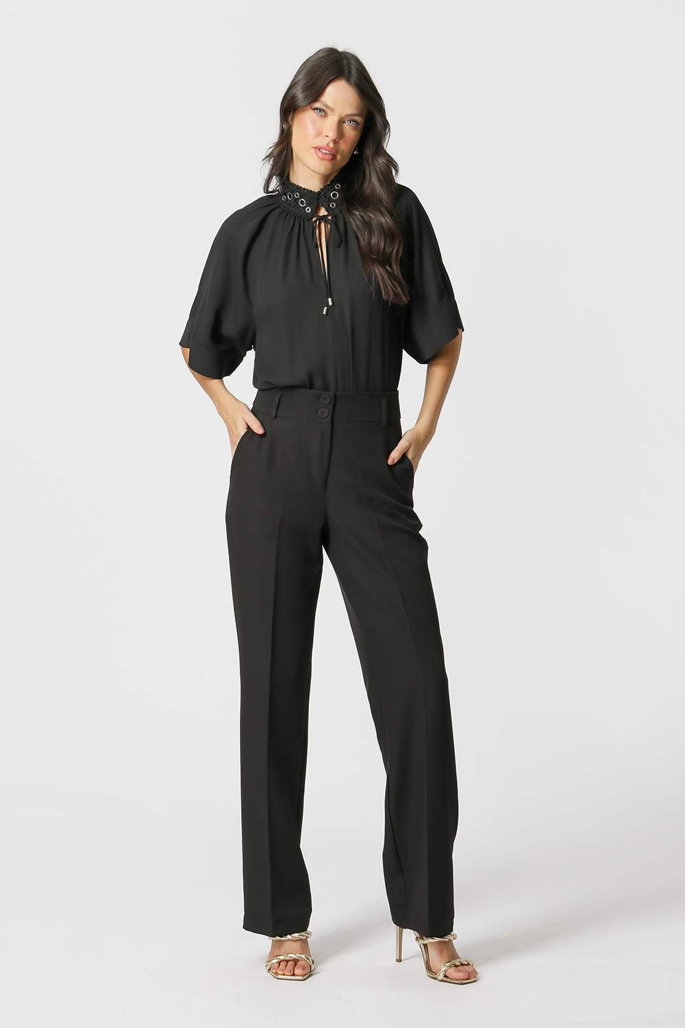 Blusa confeccionada en crepe, con mangas de ángel y cuello bordado. Una pieza de corte ligero y holgado, con un detalle único.