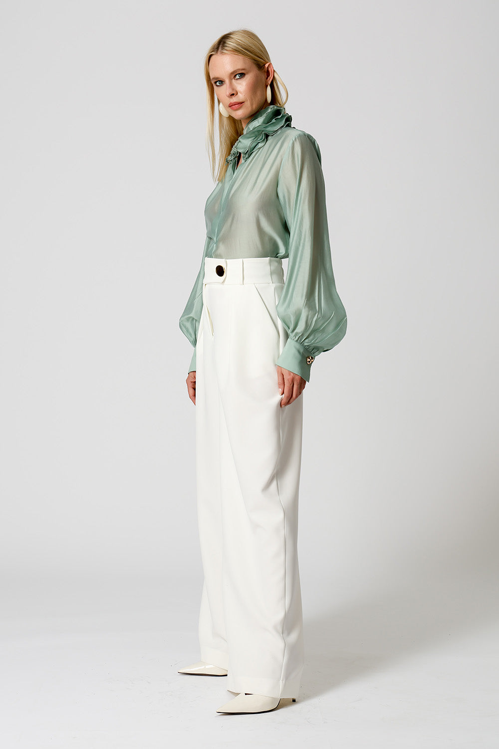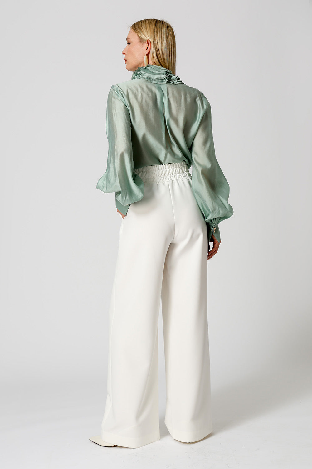 Delicada e sofisticada, esta blusa de manga longa com gola ruff é confeccionada em voil de liocel, garantindo leveza, frescor e caimento suave. Ideal para compor looks elegantes e femininos.
