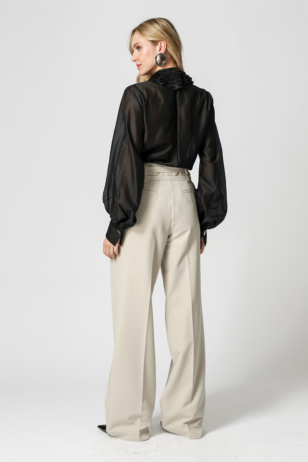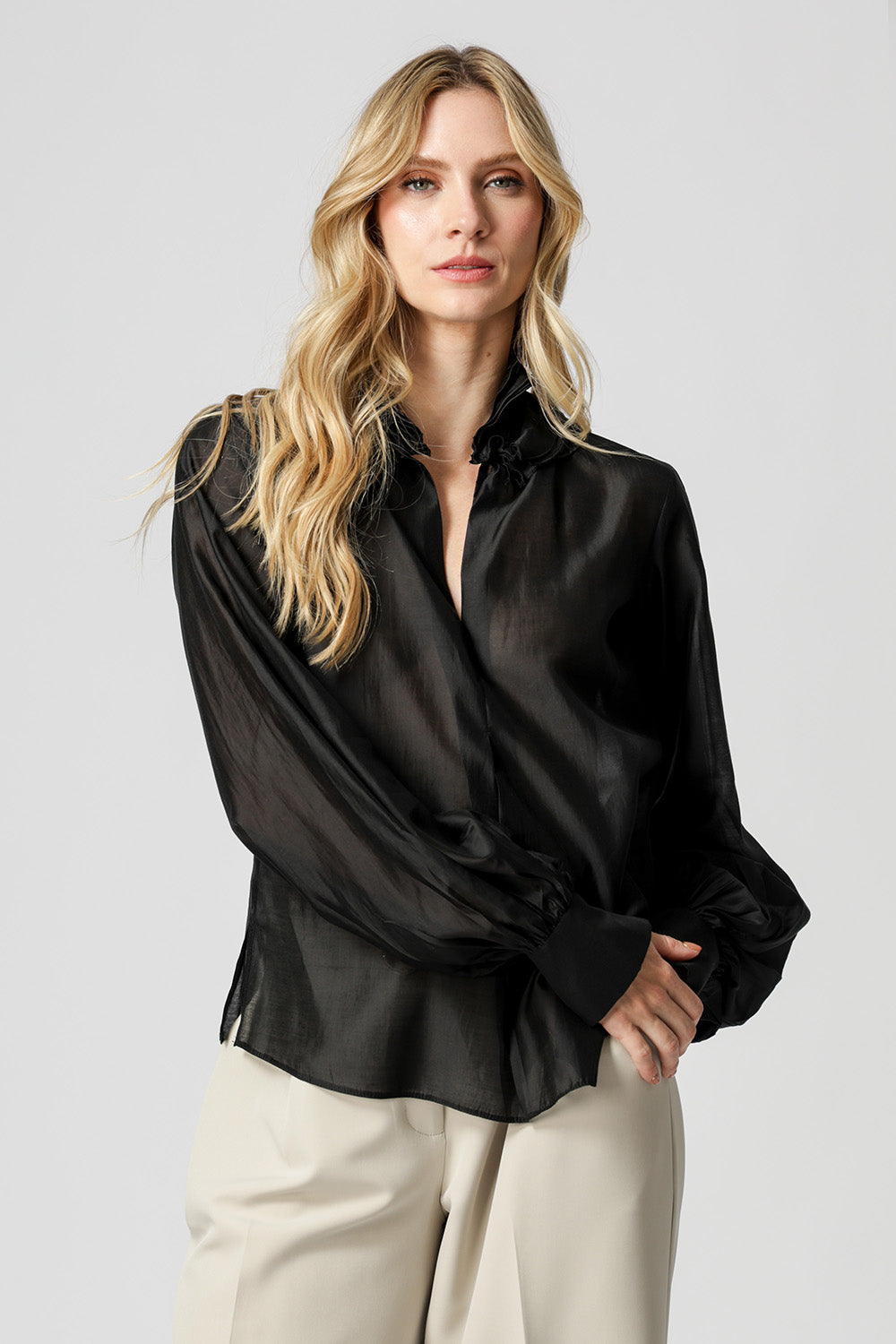 Delicada e sofisticada, esta blusa de manga longa com gola ruff é confeccionada em voil de liocel, garantindo leveza, frescor e caimento suave. Ideal para compor looks elegantes e femininos.