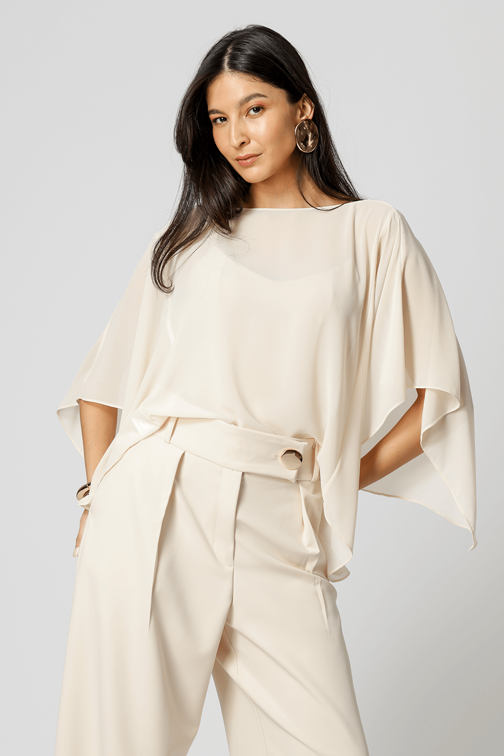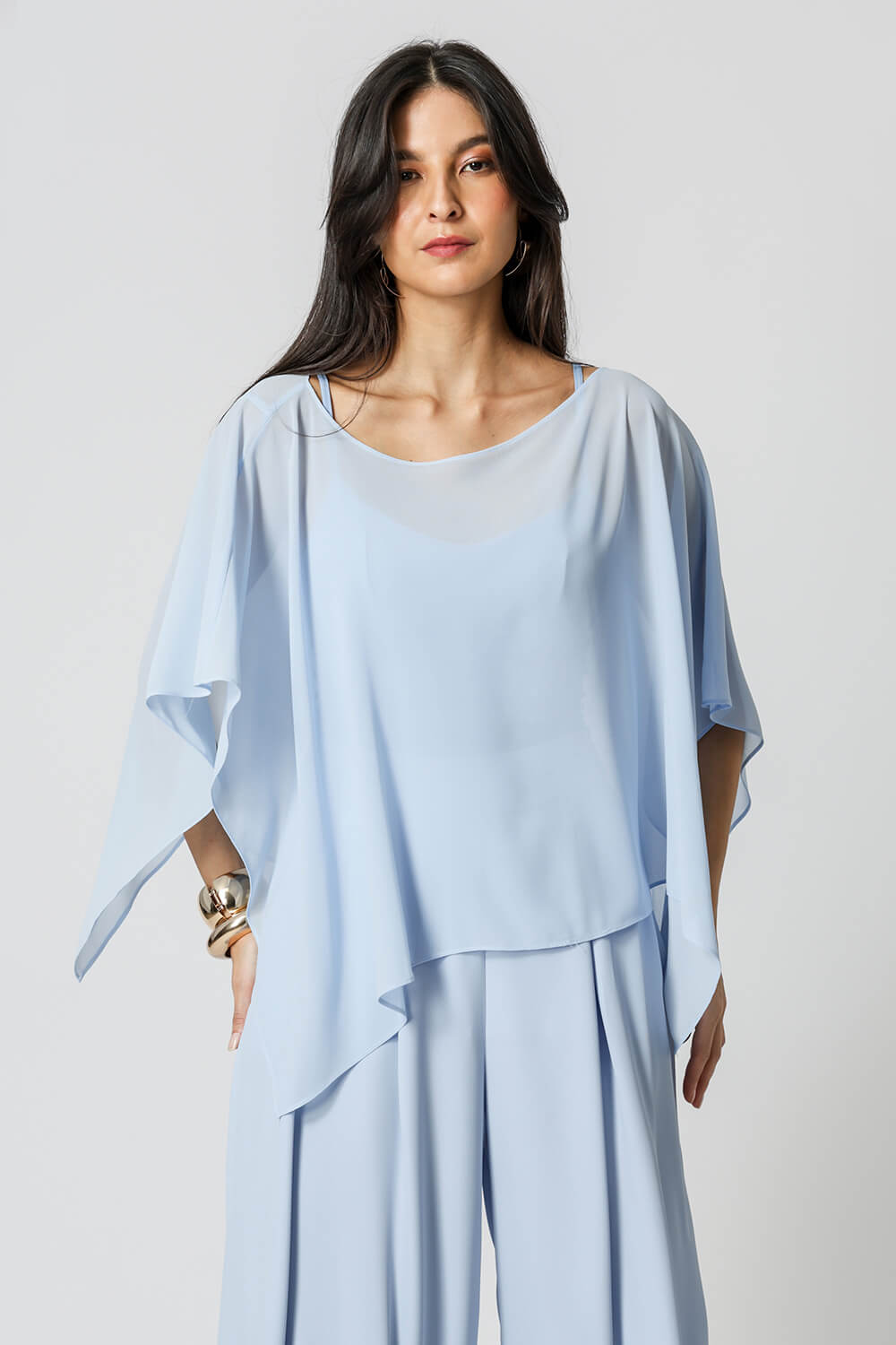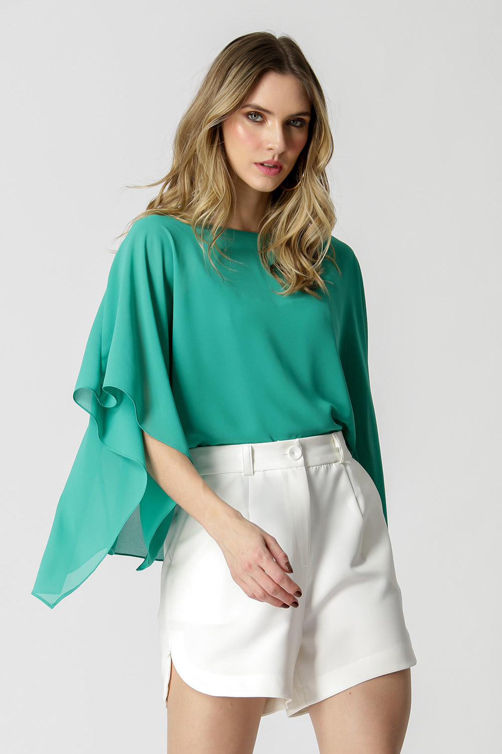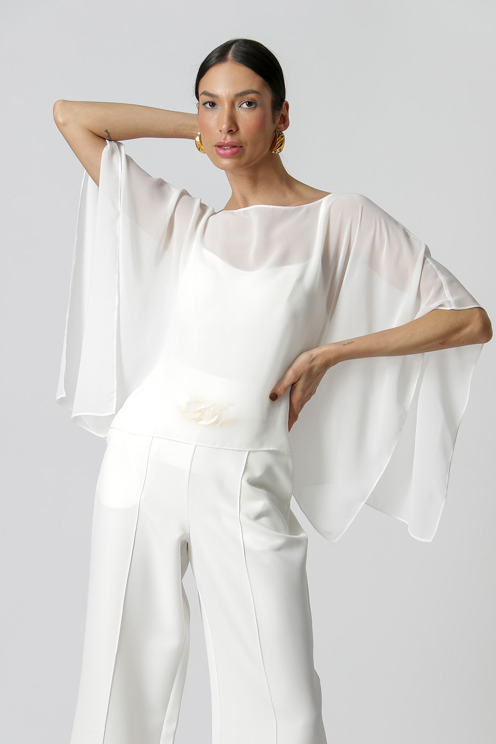 Blusa kaftan confeccionada em tecido crepe fluído. Peça com leve transparência e modelagem soltinha. Vem acompanhada com uma regata de bojo e alças ajustáveis da mesma cor para usar por baixo da blusa.