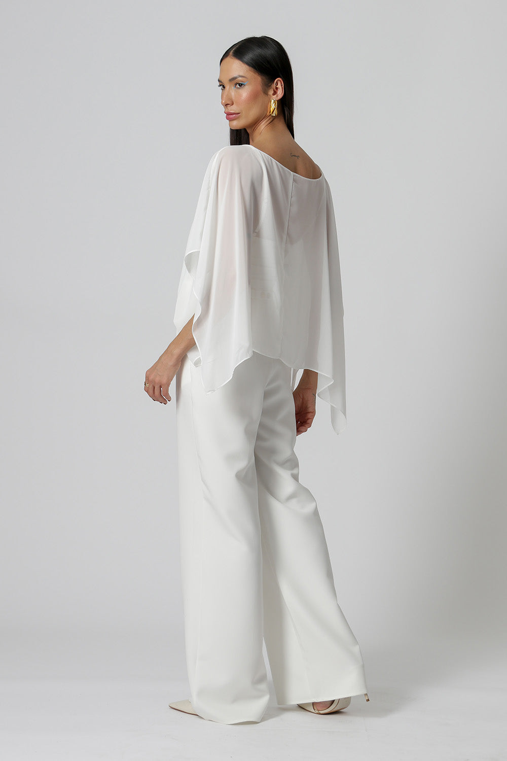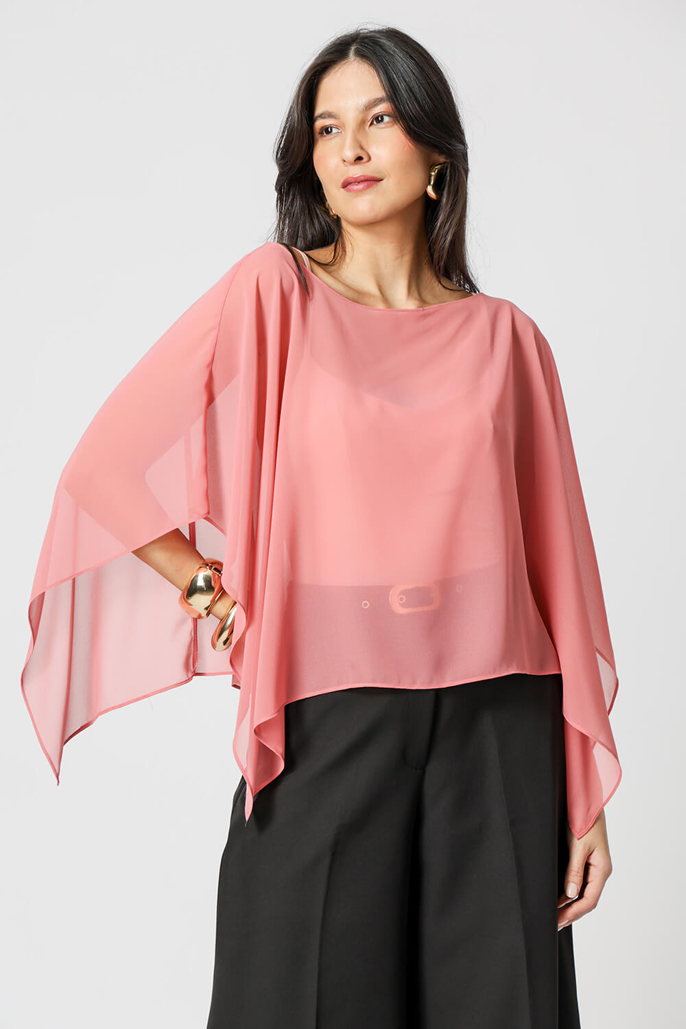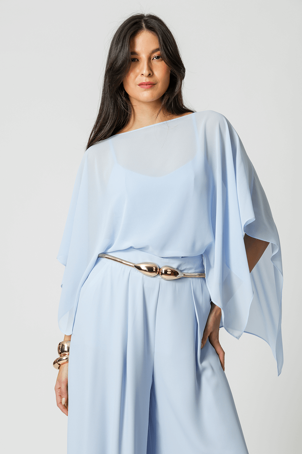 Blusa kaftan confeccionada em tecido crepe fluído. Peça com leve transparência e modelagem soltinha. Vem acompanhada com uma regata de bojo e alças ajustáveis da mesma cor para usar por baixo da blusa.
