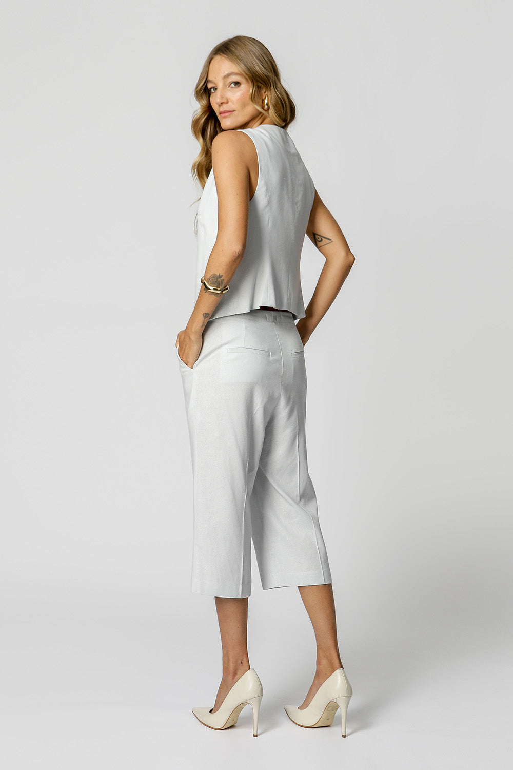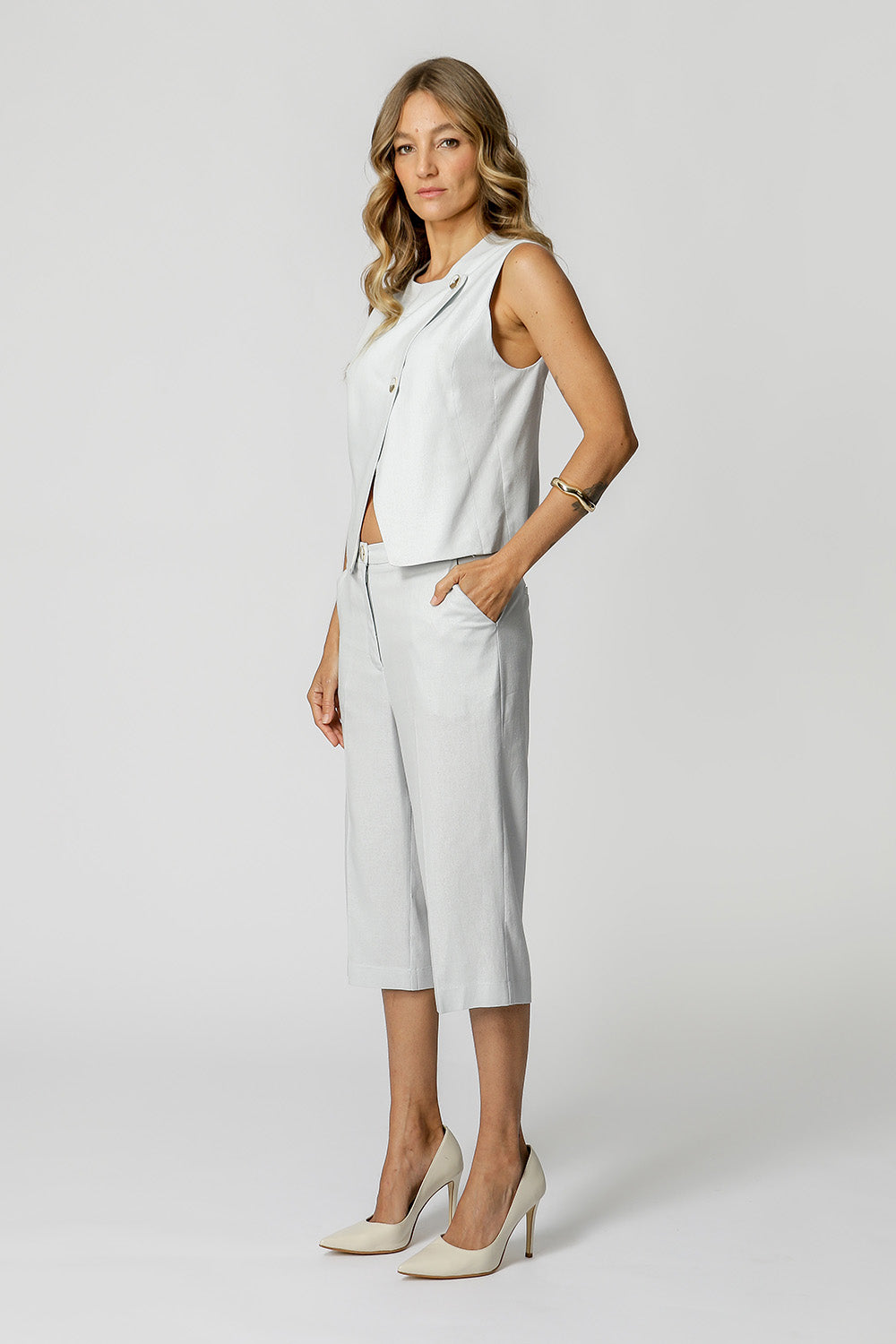 Blusa de lino con cruzado frontal y botones distintivos. Pieza moderna con información de moda.