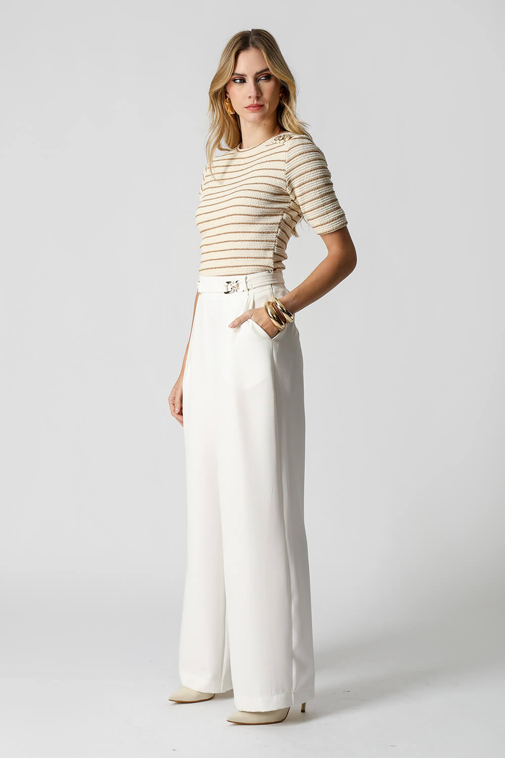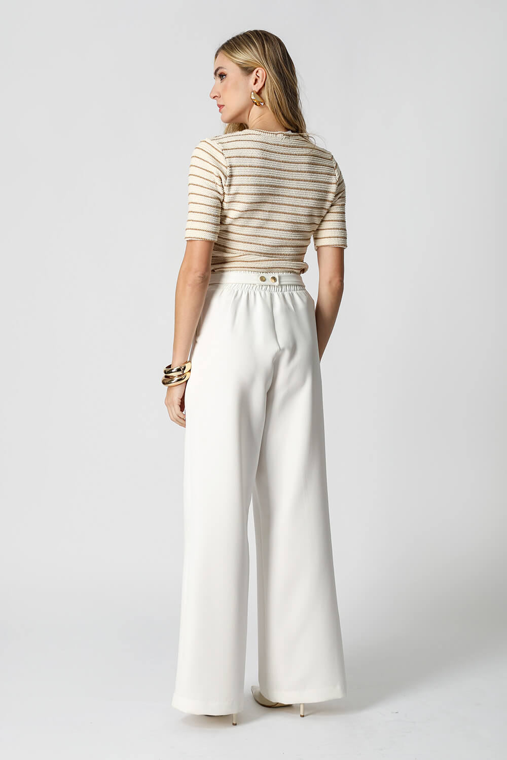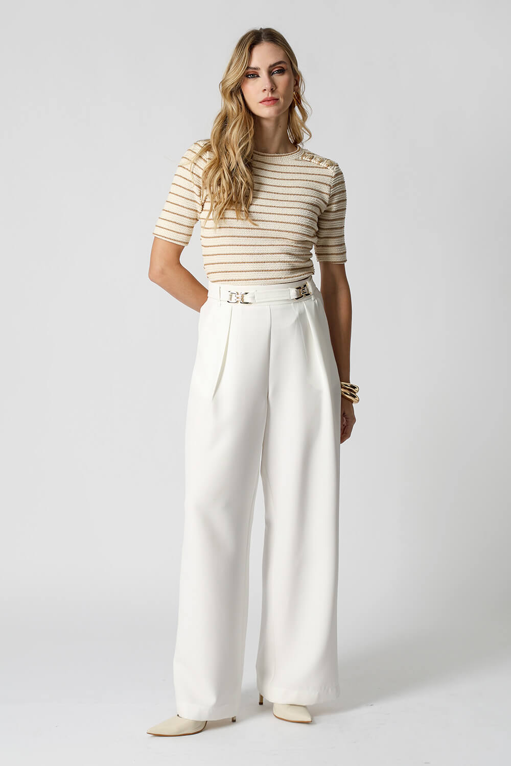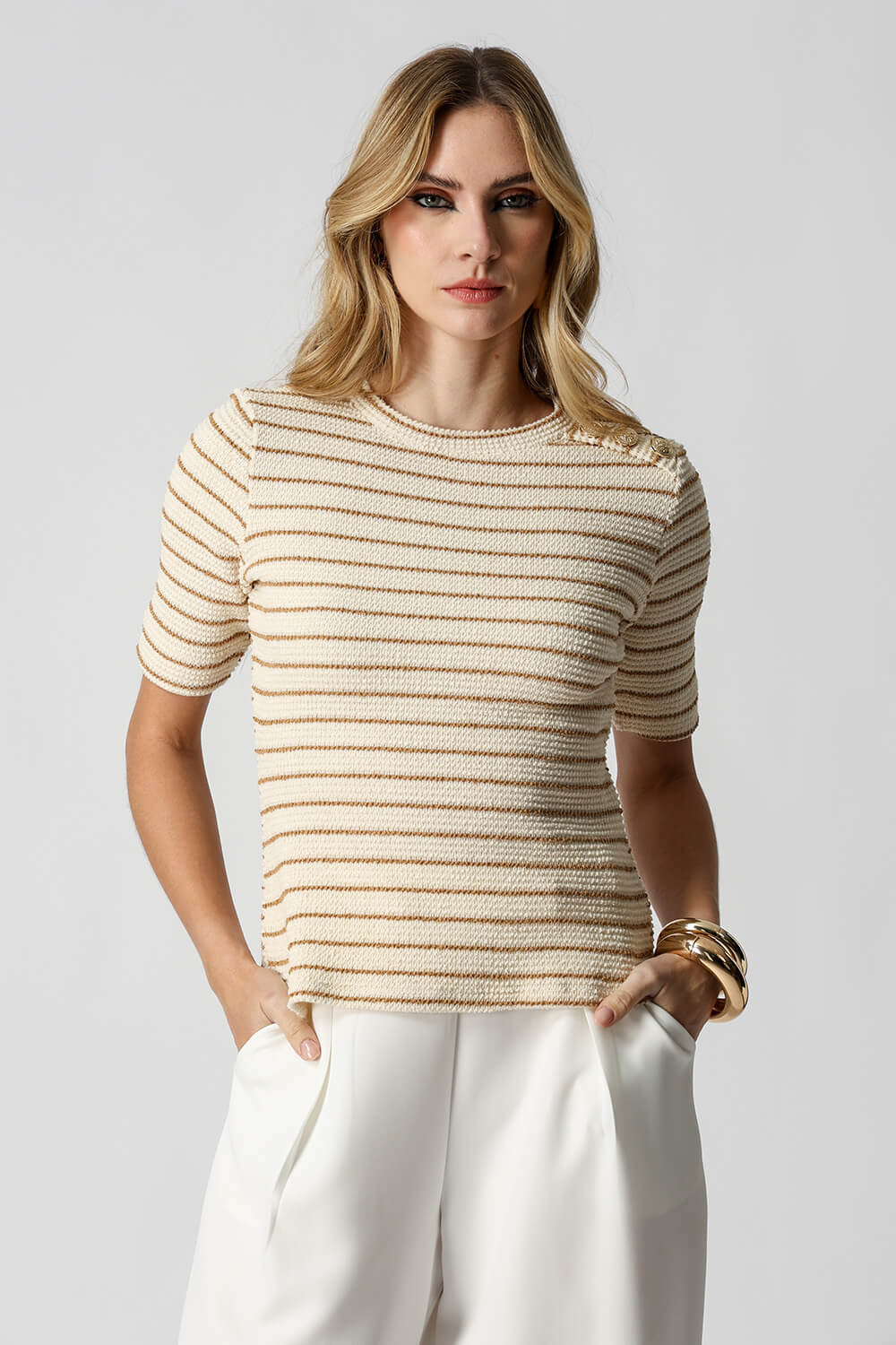Blusa com visual marcante e elegante, destacada pelas listras verticais, que trazem um efeito alongador e moderno. O charme fica por conta da pala no ombro, adornada com três botões de brasão, que adicionam um toque sofisticado e refinado à peça. Ideal para elevar produções casuais com estilo.