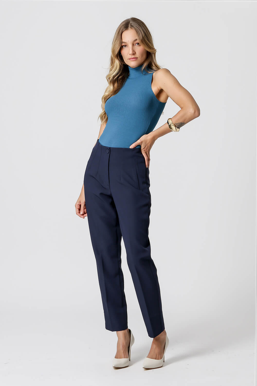Blusa de punto de viscosa acanalada con sisa americana y cuello alto. Pieza básica, perfecta para trabajar con looks de capas.
