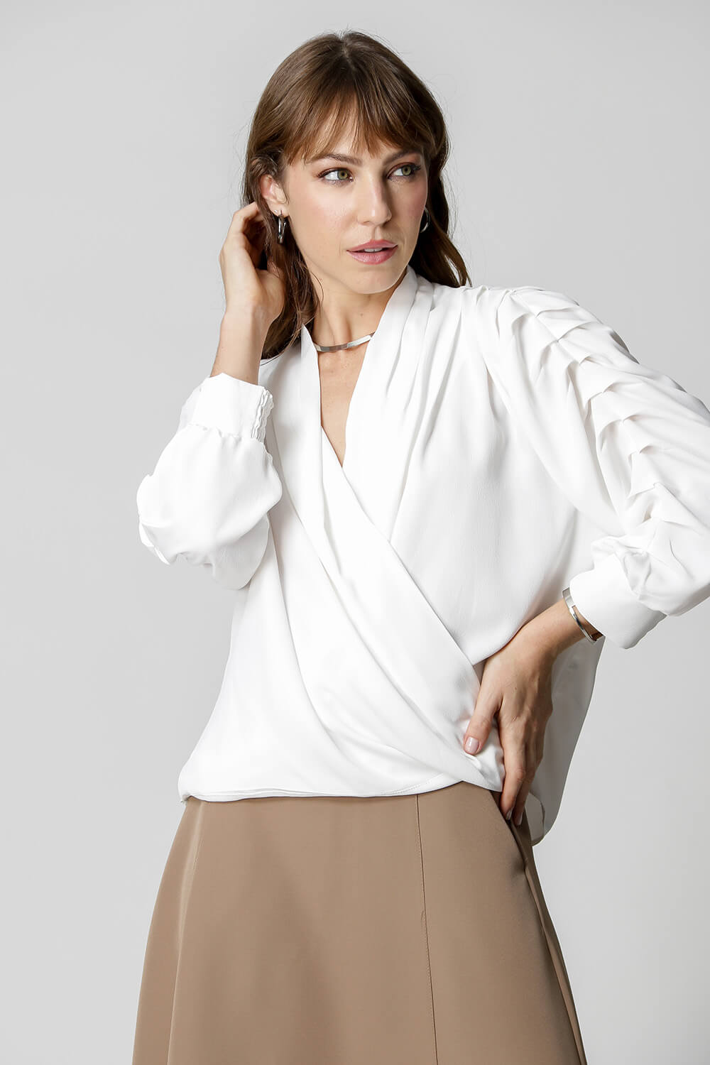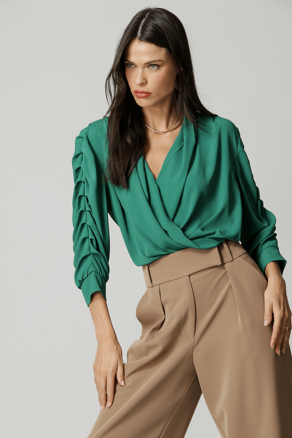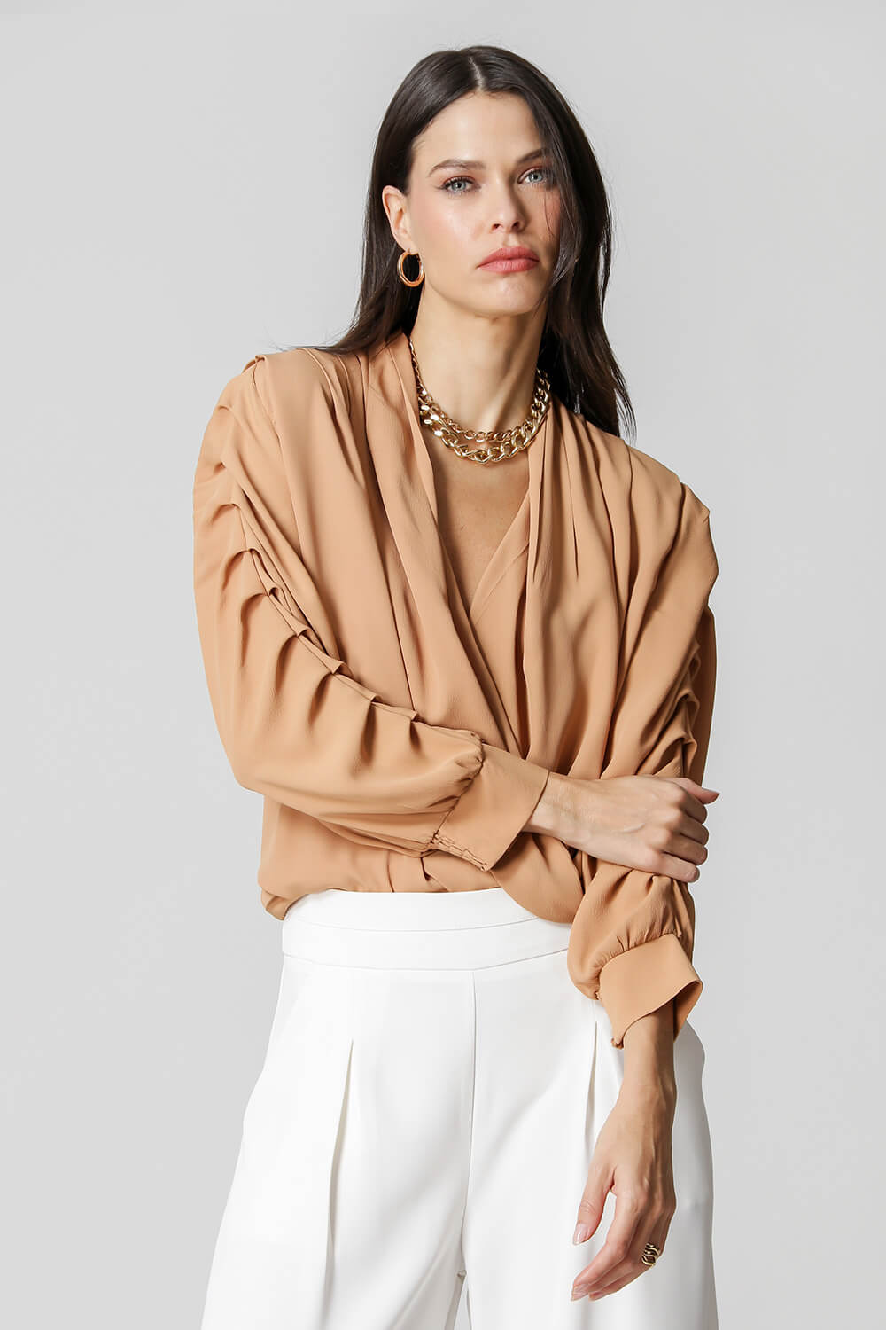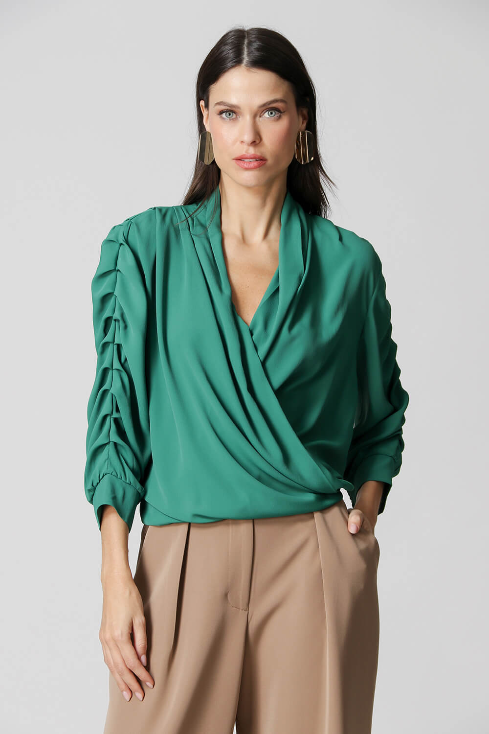 Blusa manga 3/4 com pregas, transpasse no decote e detalhe de lastex no punho. Um modelo confeccionado em tecido leve fluído. Peça soltinha, leve e bem elegante para mood casual diferenciado.