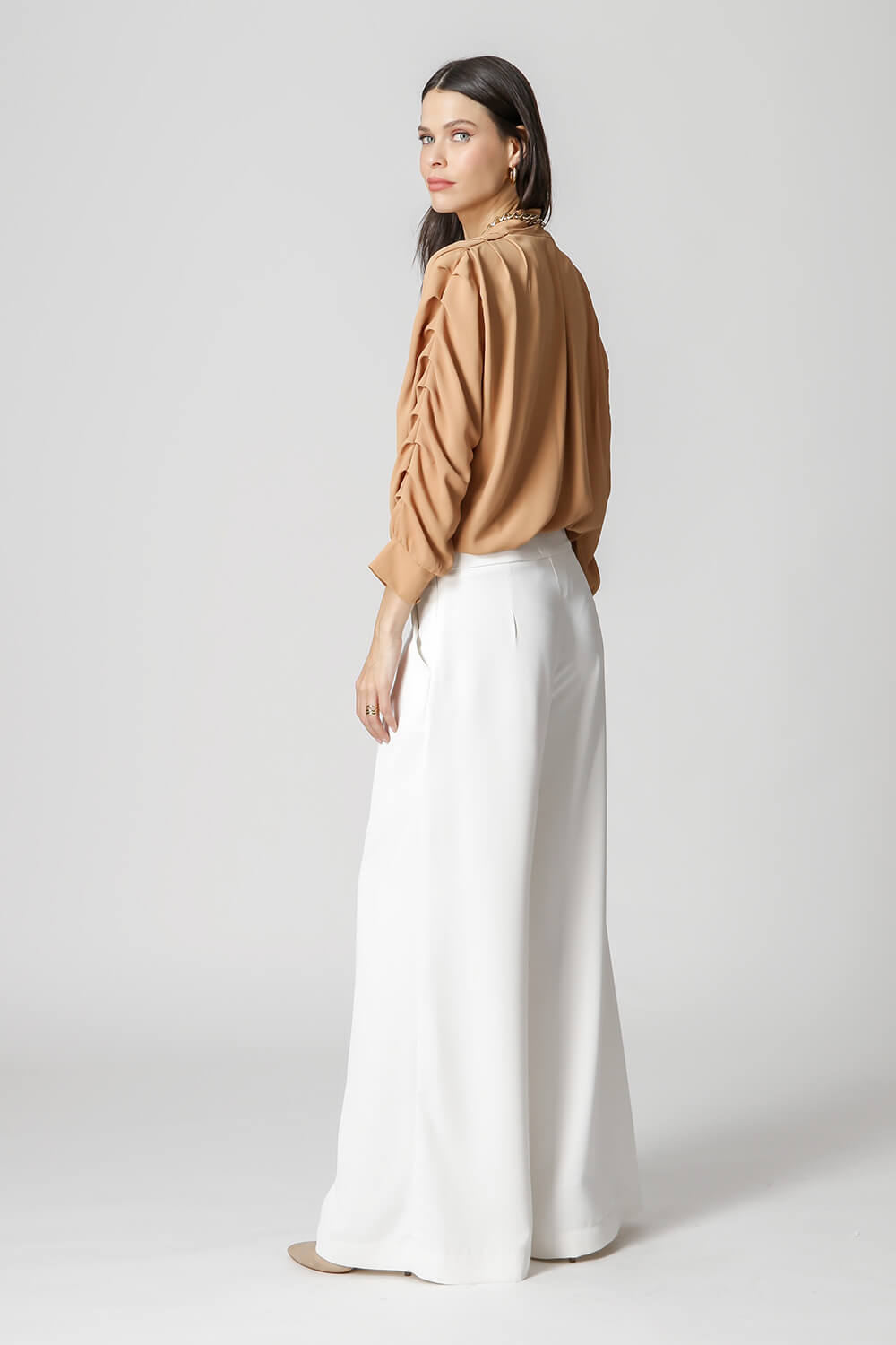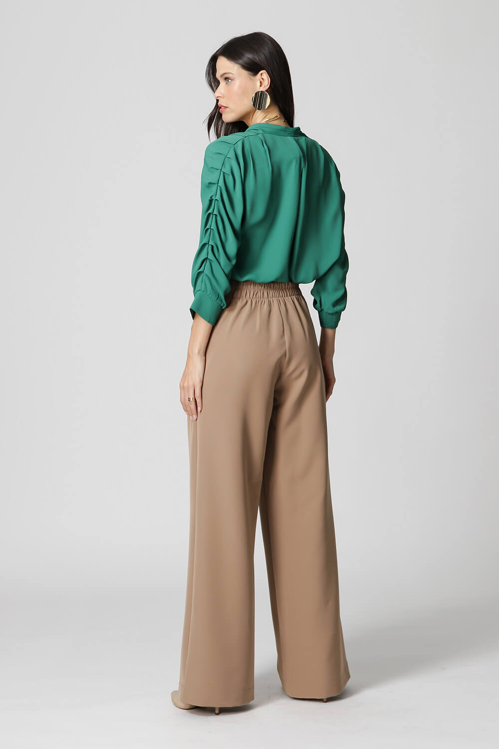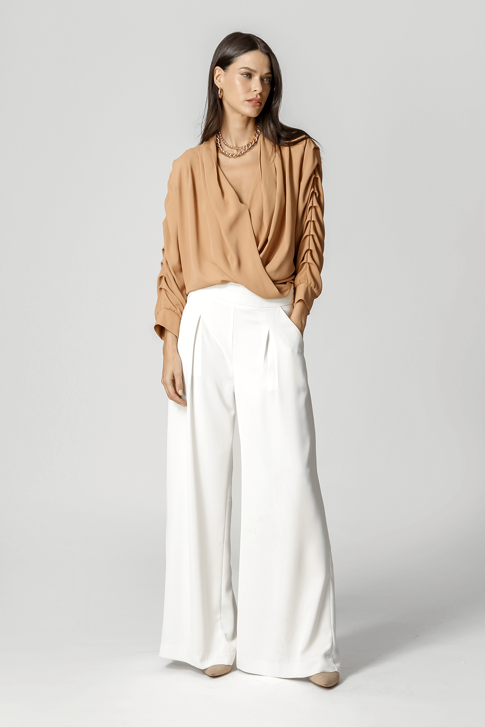 Blusa manga 3/4 com pregas, transpasse no decote e detalhe de lastex no punho. Um modelo confeccionado em tecido leve fluído. Peça soltinha, leve e bem elegante para mood casual diferenciado.