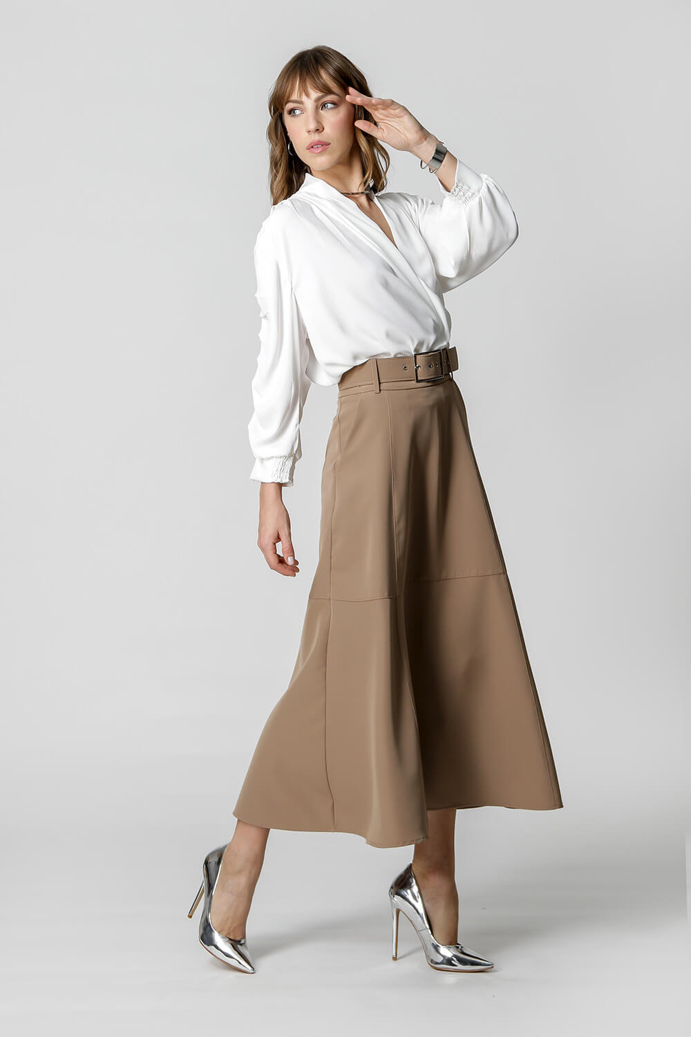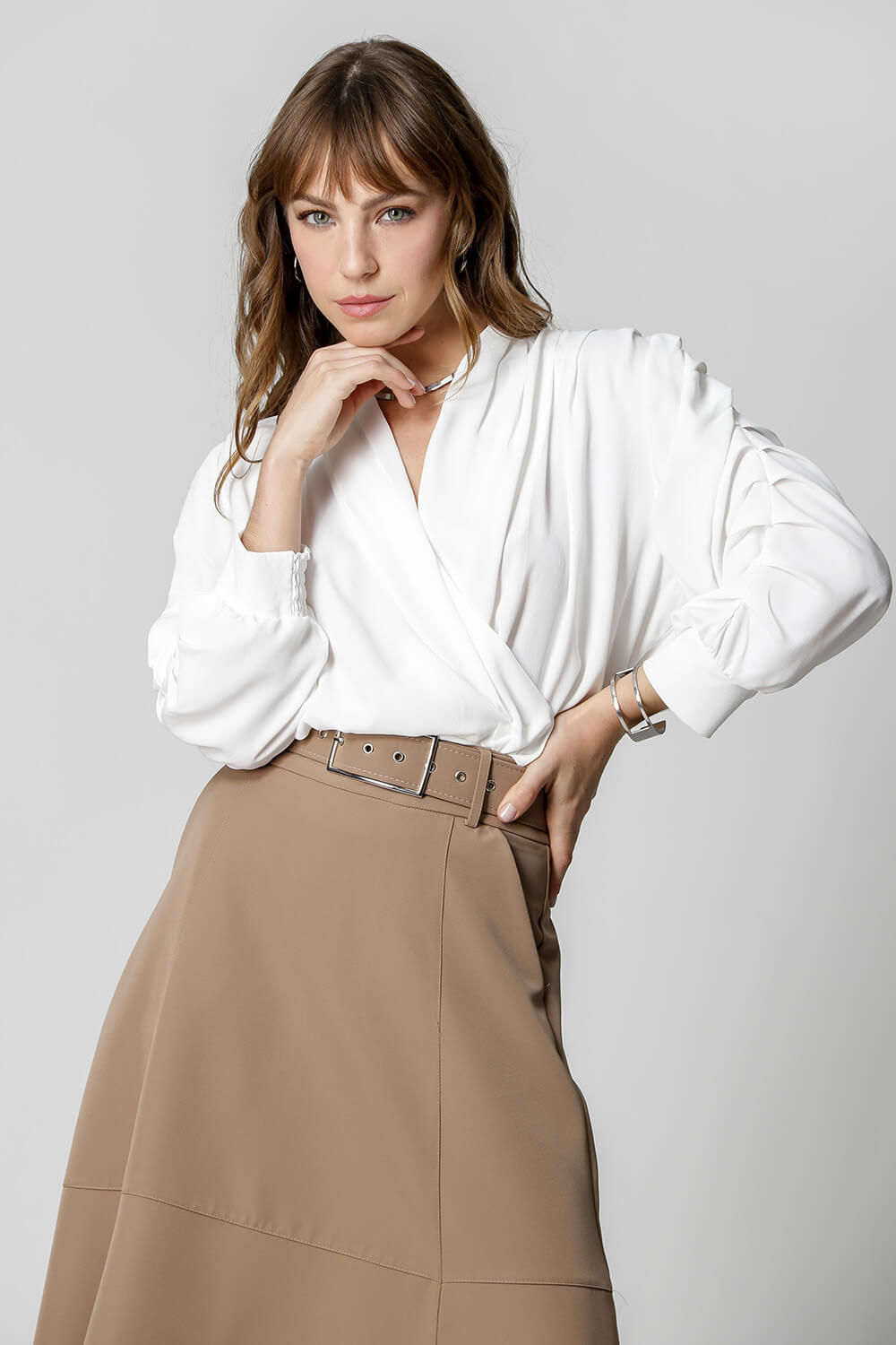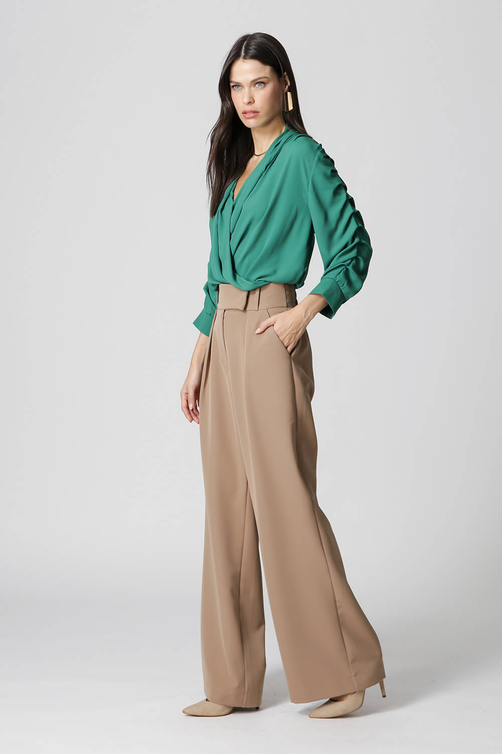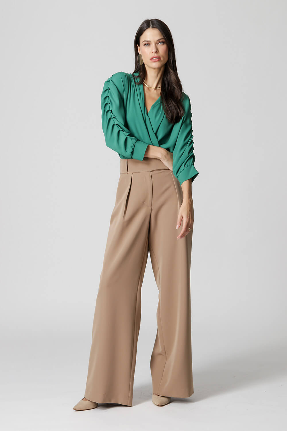 Blusa manga 3/4 com pregas, transpasse no decote e detalhe de lastex no punho. Um modelo confeccionado em tecido leve fluído. Peça soltinha, leve e bem elegante para mood casual diferenciado.