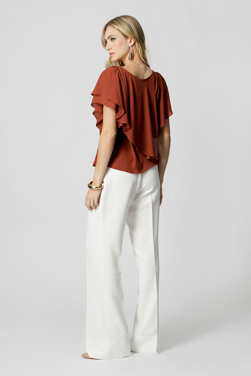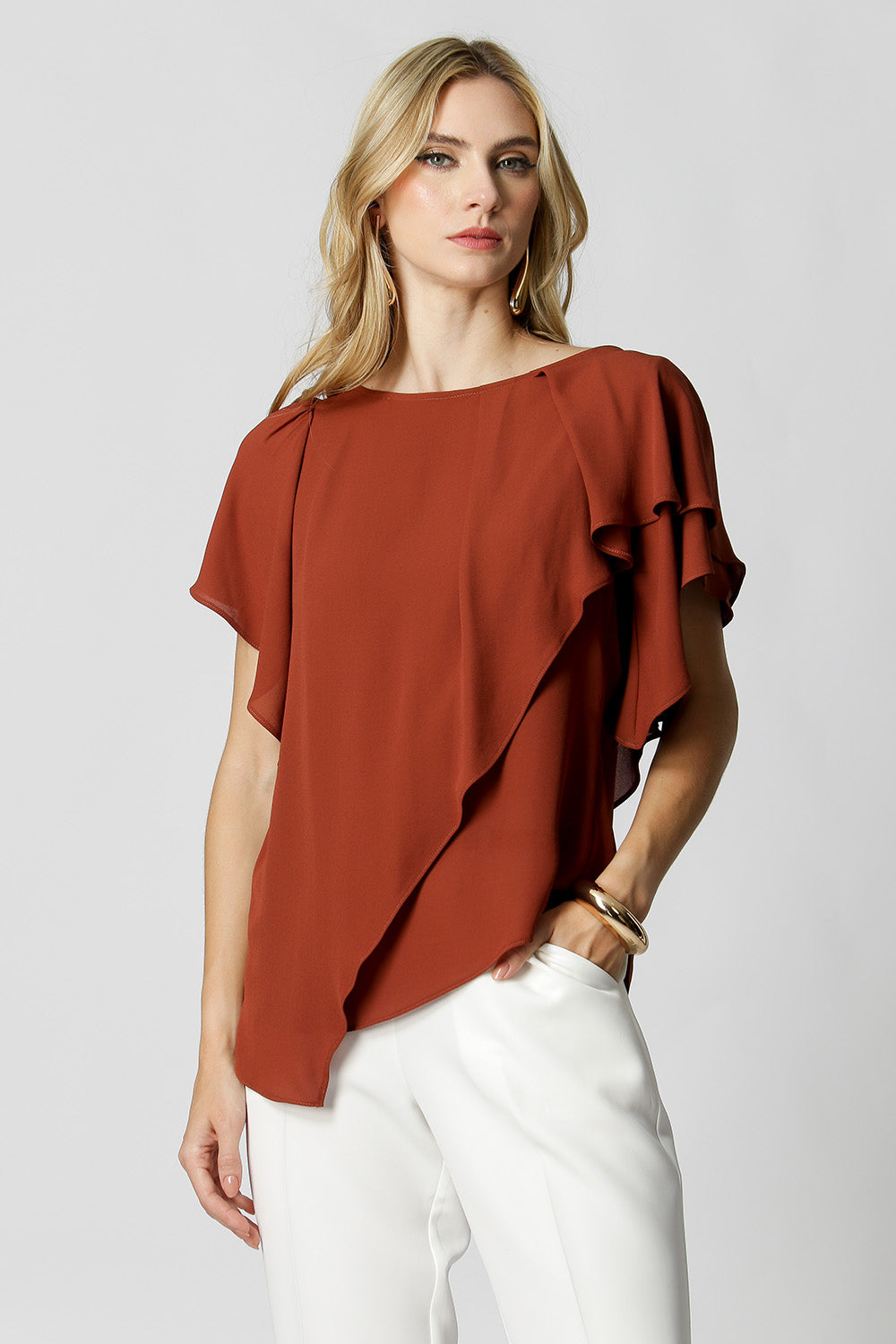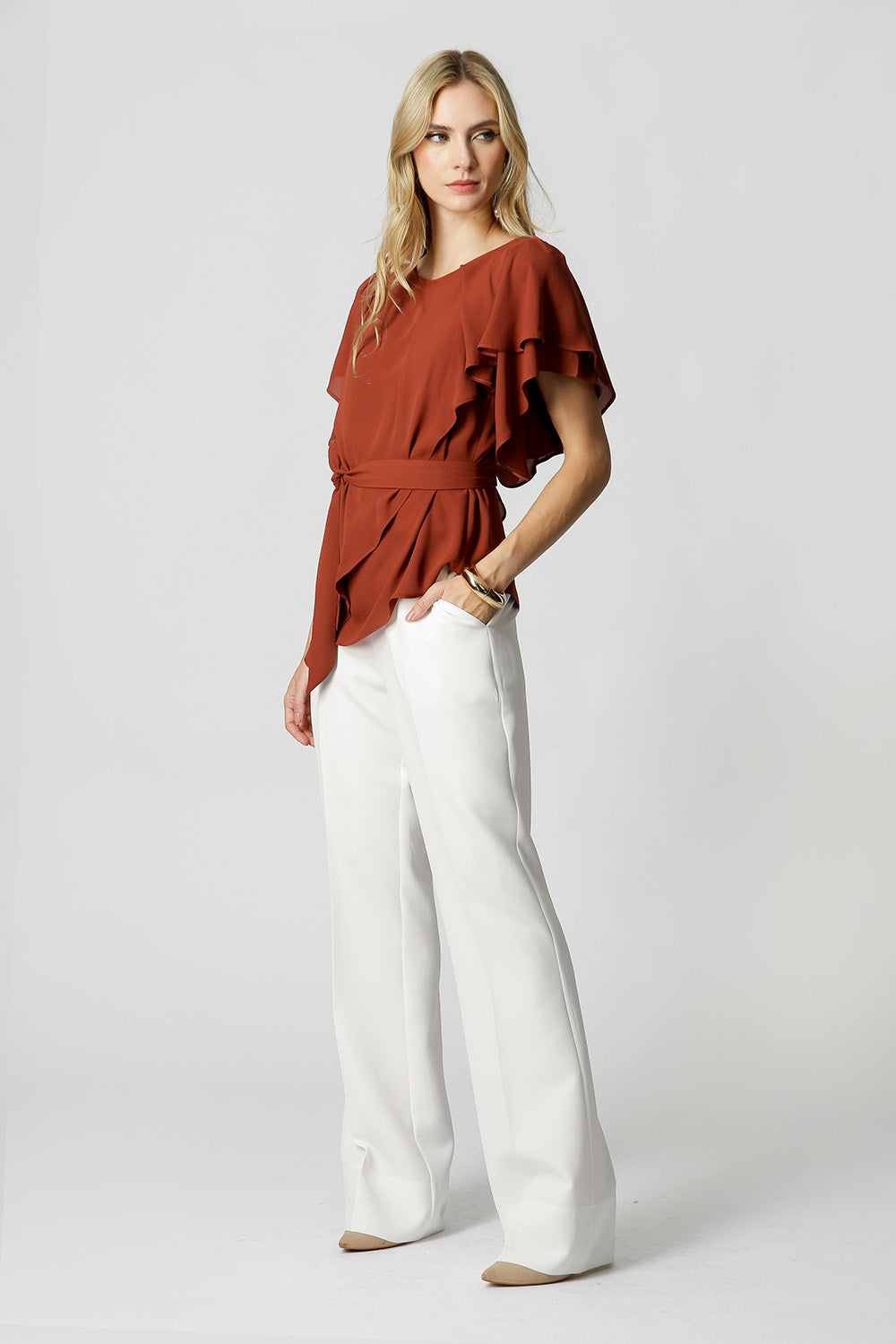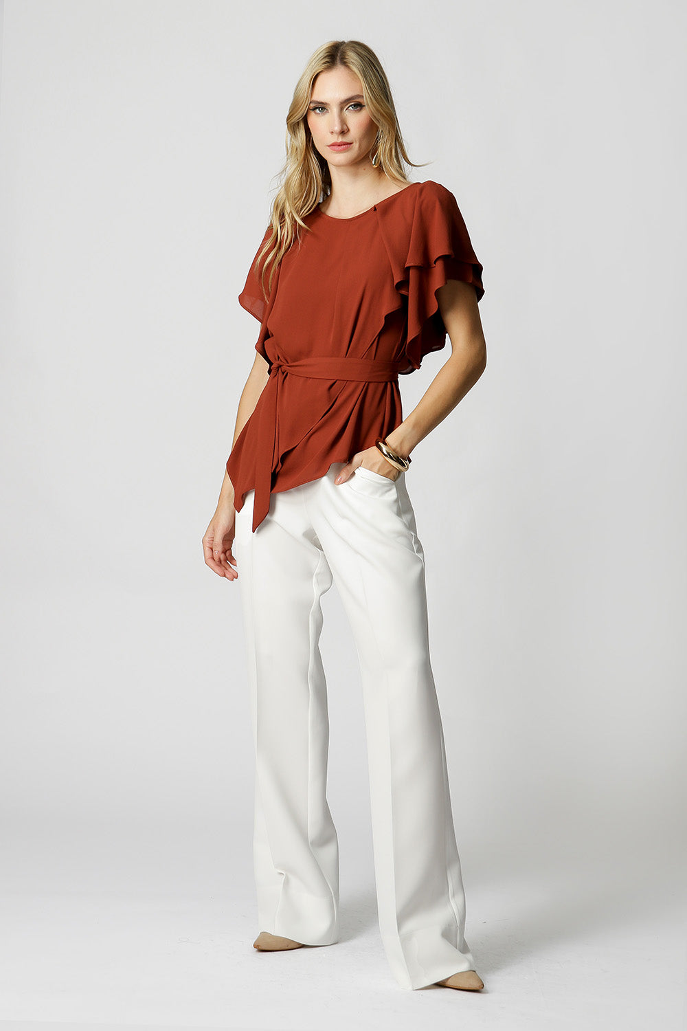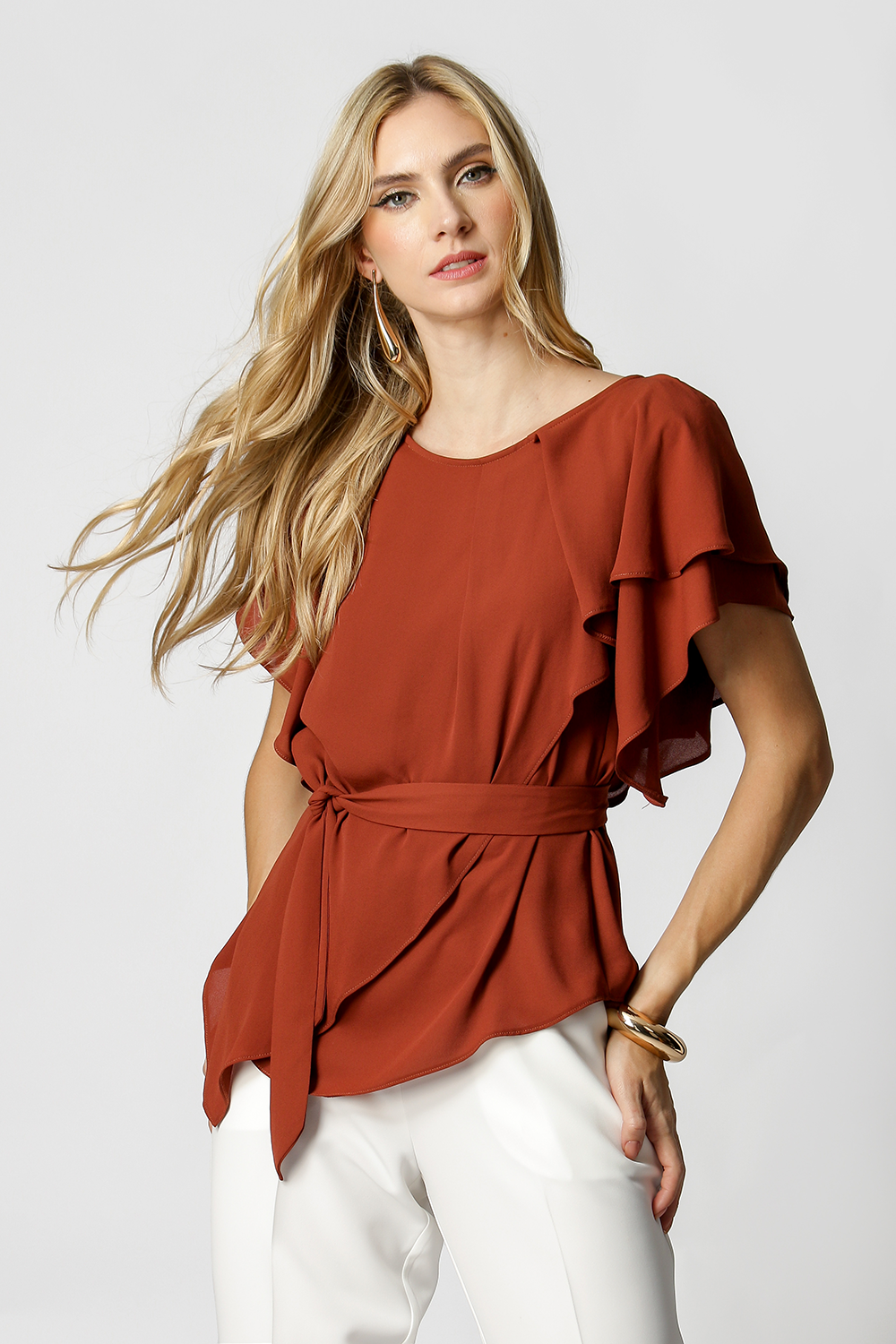 Blusa asimétrica con mangas de ángel, confeccionada en crepe fluido. Pieza elegante y cómoda, viene con un fajín del mismo tejido, puede utilizarse para ajustar la cintura, creando un efecto más estructurado o un look más fluido.