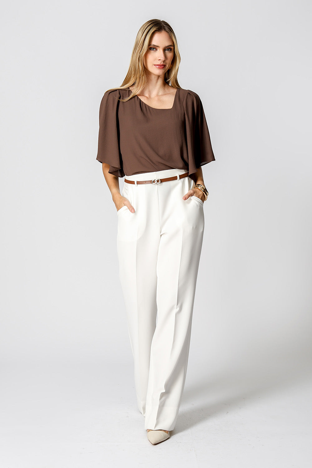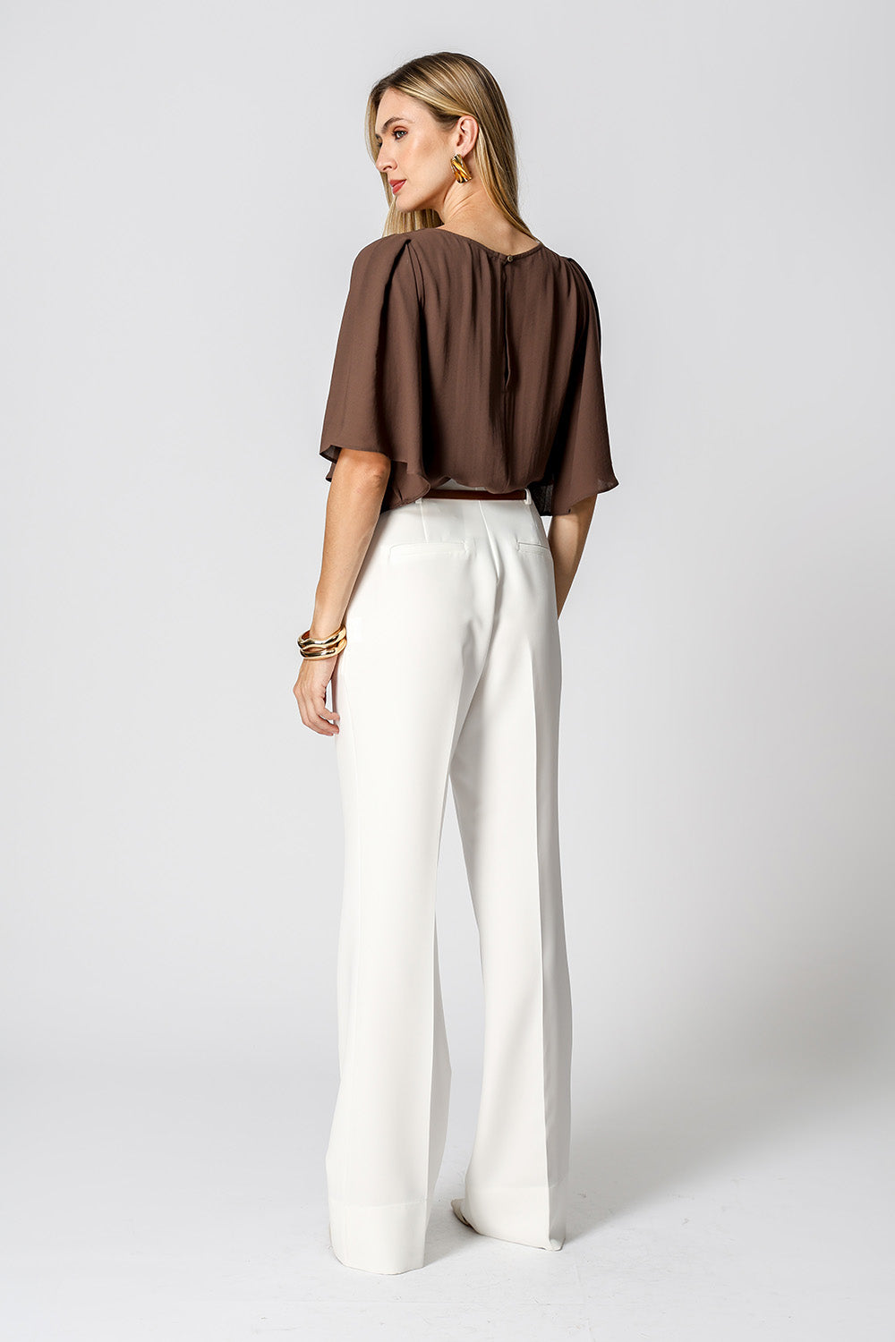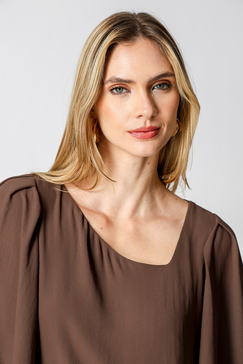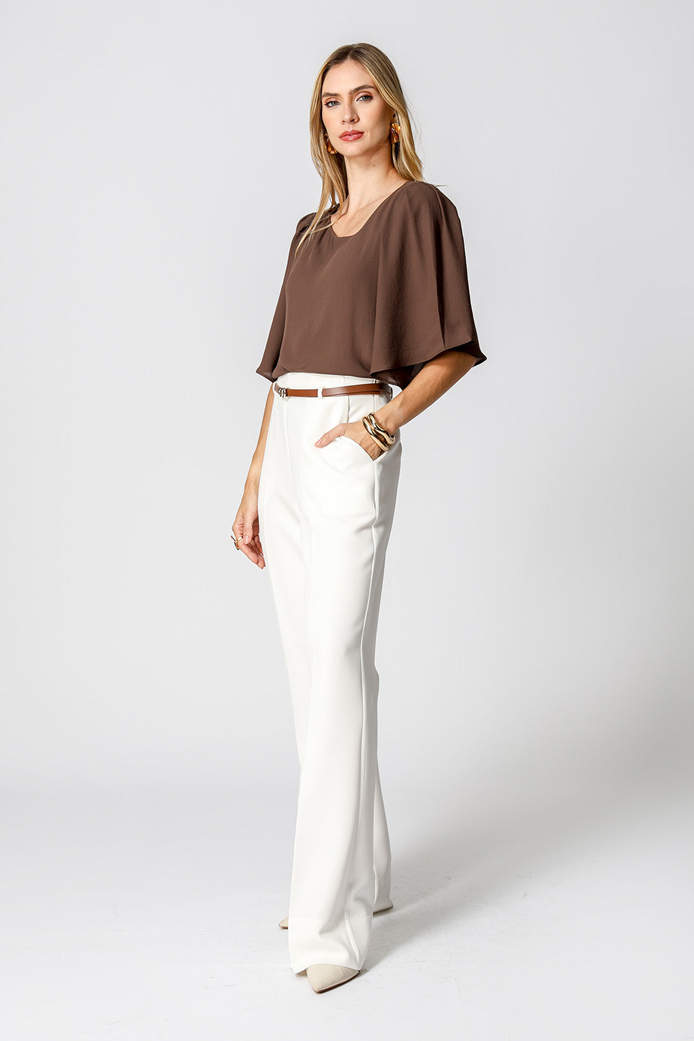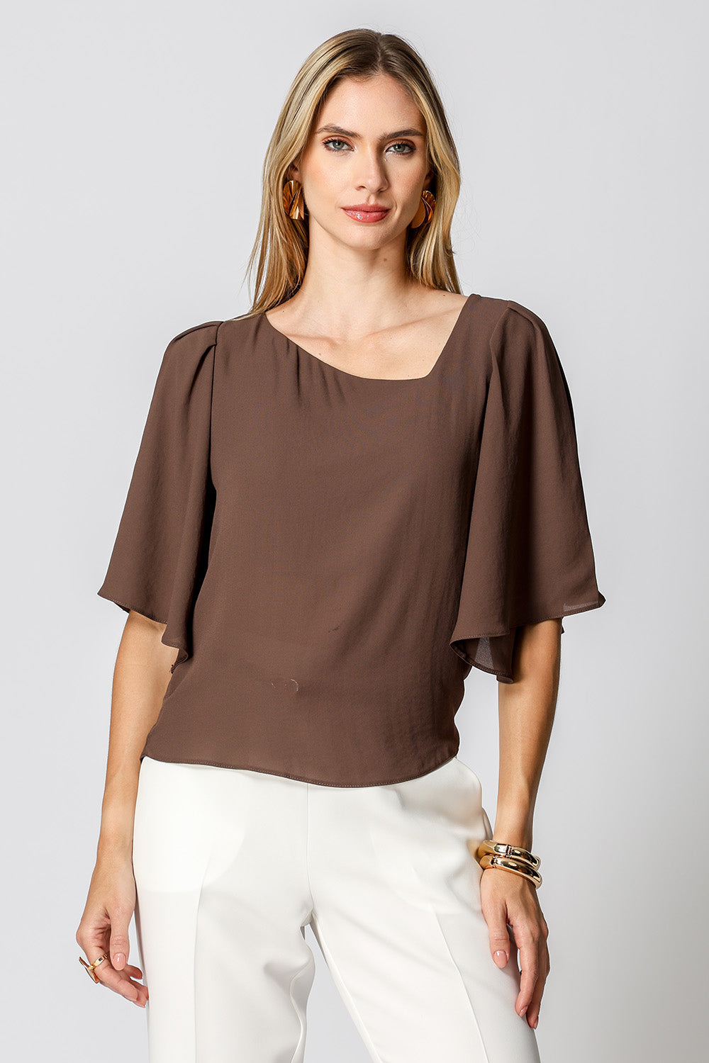 La blusa con mangas de ángel y escote asimétrico ofrece un ajuste perfecto, aportando sofisticación y un estilo único a tu guardarropa. Perfecto para diferentes ocasiones, ya sea en eventos más formales o reuniones casuales, manteniendo siempre la elegancia.