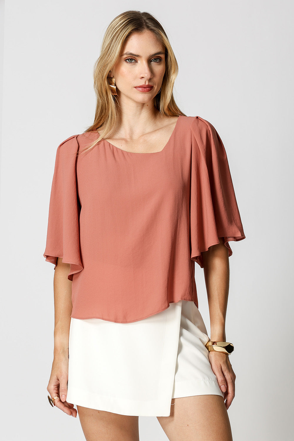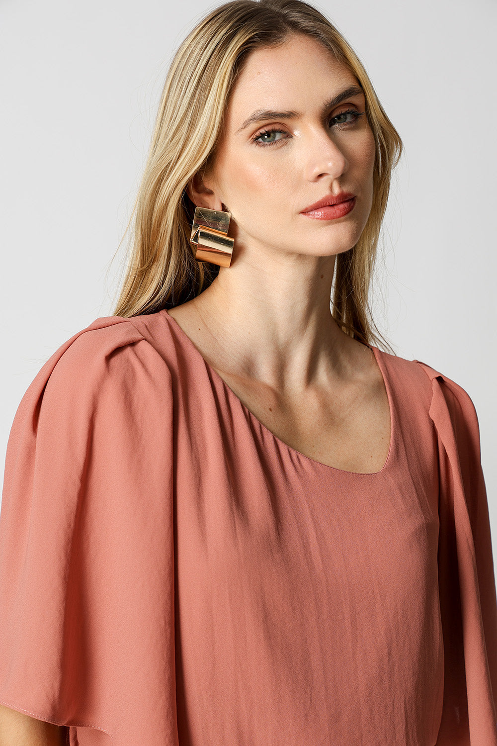 La blusa con mangas de ángel y escote asimétrico ofrece un ajuste perfecto, aportando sofisticación y un estilo único a tu guardarropa. Perfecto para diferentes ocasiones, ya sea en eventos más formales o reuniones casuales, manteniendo siempre la elegancia.