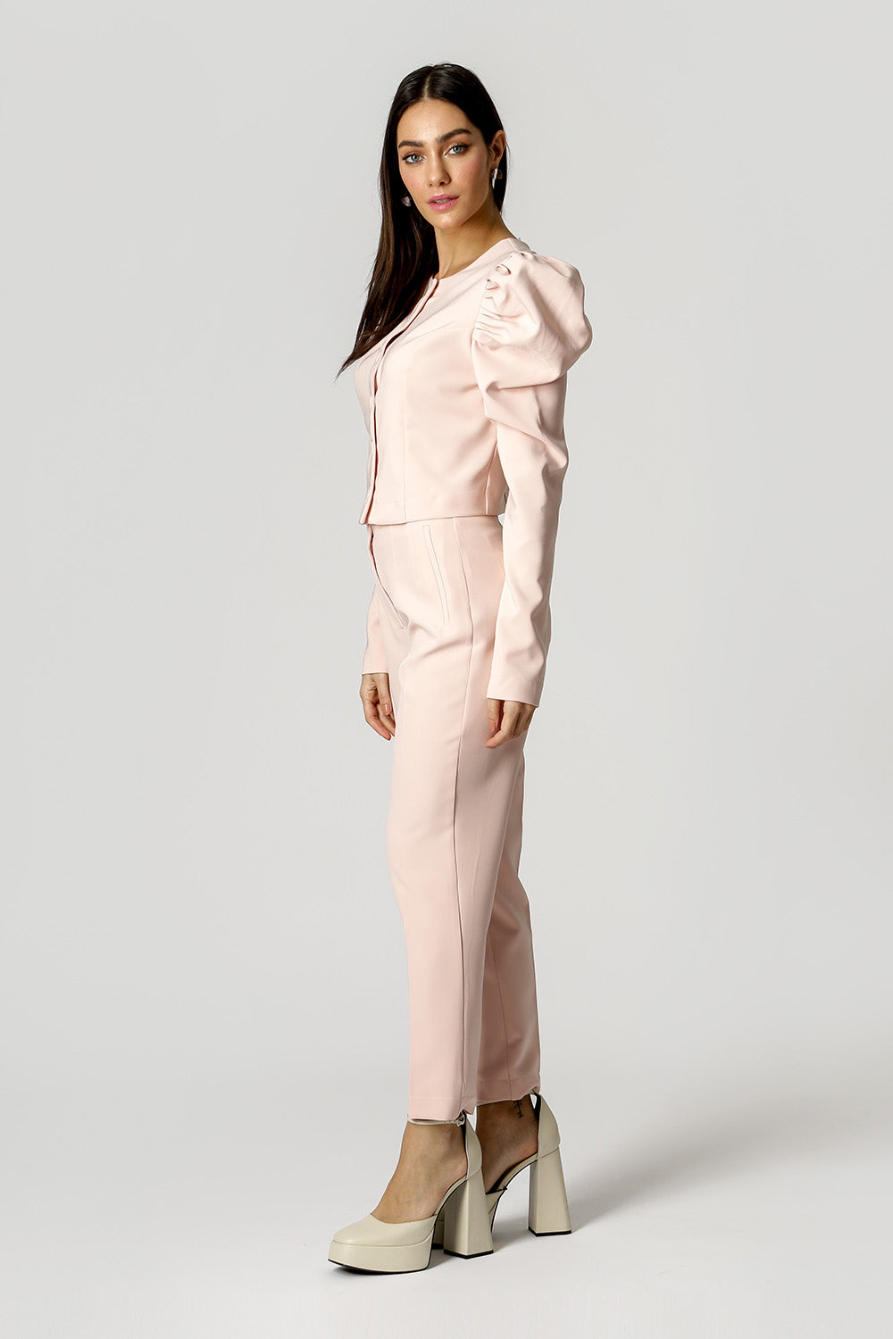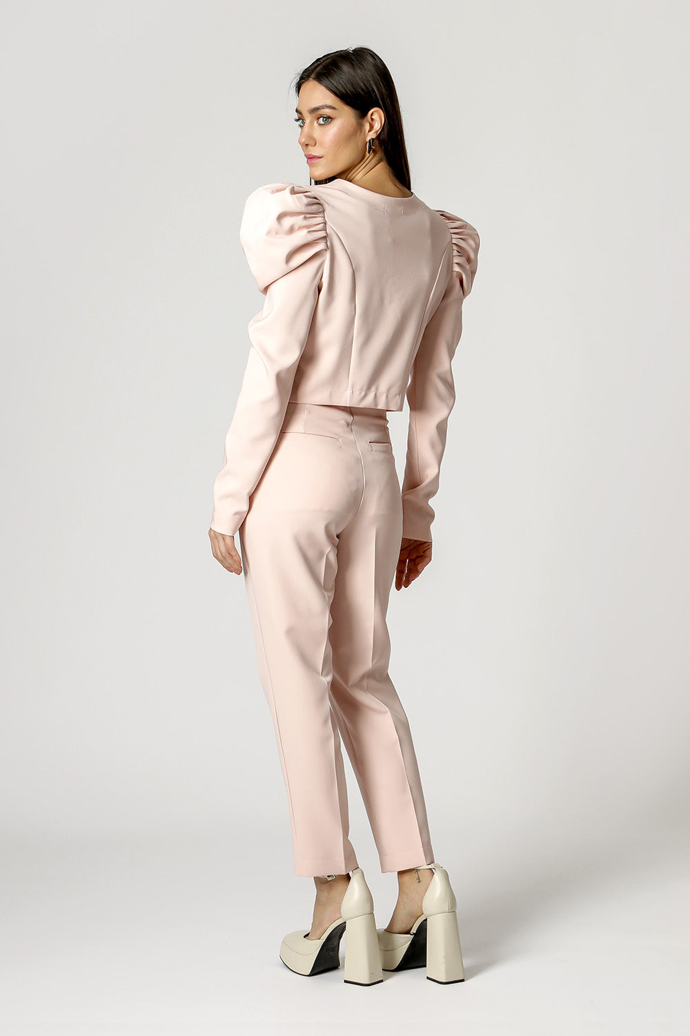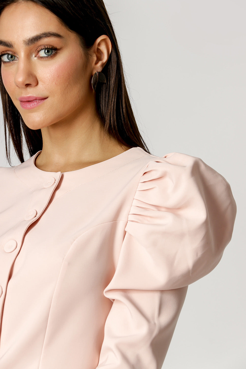 Blusa de mangas abullonadas con detalle de pliegues y botones, forrada con la propia tela. Fabricado con tejido a medida. Una pieza con un diseño ceñido al cuerpo que realmente realza tu silueta, una pieza ideal para usar en el trabajo.