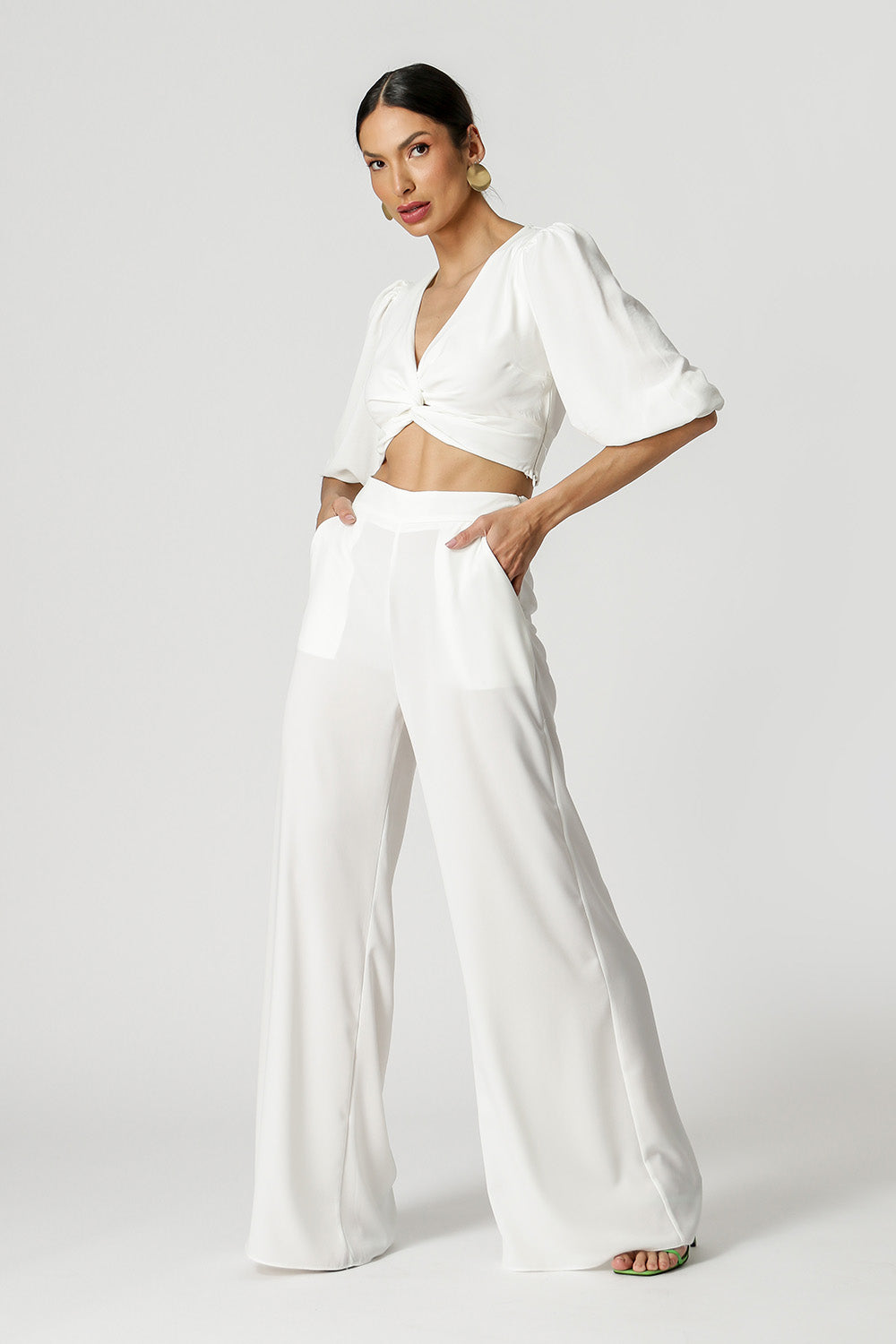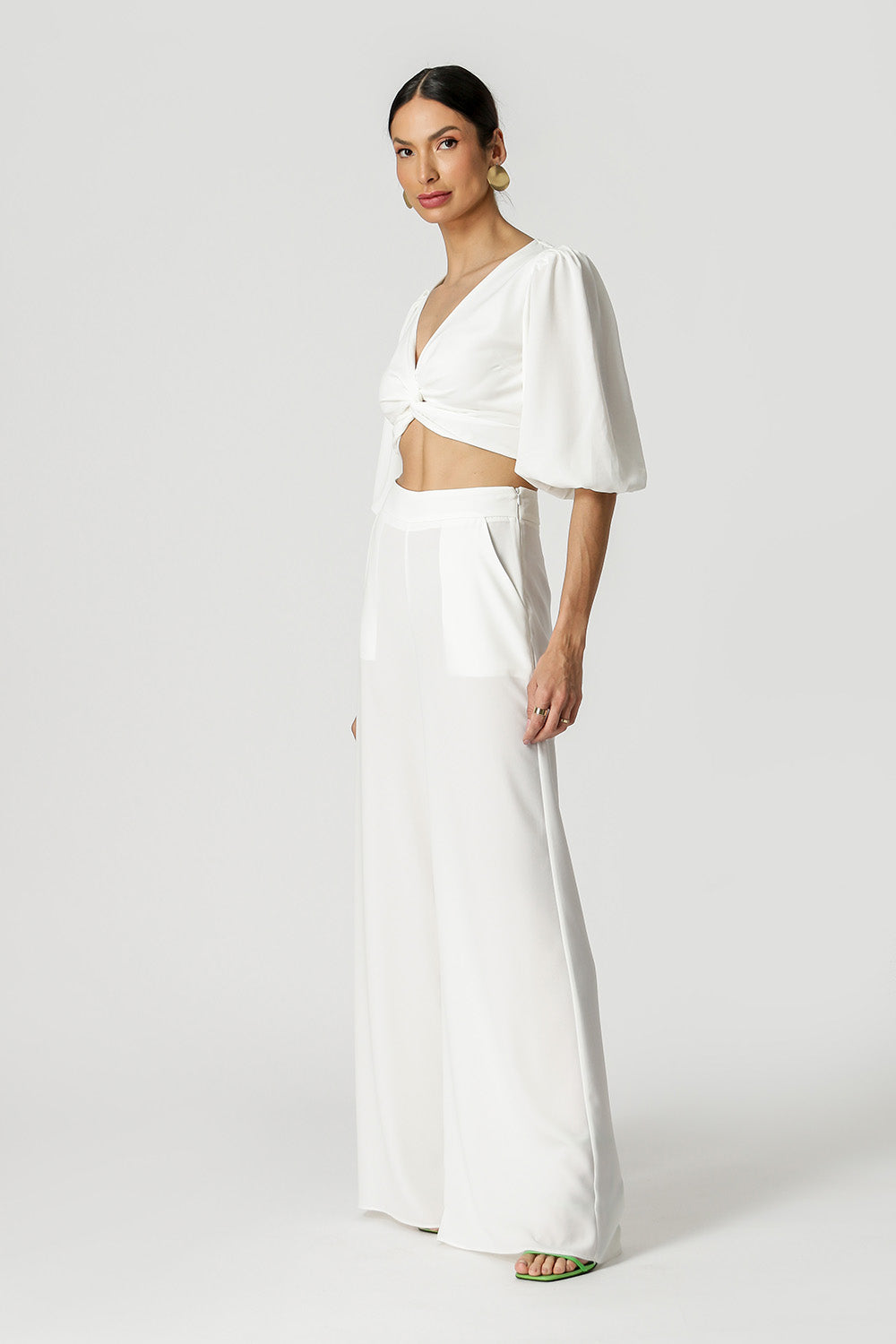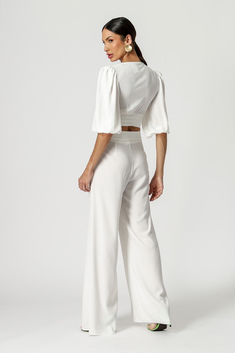 Blusa con escote cruzado, mangas abullonadas y elástico en la espalda. Una buena apuesta para un look dulce y casual.