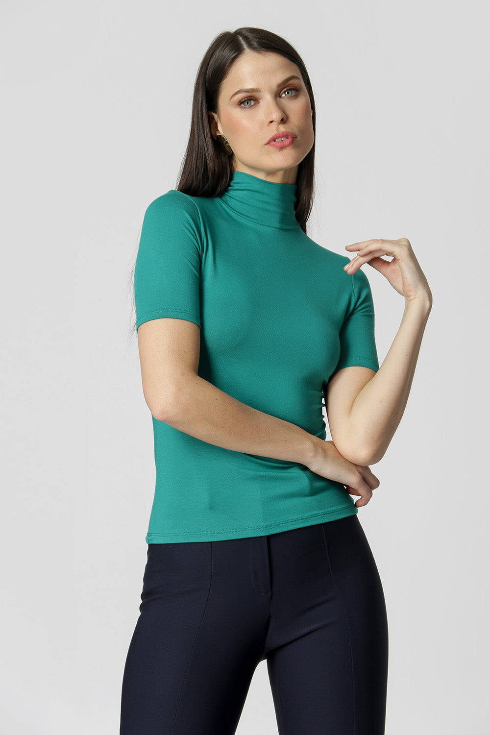 Blusa en punto viscopet, tiene manga corta y cuello alto. Pieza básica, perfecta para trabajar con looks de capas.