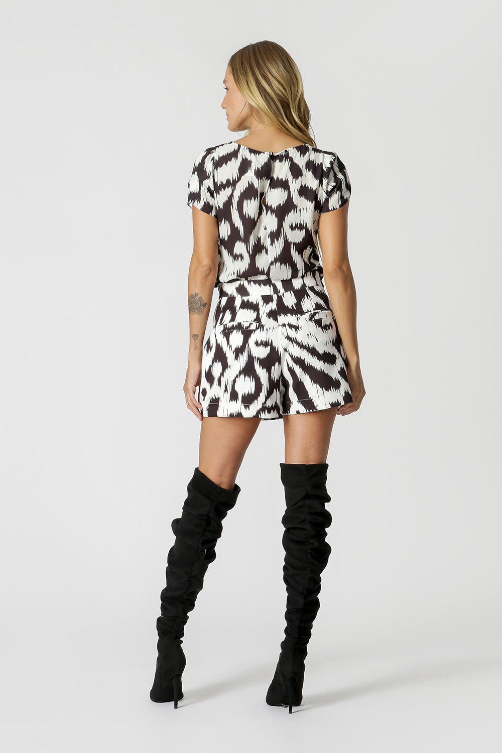 Blusa confeccionada en crepe fluido estampado. La pieza tiene mangas cortas, con detalle cruzado. Corte holgado, apertura trasera con botón. Ideal para un look de trabajo tal como a ti te gusta.