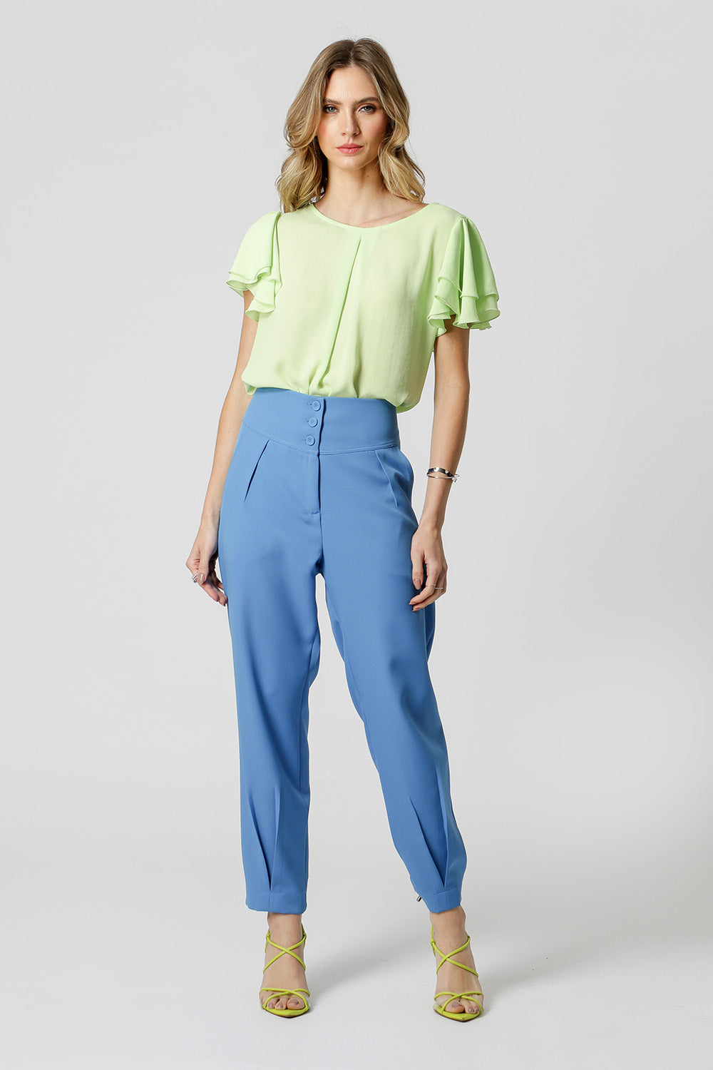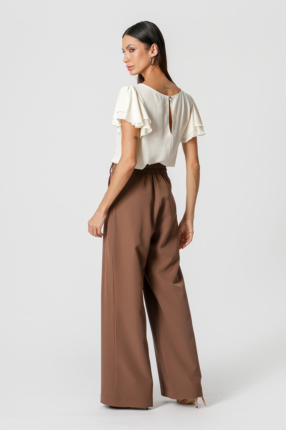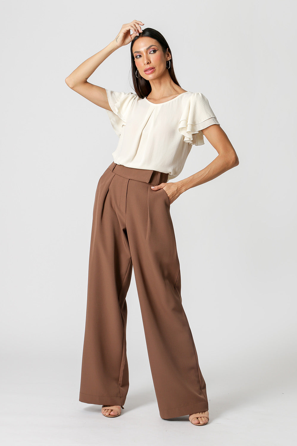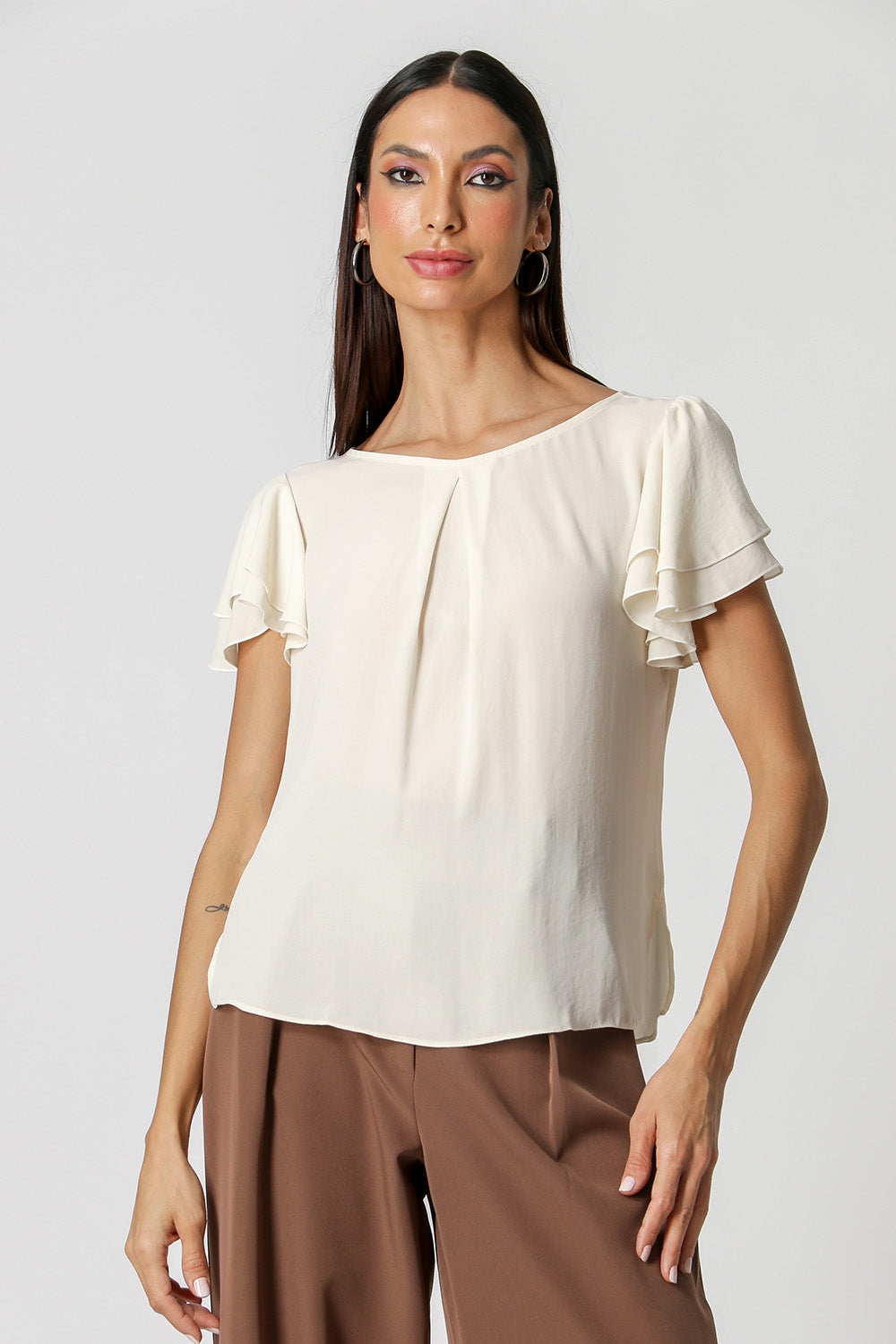 Modelo feito em crepe fluído, com shape soltinho, decote redondo, prega frontal e mangas curtas em camadas com leve franzido. Perfeita para um look de trabalho.