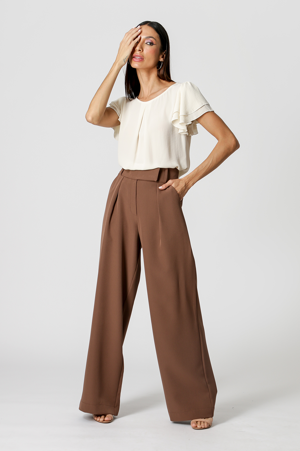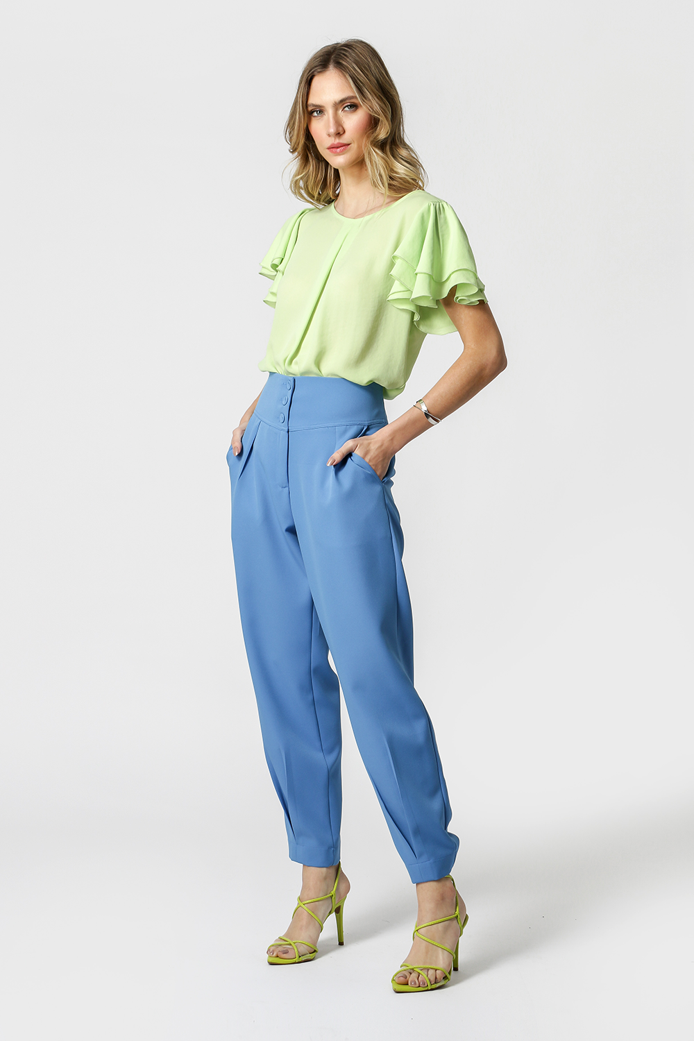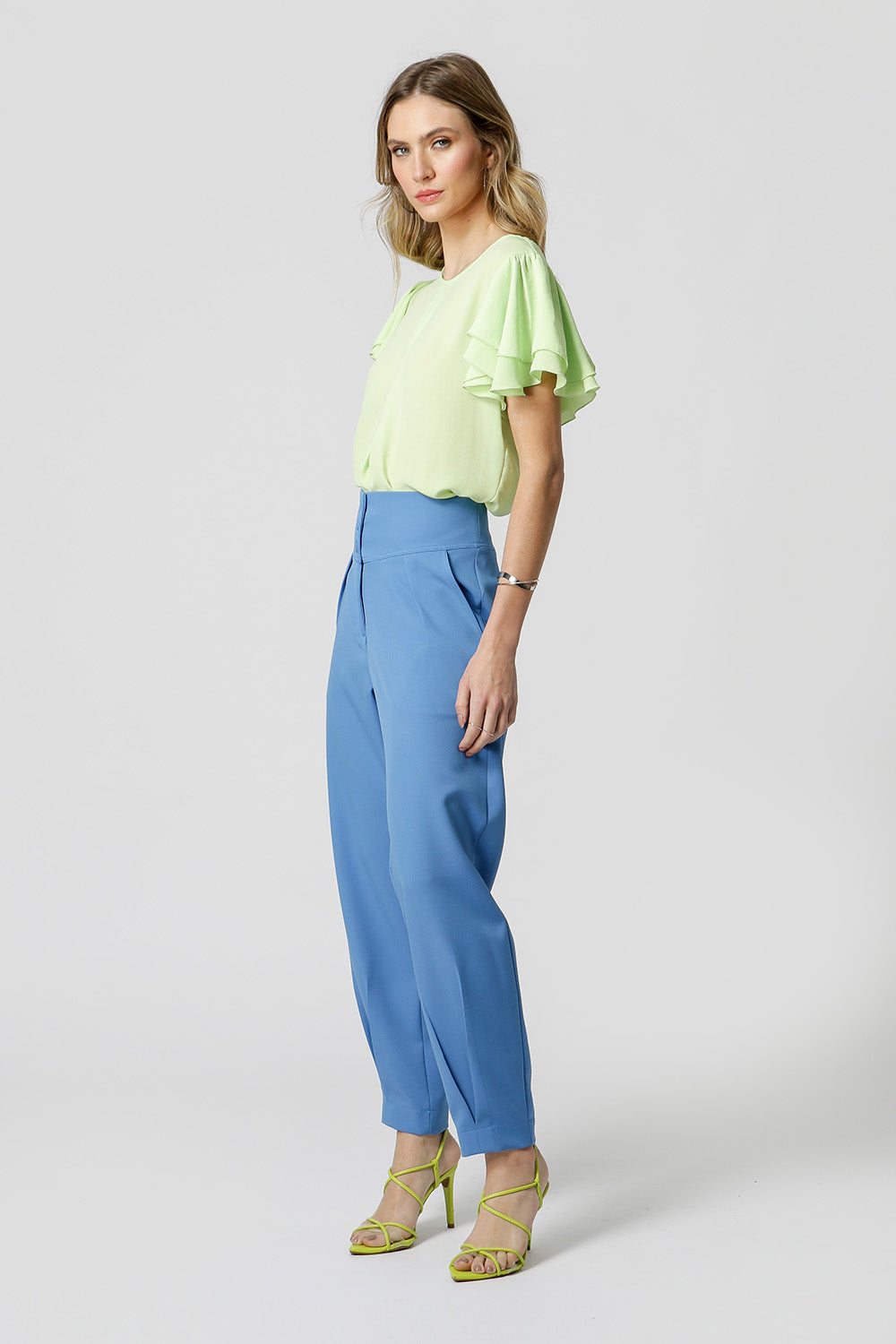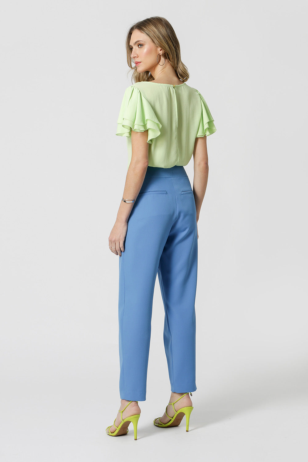 Modelo feito em crepe fluído, com shape soltinho, decote redondo, prega frontal e mangas curtas em camadas com leve franzido. Perfeita para um look de trabalho.