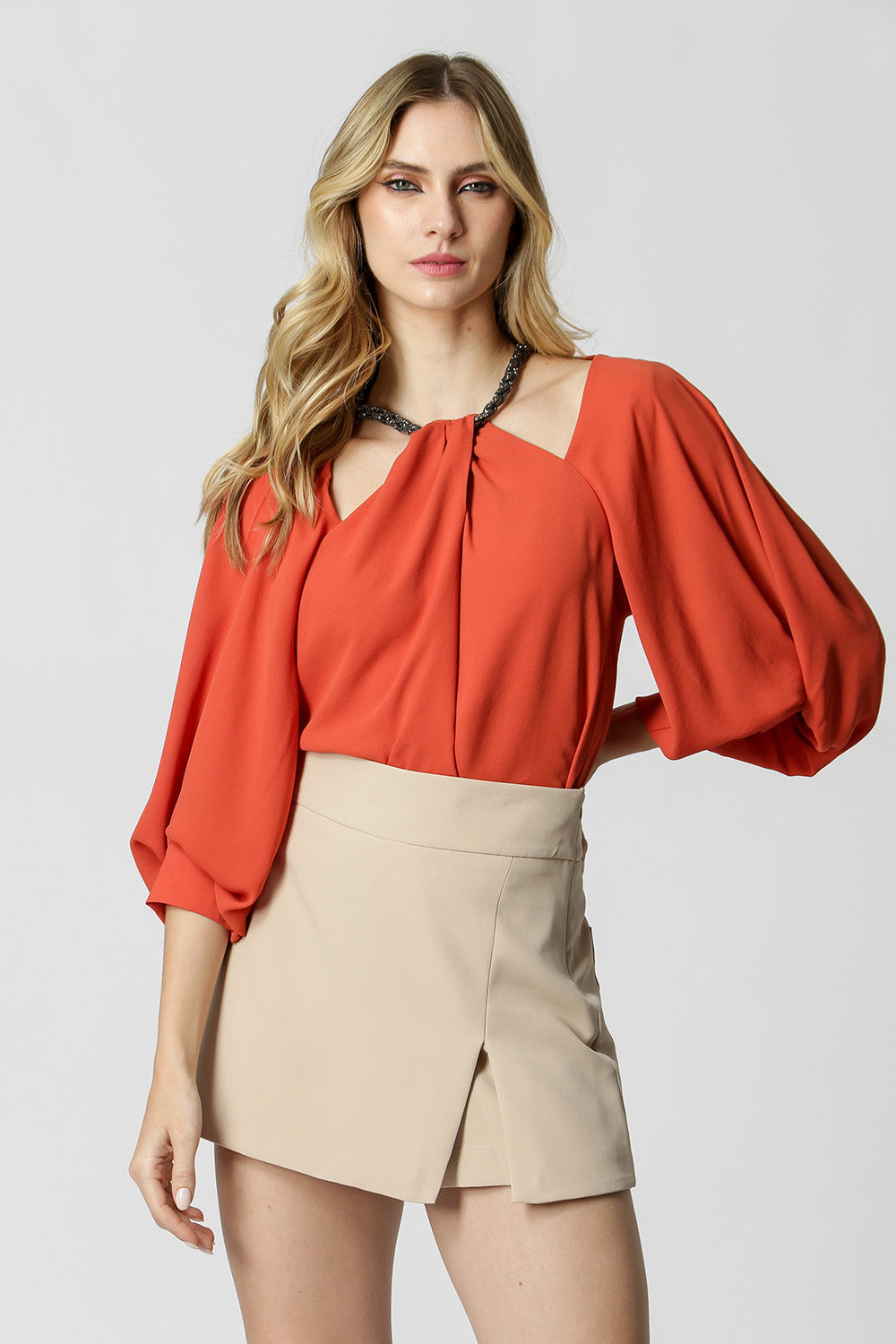 Blusa de manga larga abullonada con collar de pedrería. Modelo realizado en tejido fluido Crepe. Un modelo elegante lleno de encanto e ideal para crear looks de trabajo.