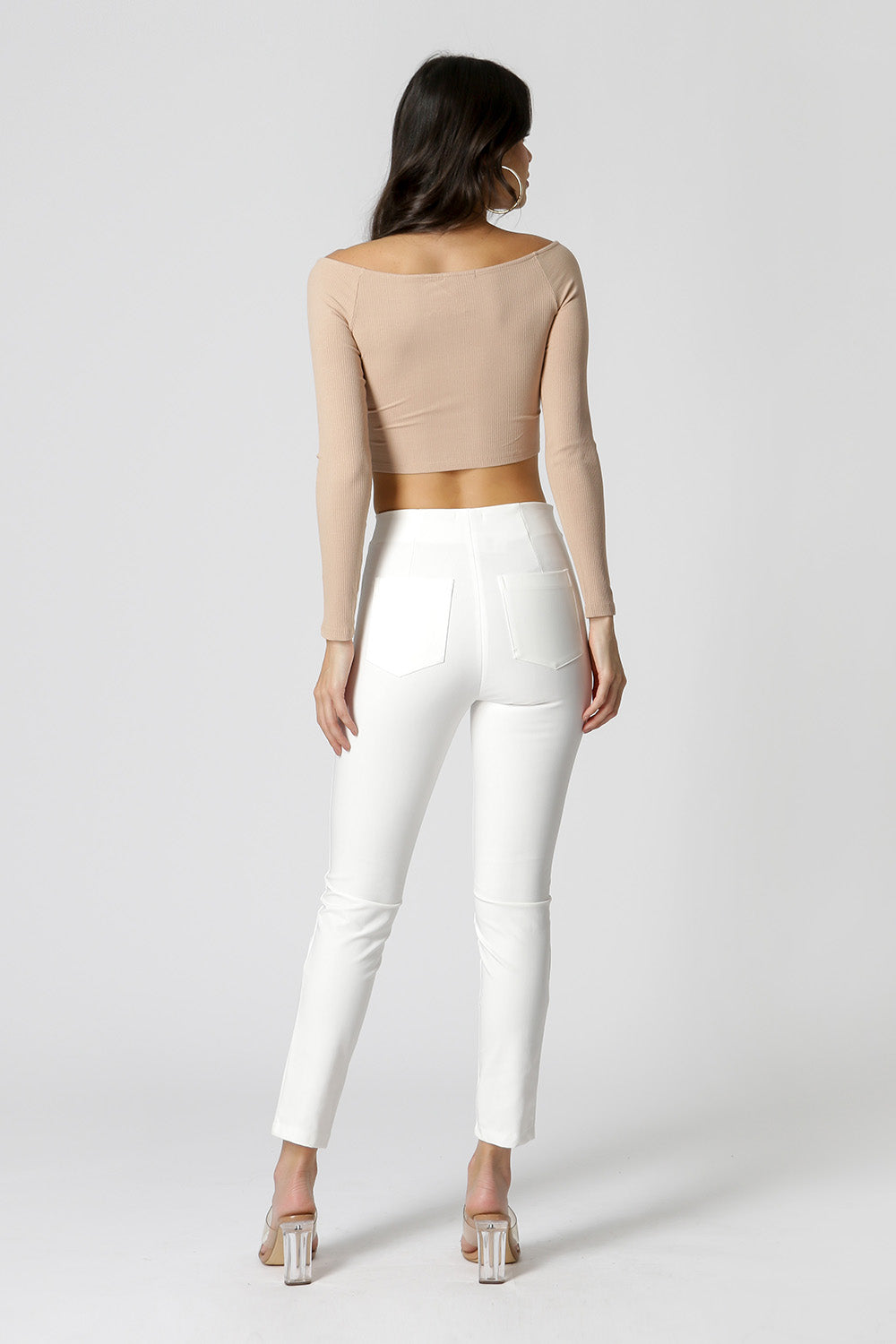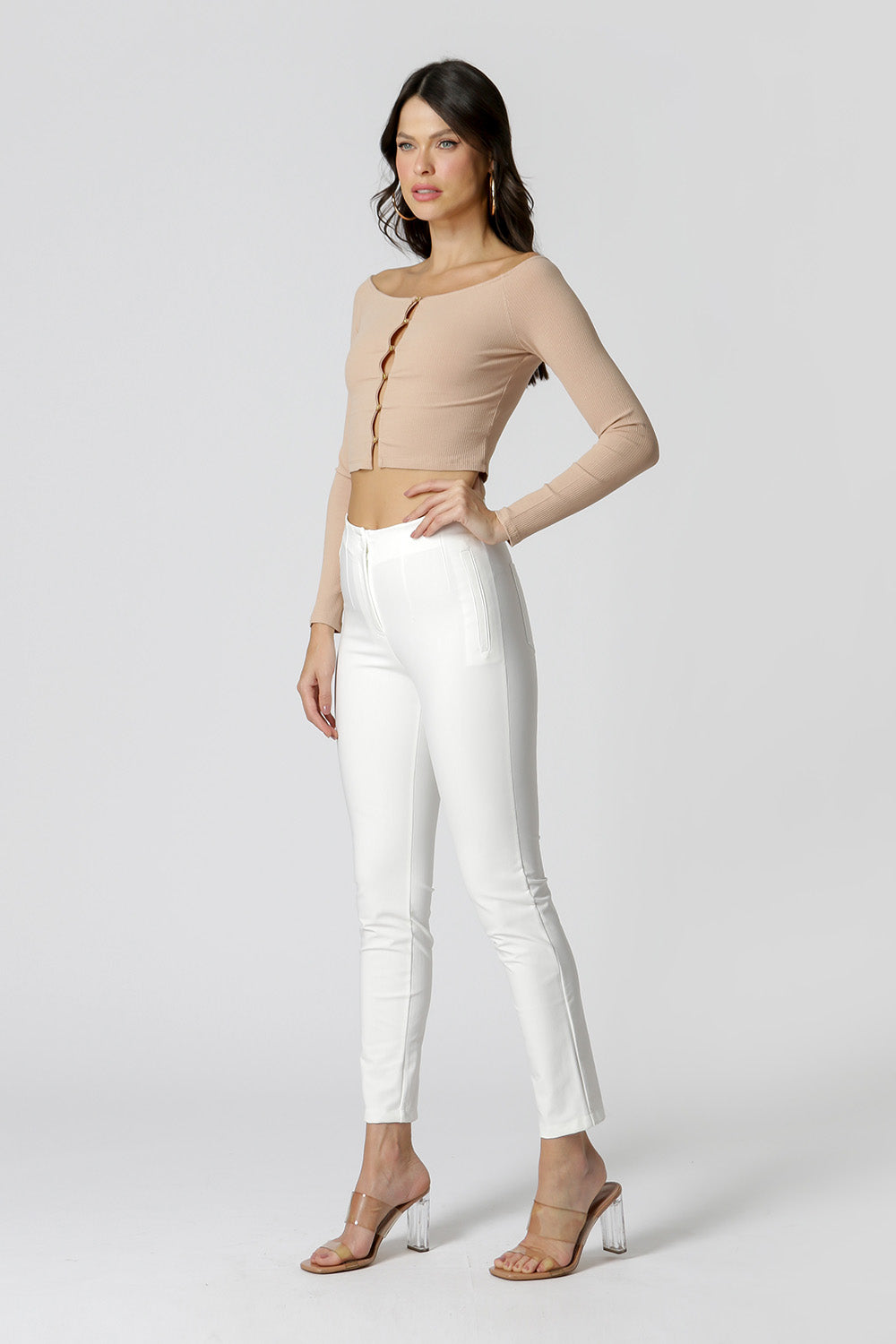Blusa confeccionada en punto canalé fino, con manga larga y hombros al descubierto. Una pieza que se puede usar de dos maneras, con el botón hacia adelante o hacia atrás.