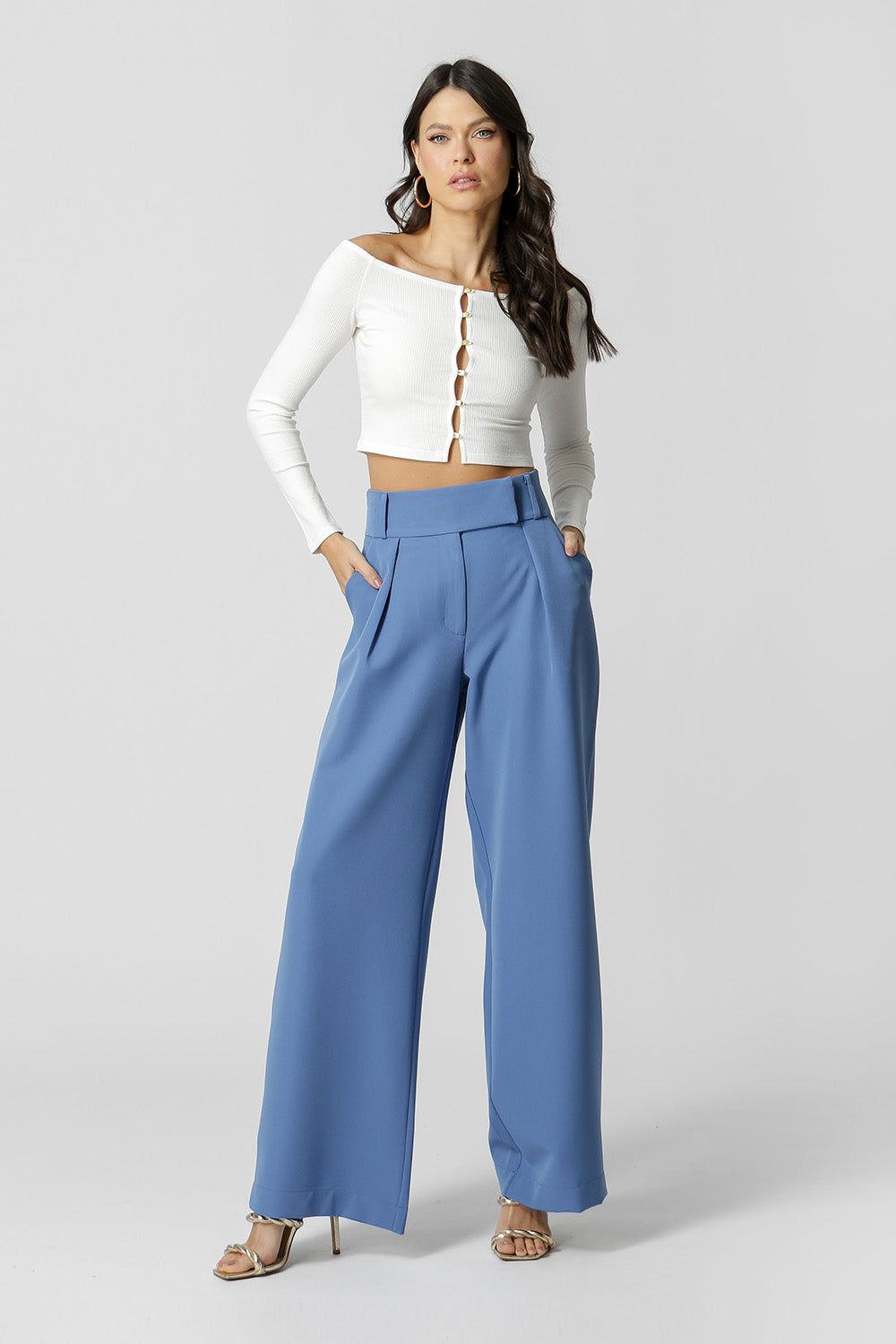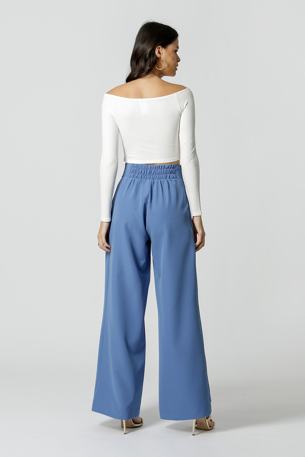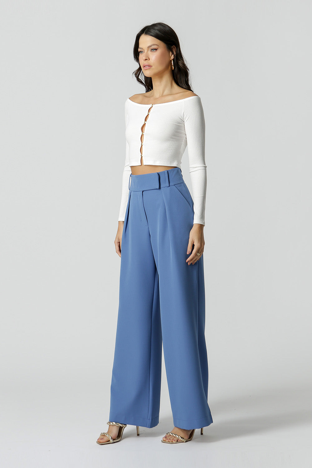 Blusa confeccionada en punto canalé fino, con manga larga y hombros al descubierto. Una pieza que se puede usar de dos maneras, con el botón hacia adelante o hacia atrás.