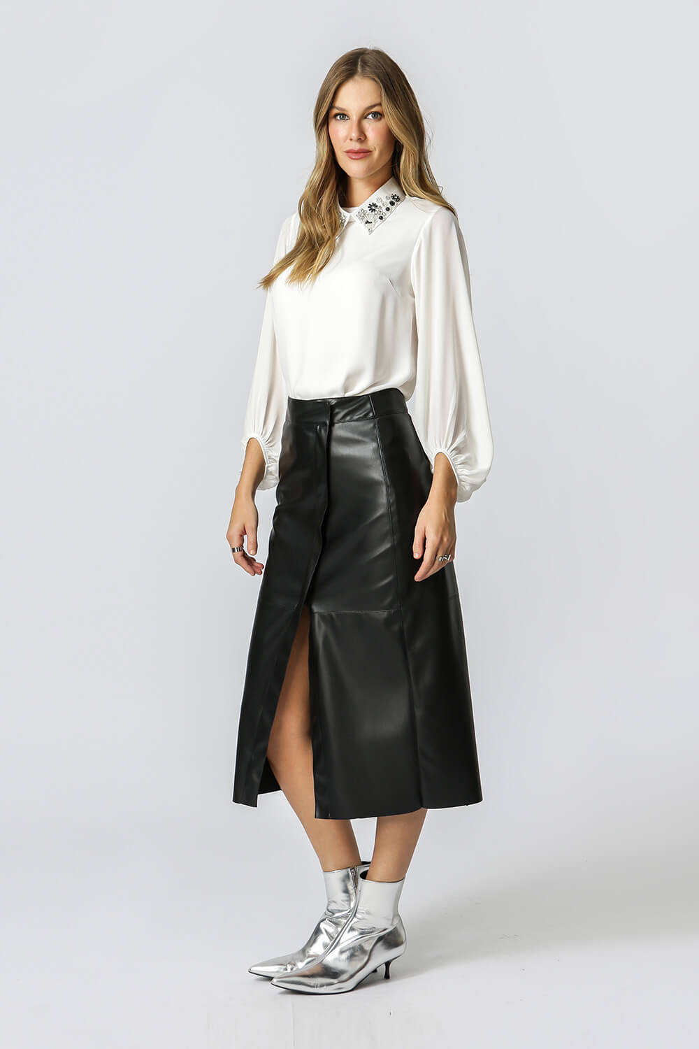 Blusa de manga larga abullonada, botones en la espalda y cuello desmontable decorado con pedrería. Modelo realizado en tejido crepe fluido. Una pieza versátil y elegante que puede usarse en múltiples ocasiones. Es perfecto para cualquier persona que quiera añadir un toque de sofisticación a su look, sin sacrificar la comodidad.