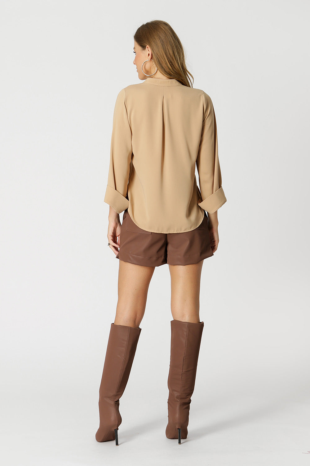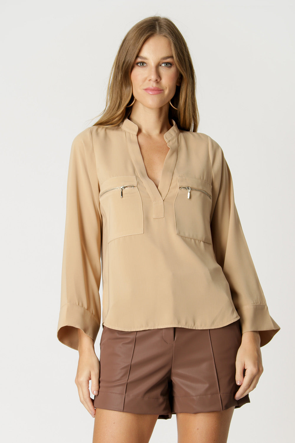 Blusa de manga larga y bolsillo frontal con detalle de cremallera. Fabricado con tejido crepé fluido de primera calidad. Una pieza suelta y elegante, perfecta para un ambiente de trabajo.
