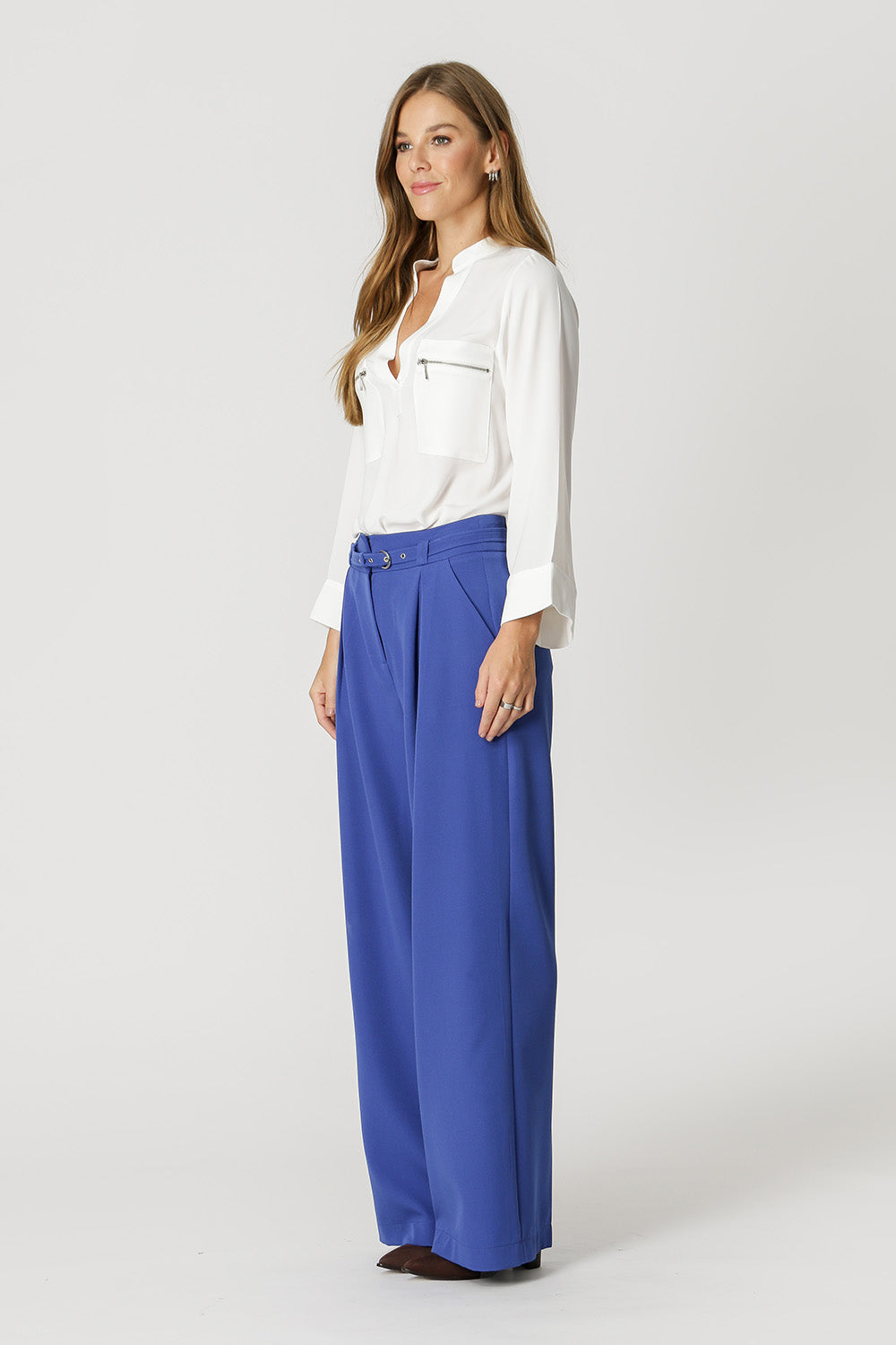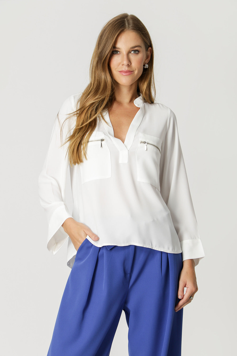 Blusa de manga larga y bolsillo frontal con detalle de cremallera. Fabricado con tejido crepé fluido de primera calidad. Una pieza suelta y elegante, perfecta para un ambiente de trabajo.