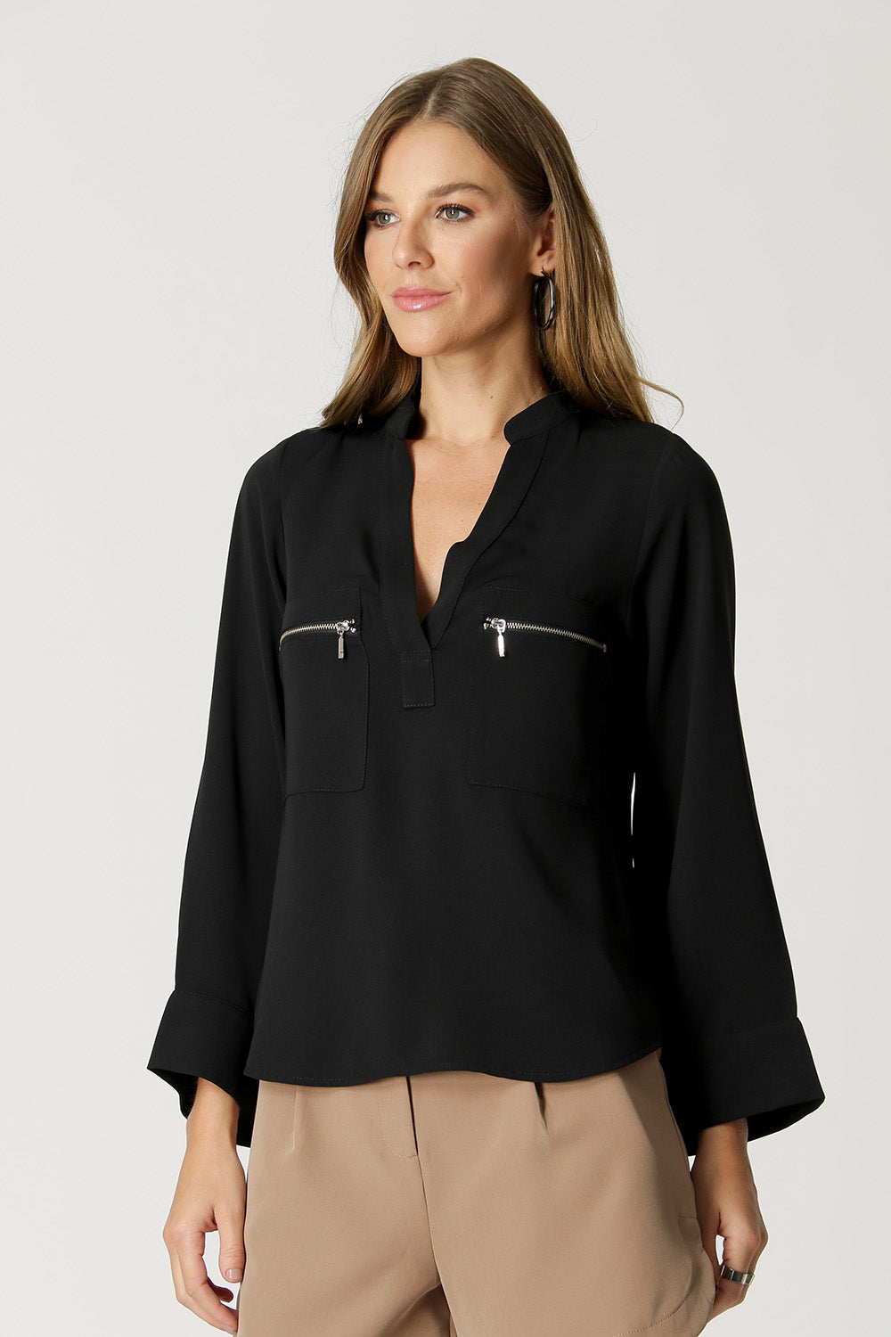 Blusa de manga larga y bolsillo frontal con detalle de cremallera. Fabricado con tejido crepé fluido de primera calidad. Una pieza suelta y elegante, perfecta para un ambiente de trabajo.