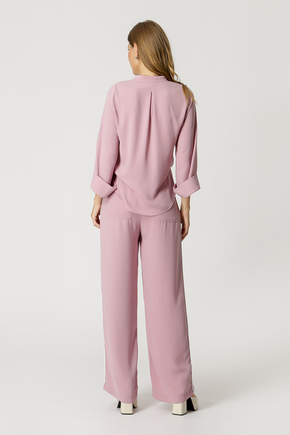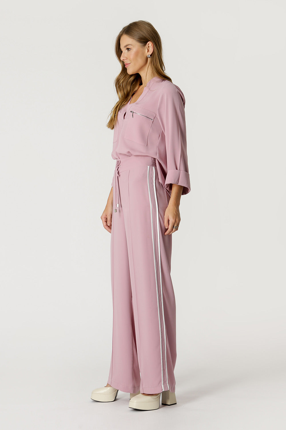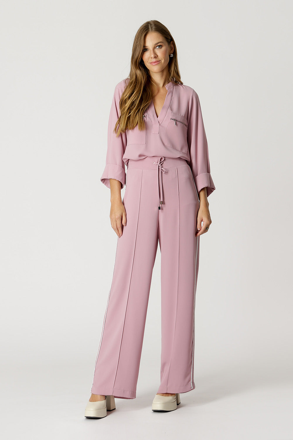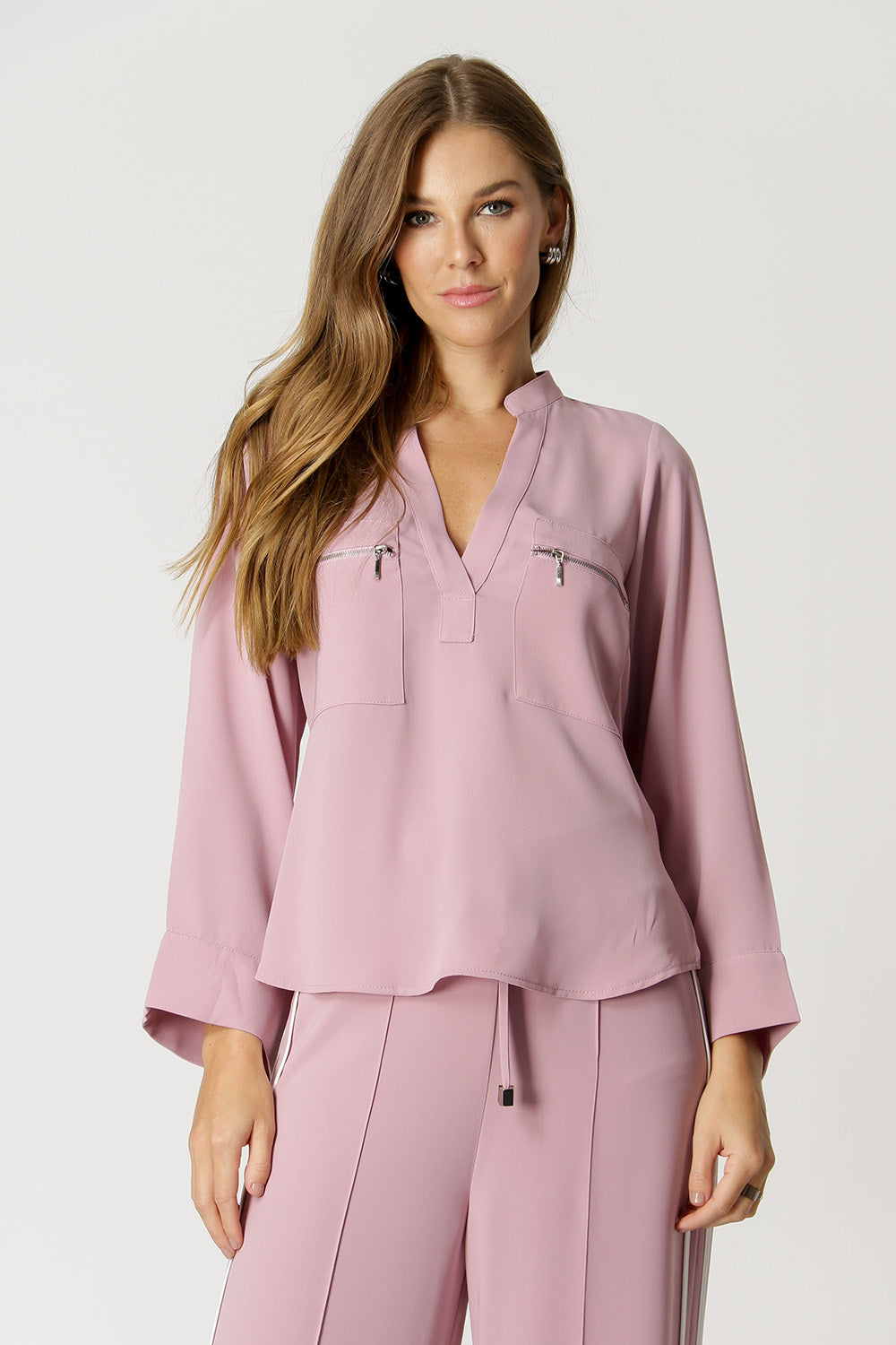Blusa de manga larga y bolsillo frontal con detalle de cremallera. Fabricado con tejido crepé fluido de primera calidad. Una pieza suelta y elegante, perfecta para un ambiente de trabajo.