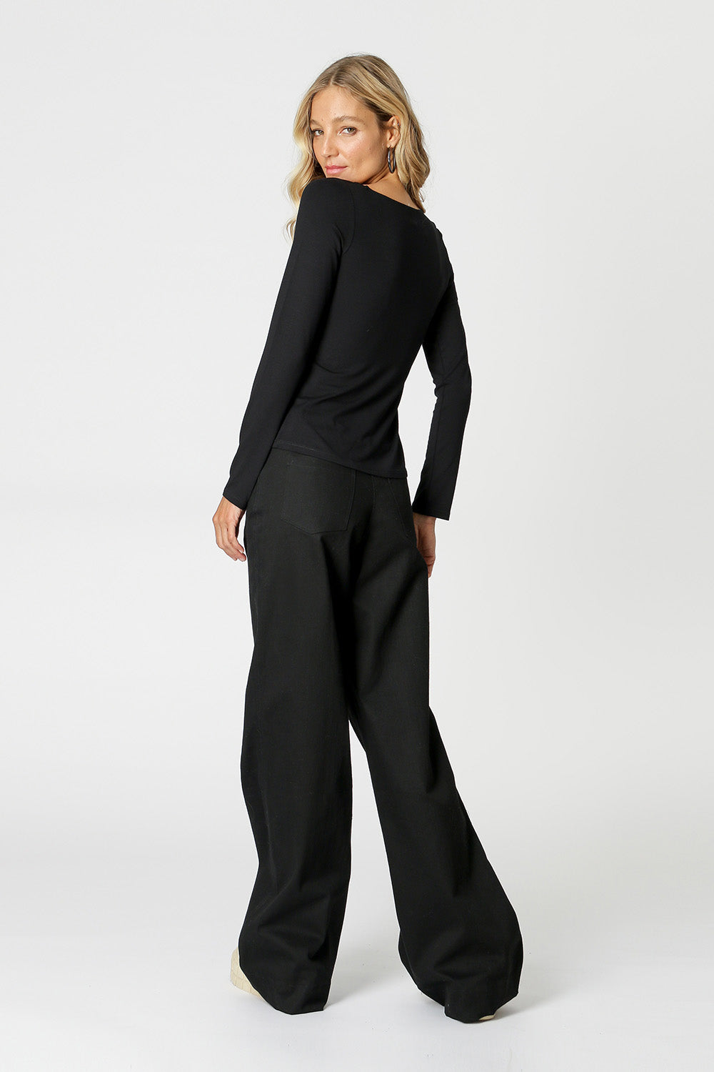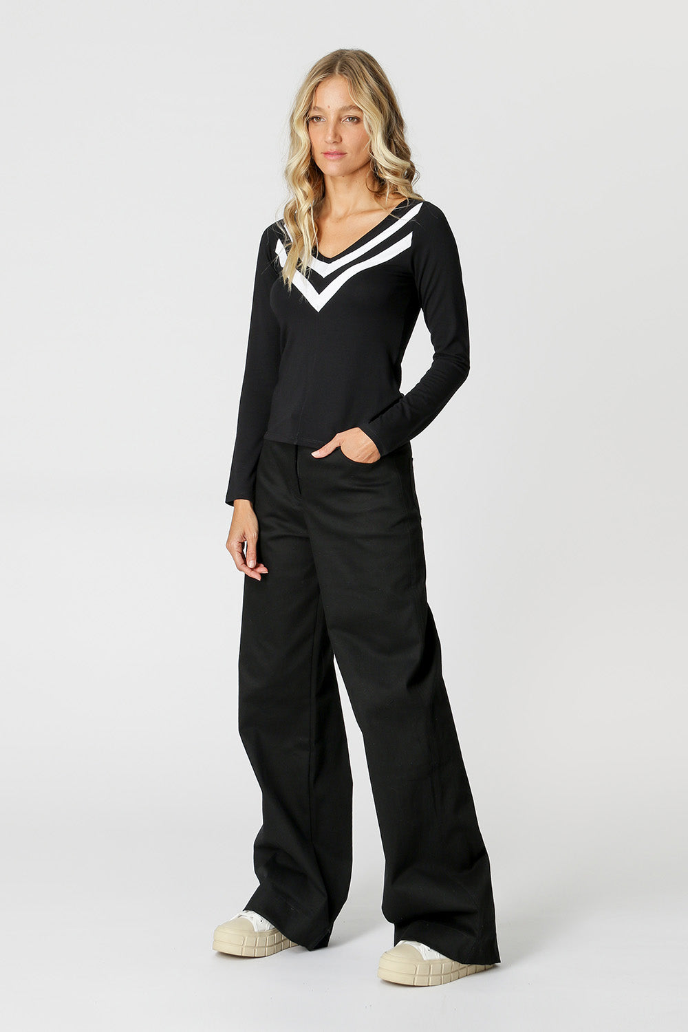 Blusa de manga larga con cortes de color en contraste en el escote. Pieza confeccionada a partir de tejido de hilo de viscosa retorcido. Una pieza básica y cómoda para crear un look de entretiempo.