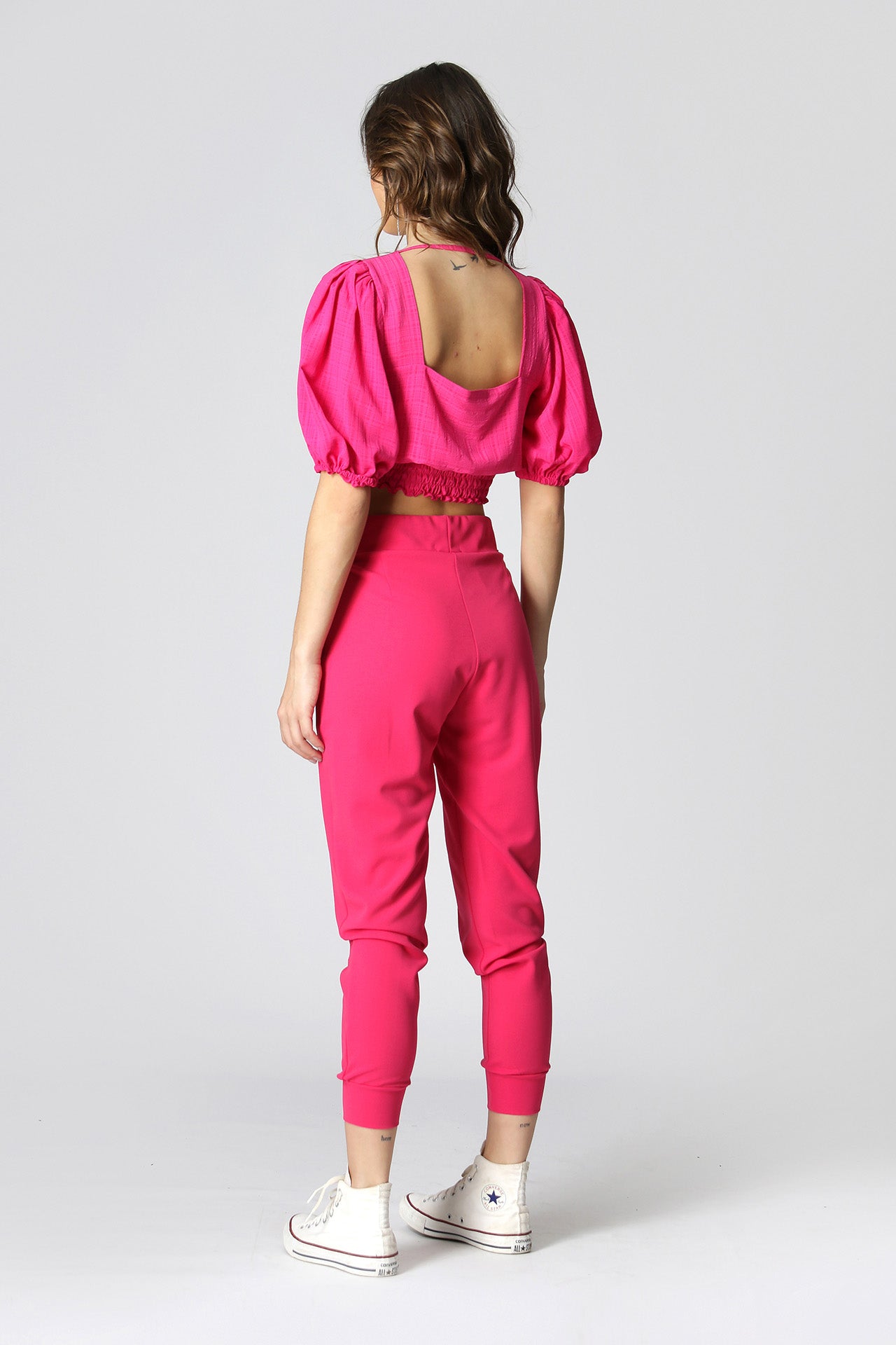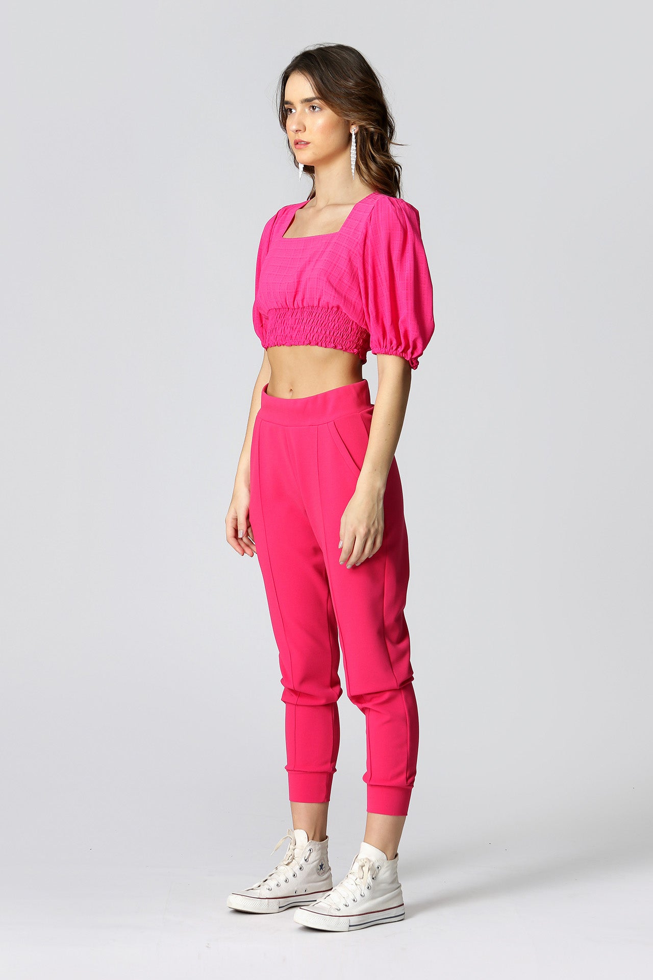 Blusa confeccionada en gasa ligera con transparencia, tiene escote cuadrado, mangas abullonadas con elástico incorporado en el bajo, largo corto y bajo elástico. Una pieza elegante y moderna.