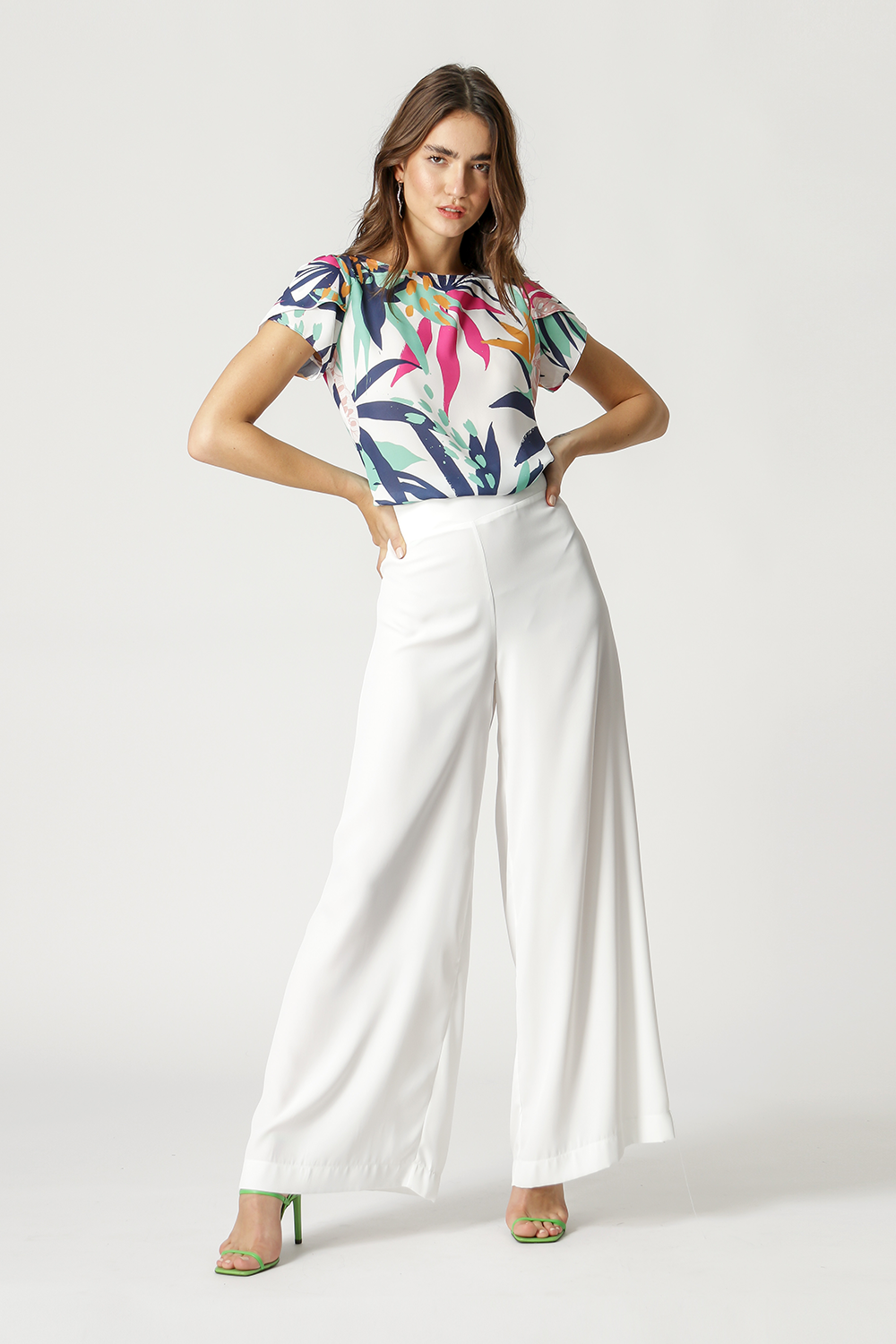 Blusa confeccionada en crepe fluido estampado. La pieza tiene mangas cortas, con detalle cruzado. Corte holgado, abertura trasera con botón. Ideal para un look de trabajo tal como a ti te gusta.