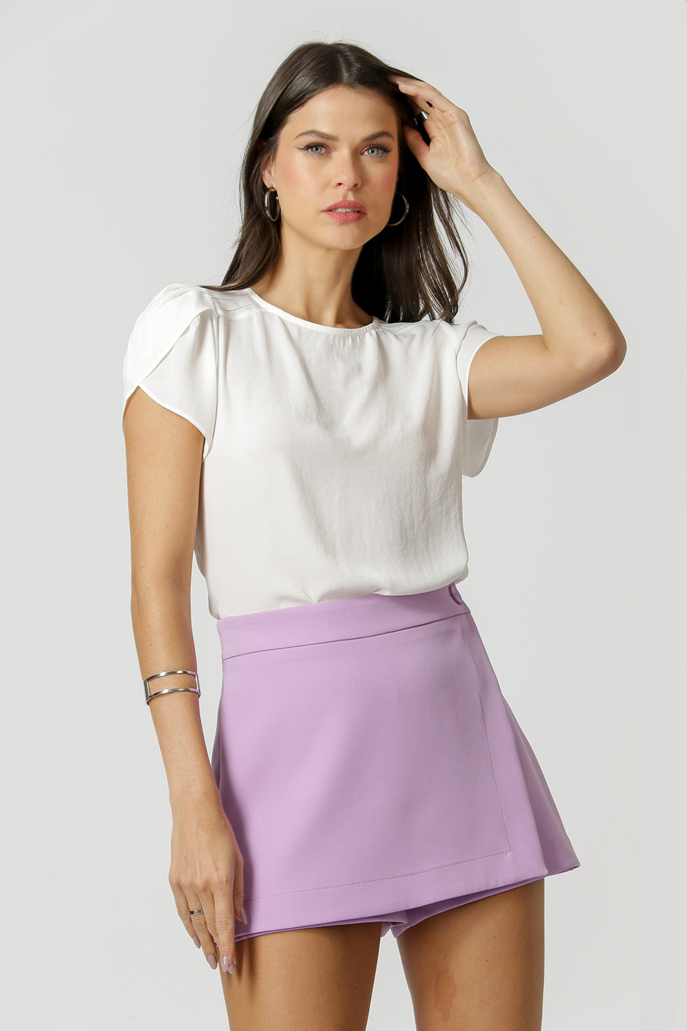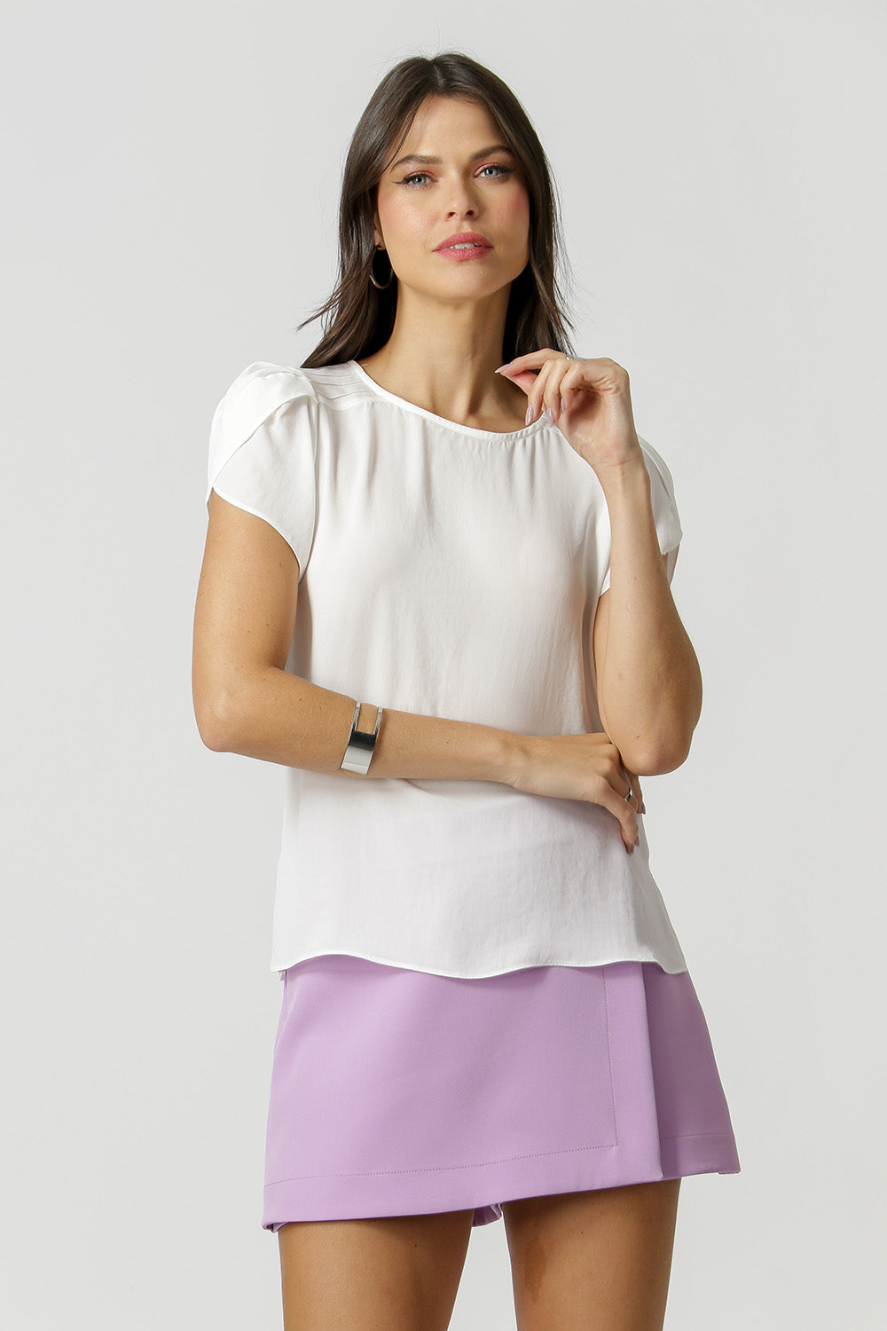 Blusa con mangas tulipán, con canalé en los hombros y corte holgado. Pieza confeccionada en crepe fluido, perfecta para looks laborales y casual.