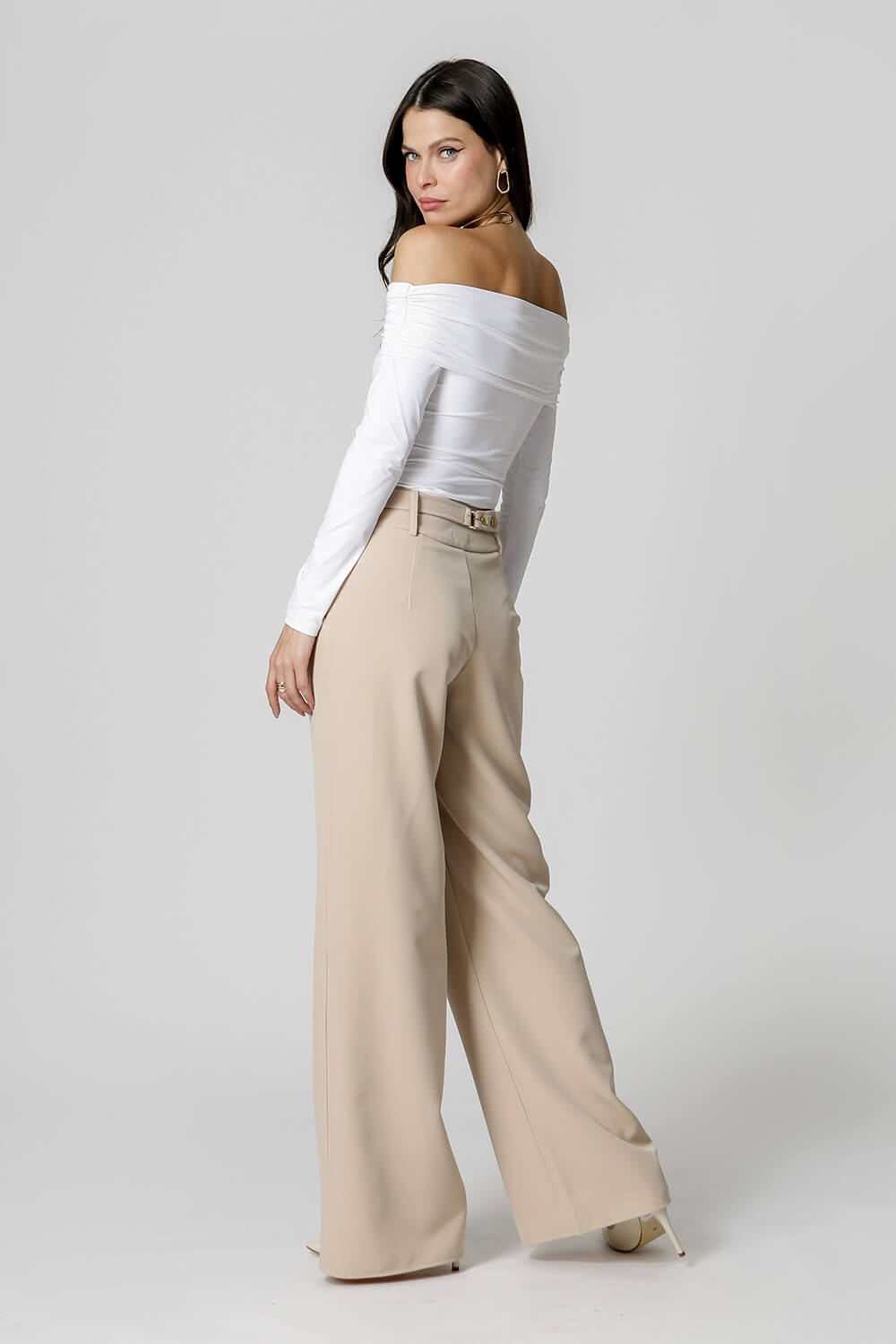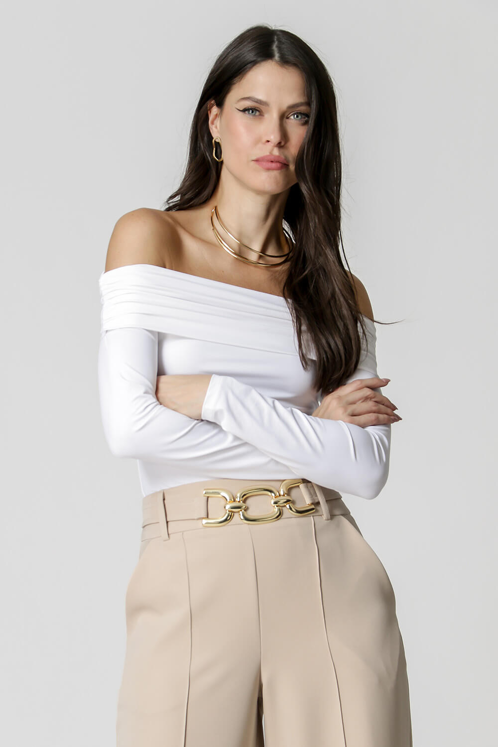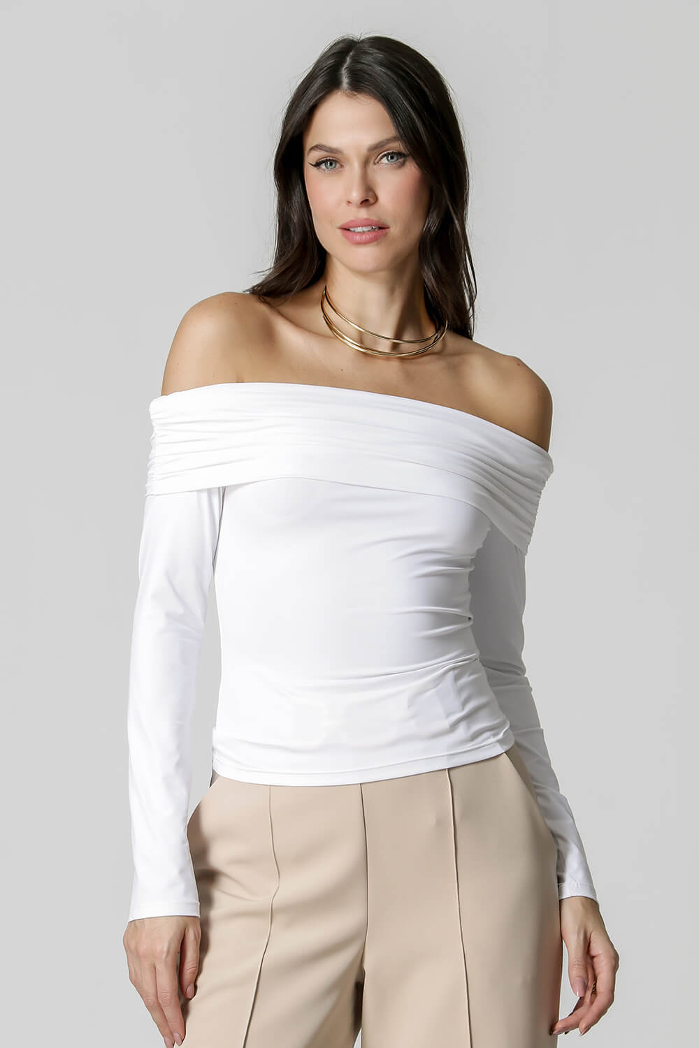 Blusa con hombros descubiertos. Confeccionado en tejido amni, ofrece un diseño ajustado que realza la silueta femenina y es perfecto para crear looks casuales.