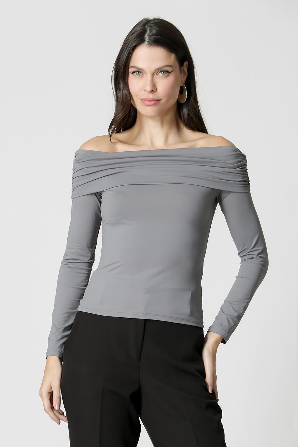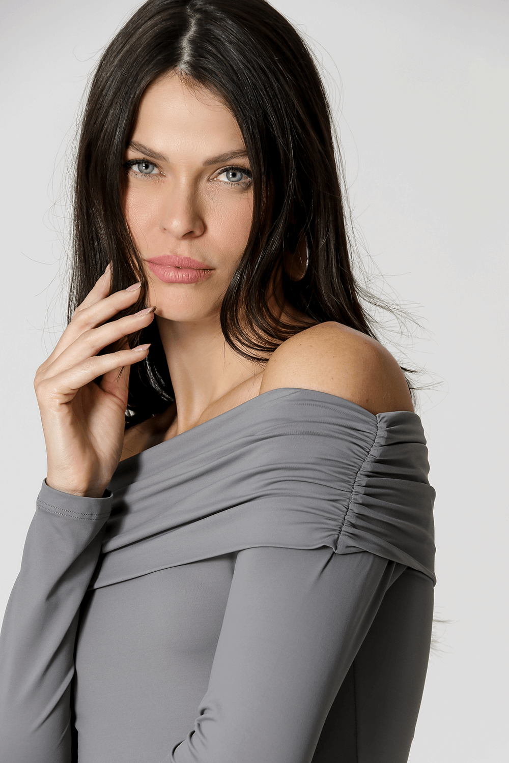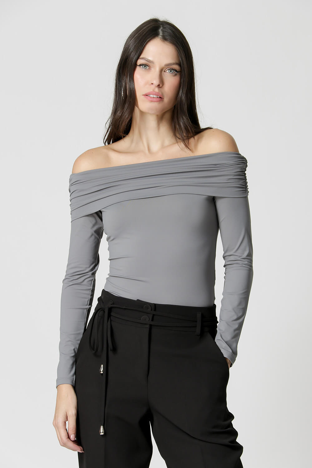 Blusa con hombros descubiertos. Confeccionado en tejido amni, ofrece un diseño ajustado que realza la silueta femenina y es perfecto para crear looks casuales.