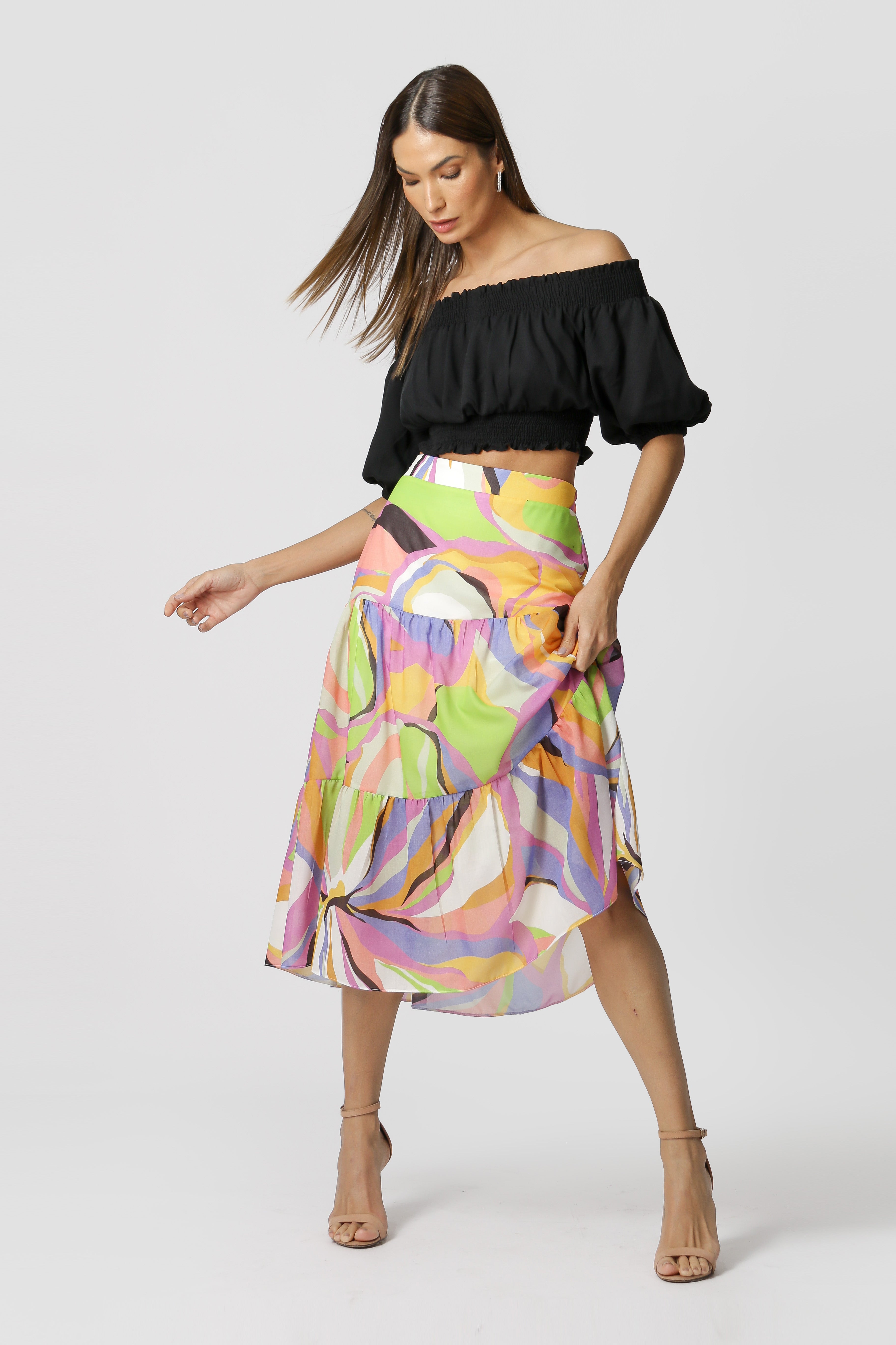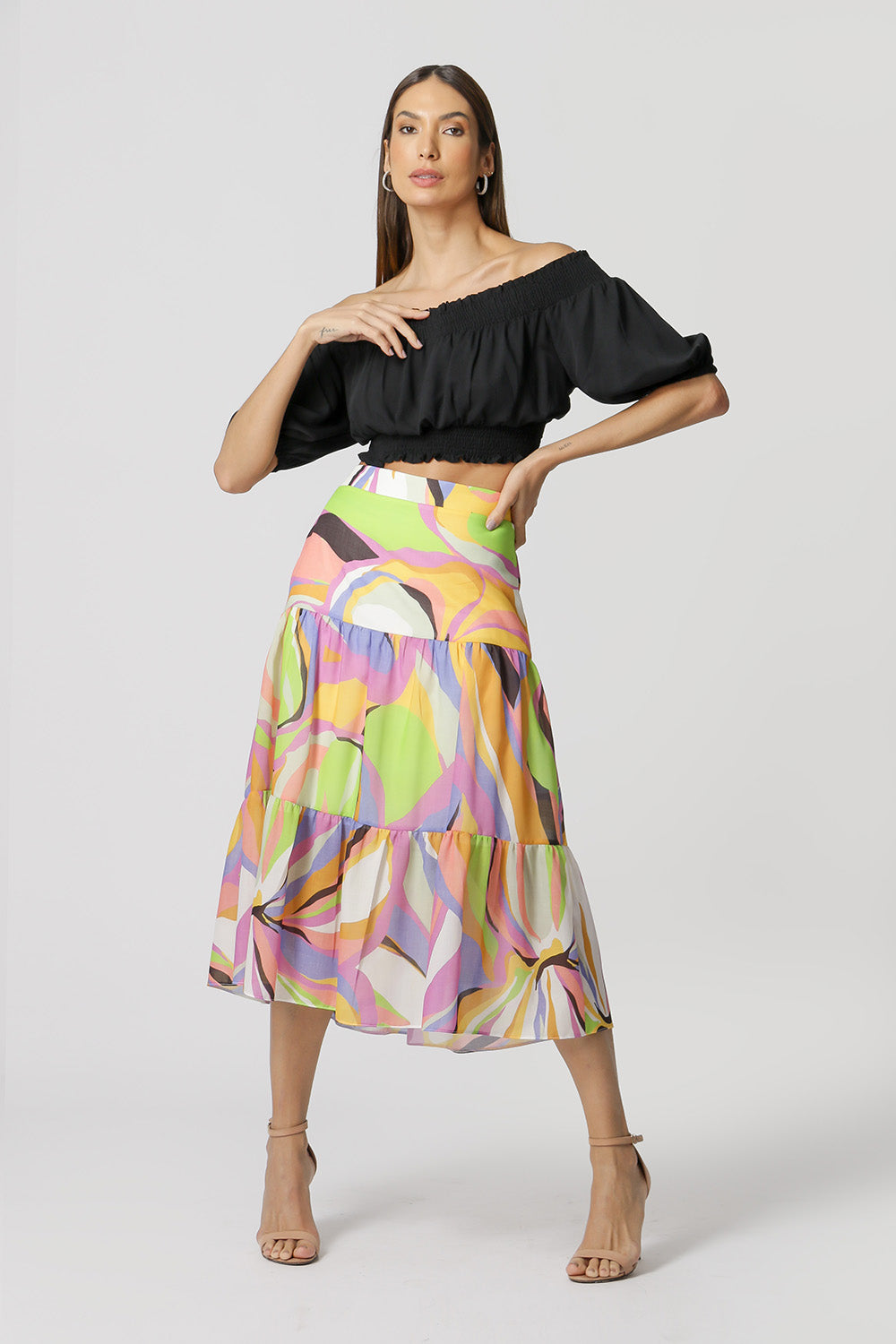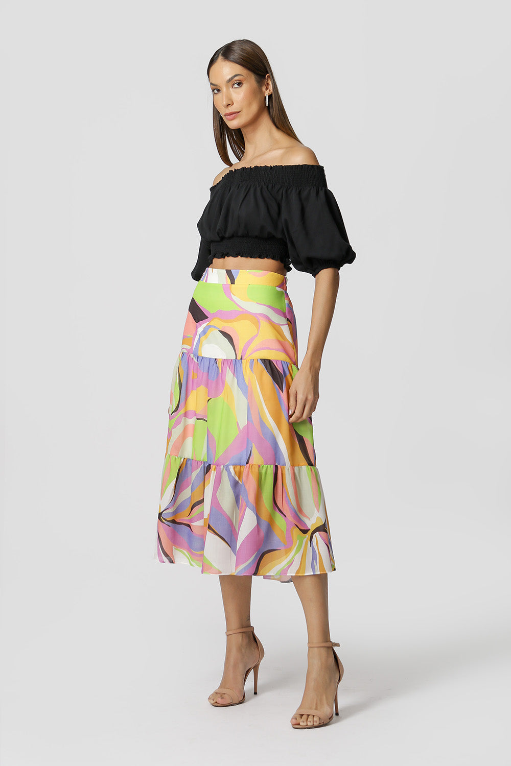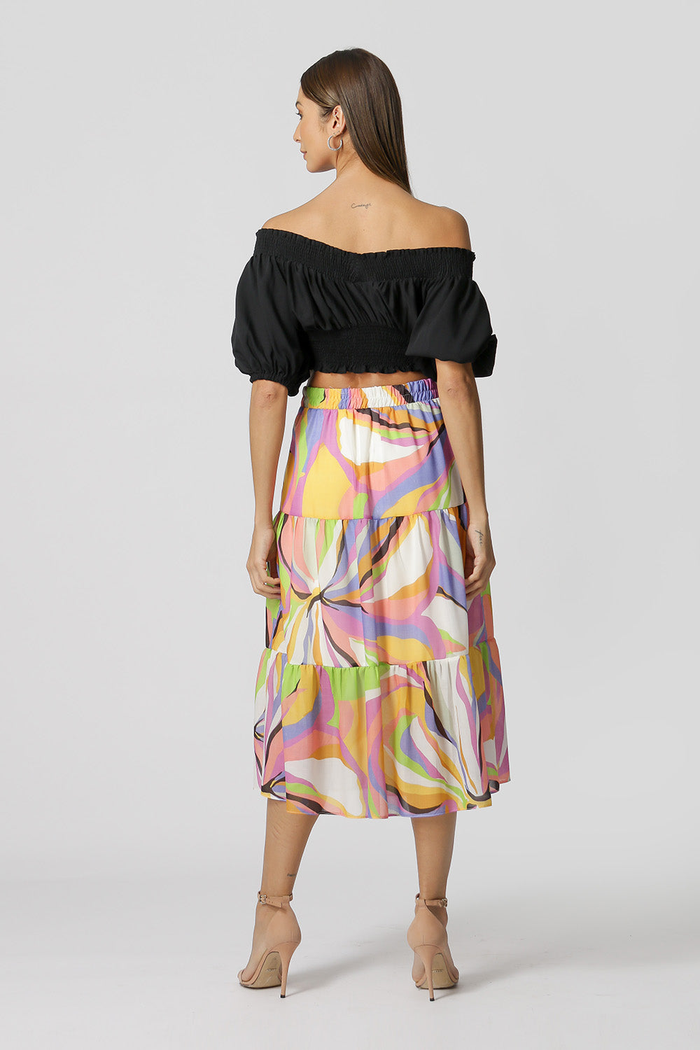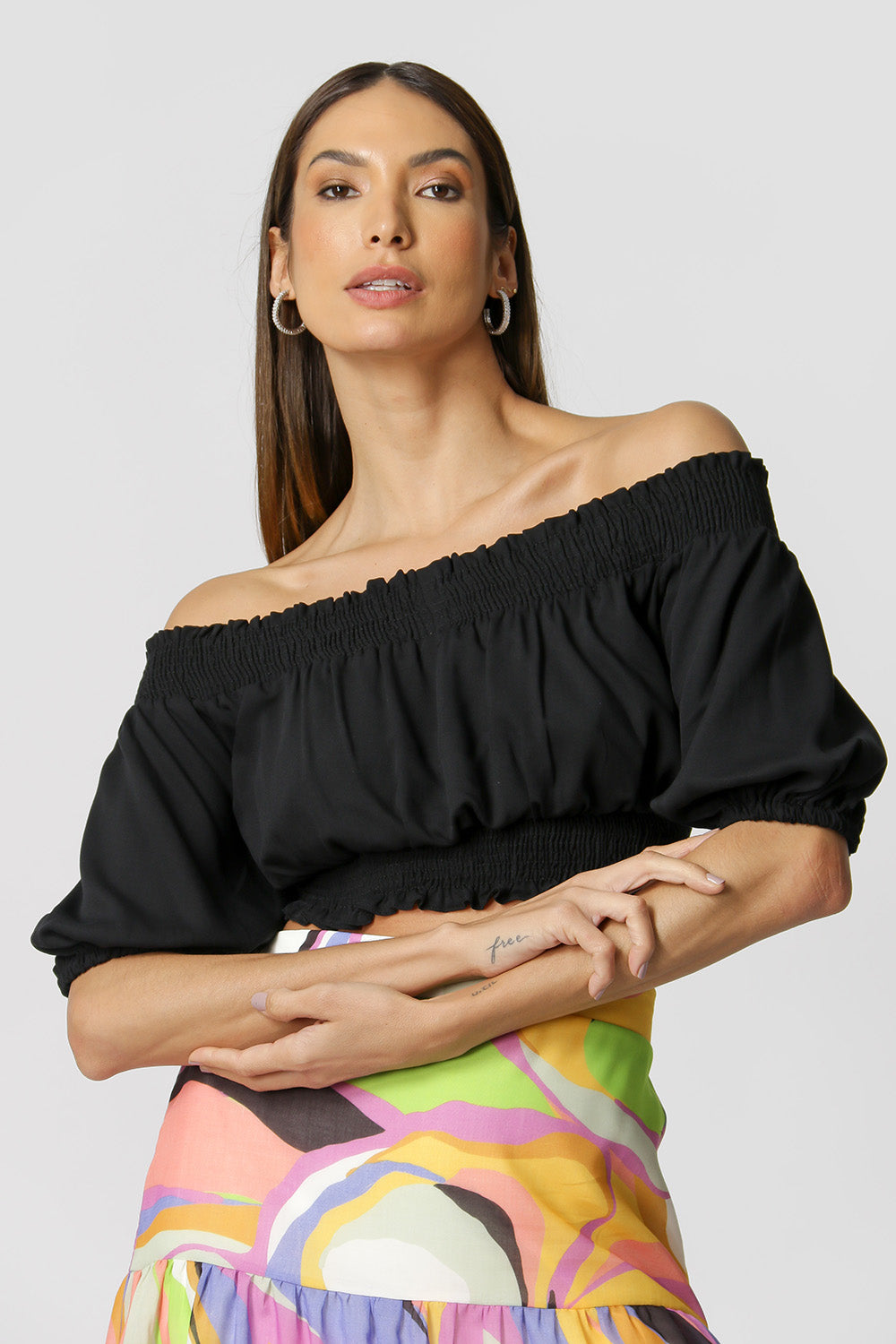 Blusa con hombros descubiertos, canesú elástico y detalle de escote elástico. Pieza súper cómoda confeccionada en viscosa fluida.