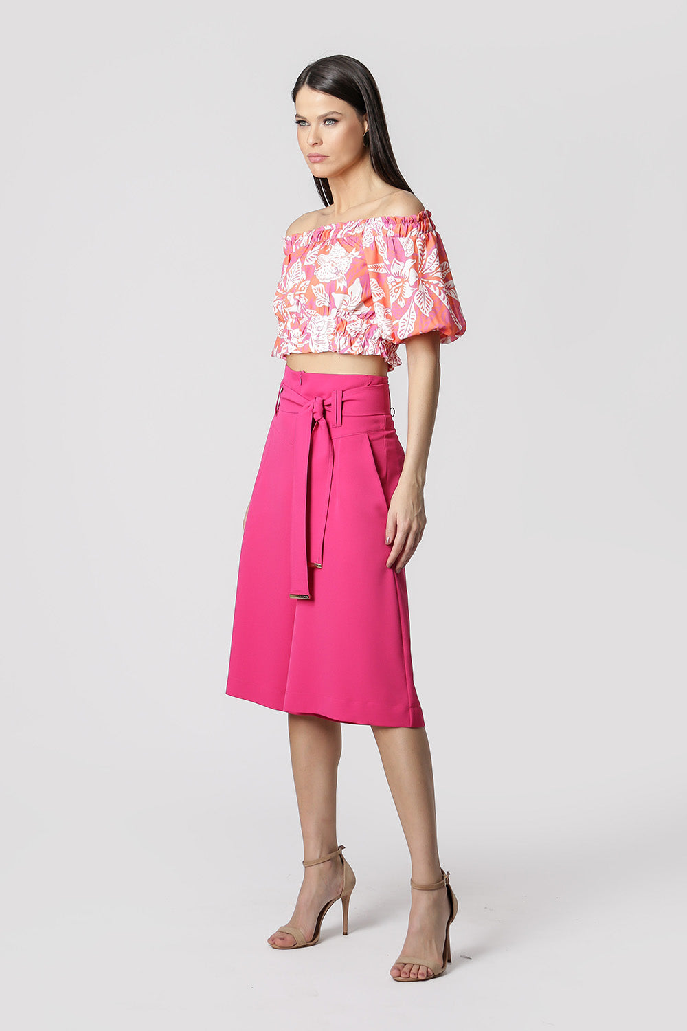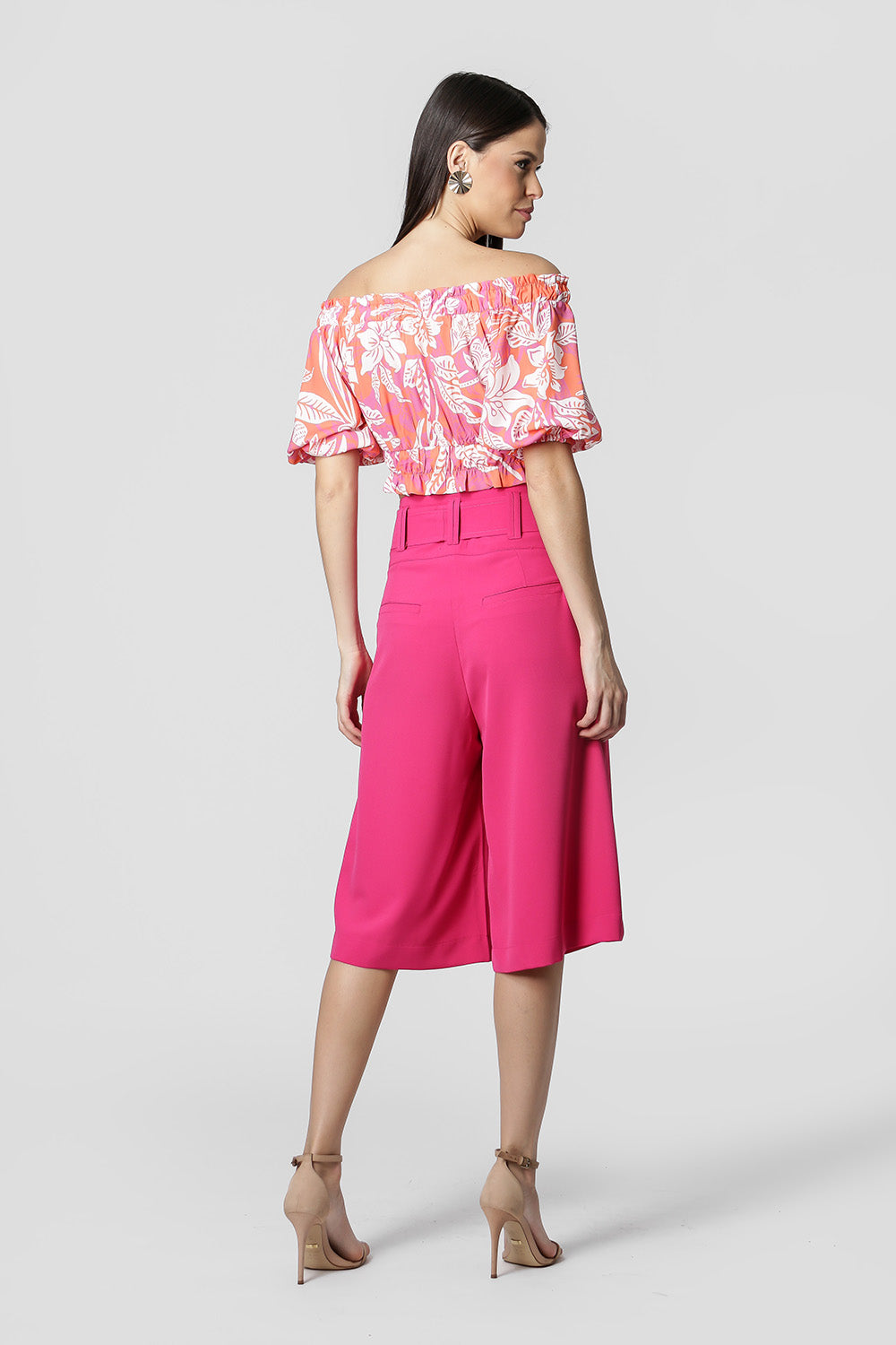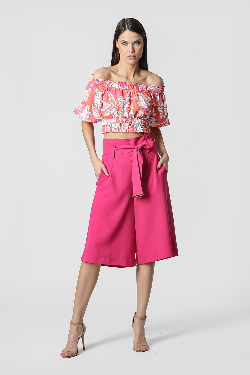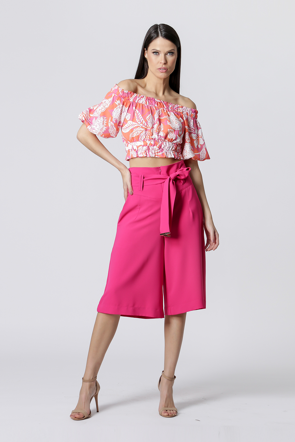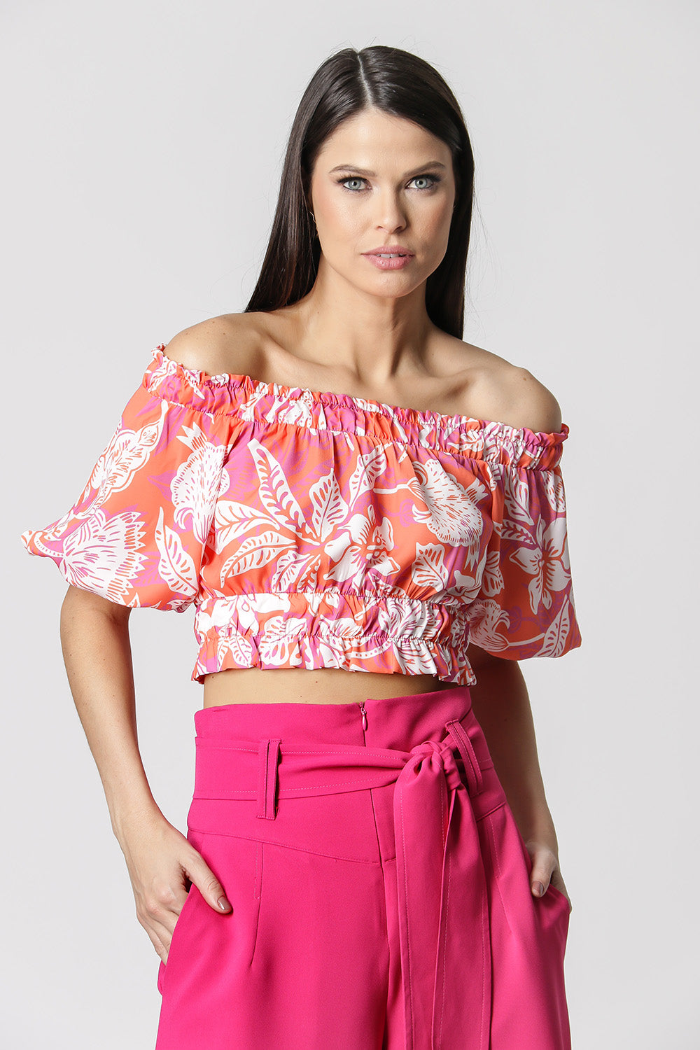 Blusa estampada con escote hombros descubiertos, largo cropped, manga corta con ligero volumen, elástico incorporado en hombro, bajo y puños de mangas. Pieza ideal para un look casual lleno de estilo.