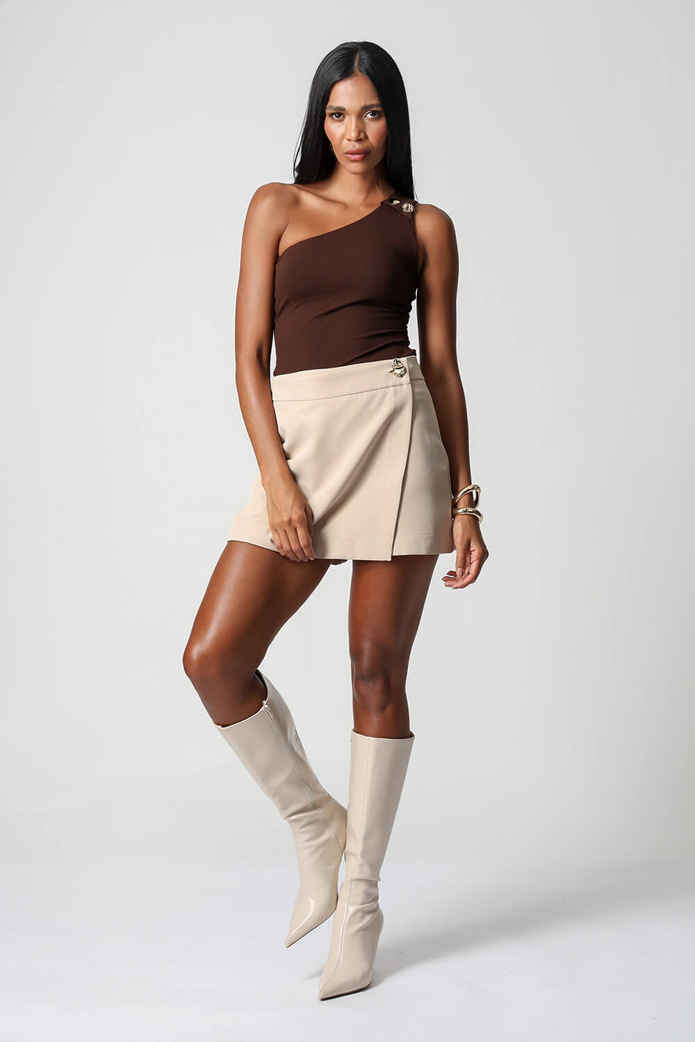 Blusa de un solo hombro con botones dorados - CAFÉ
