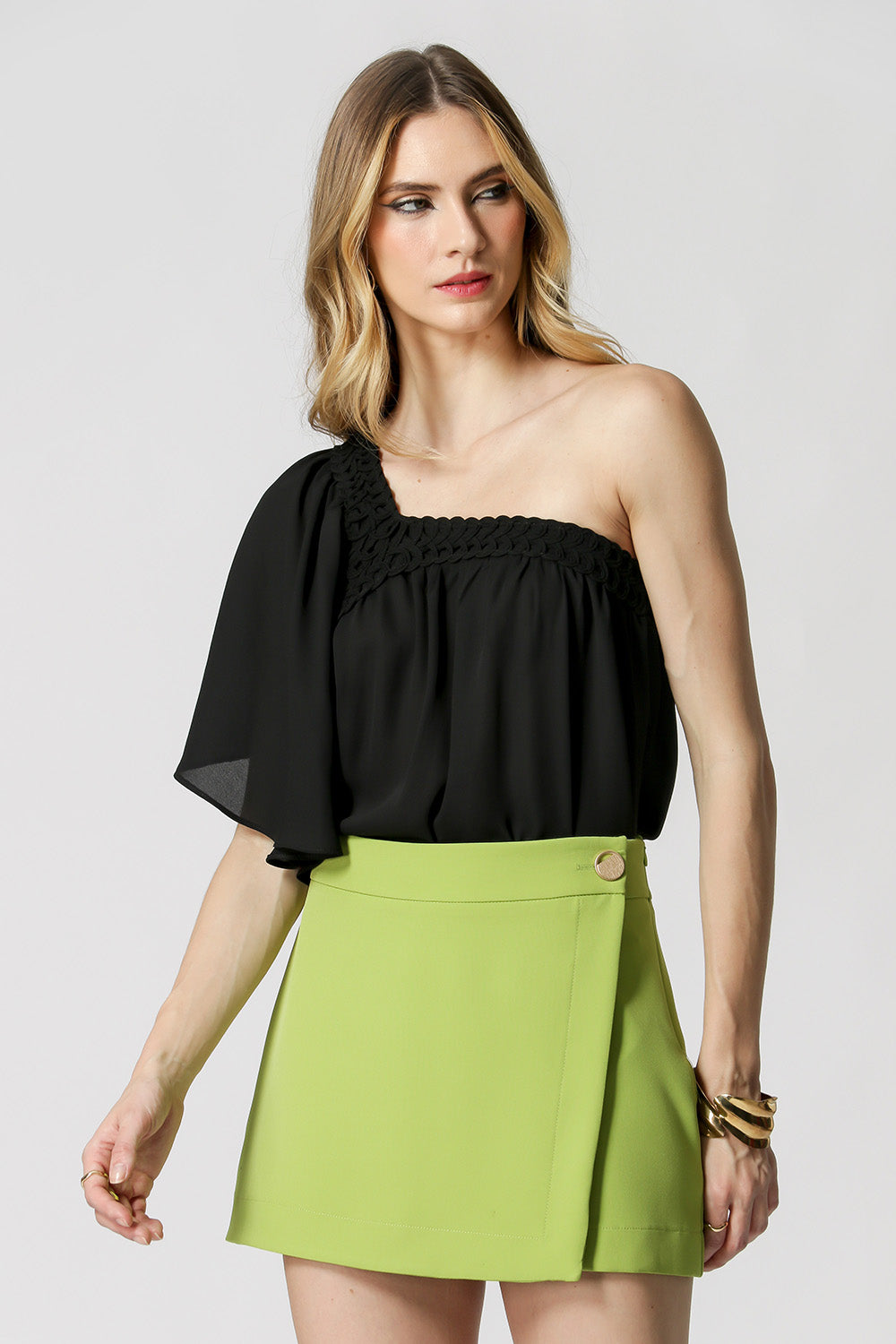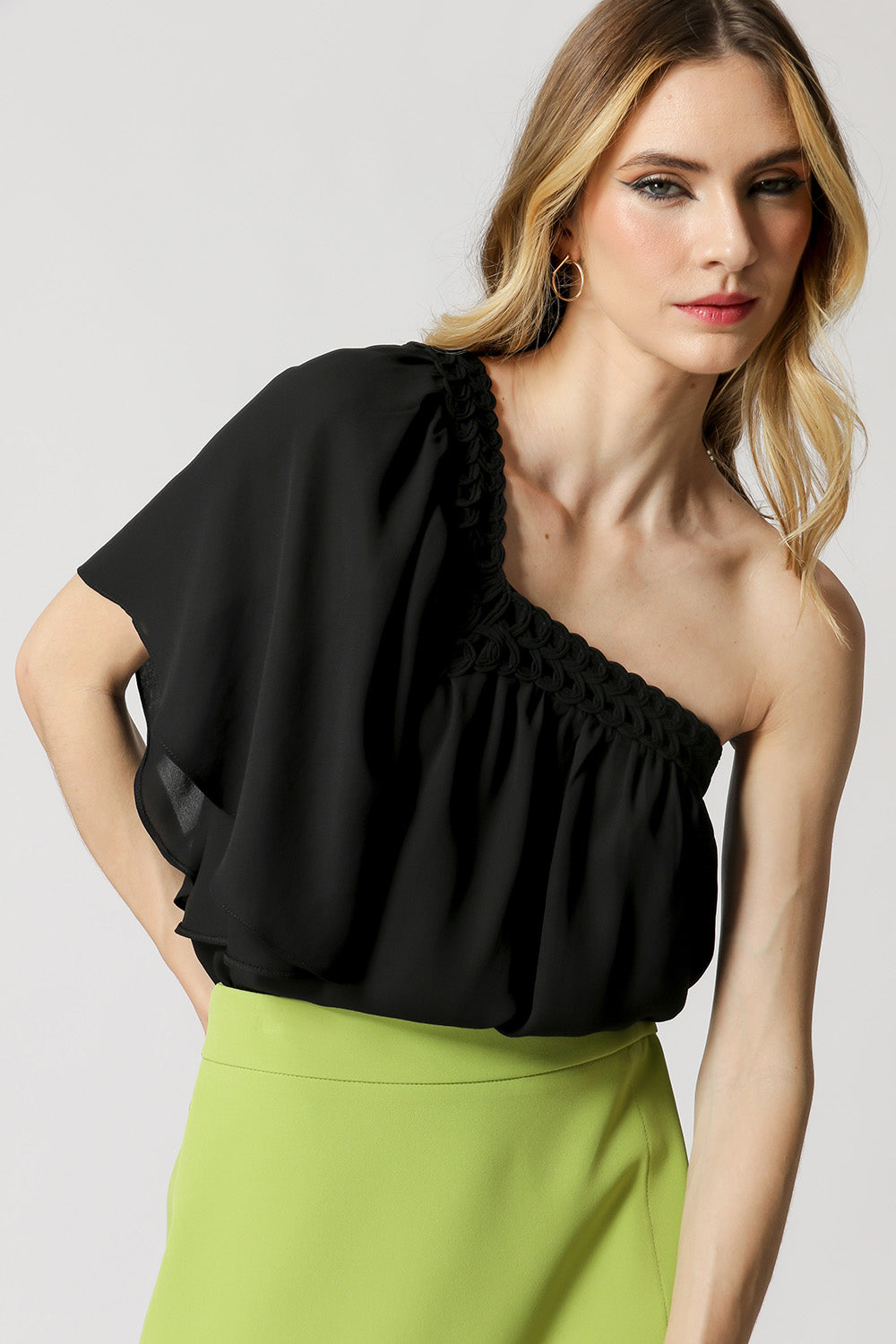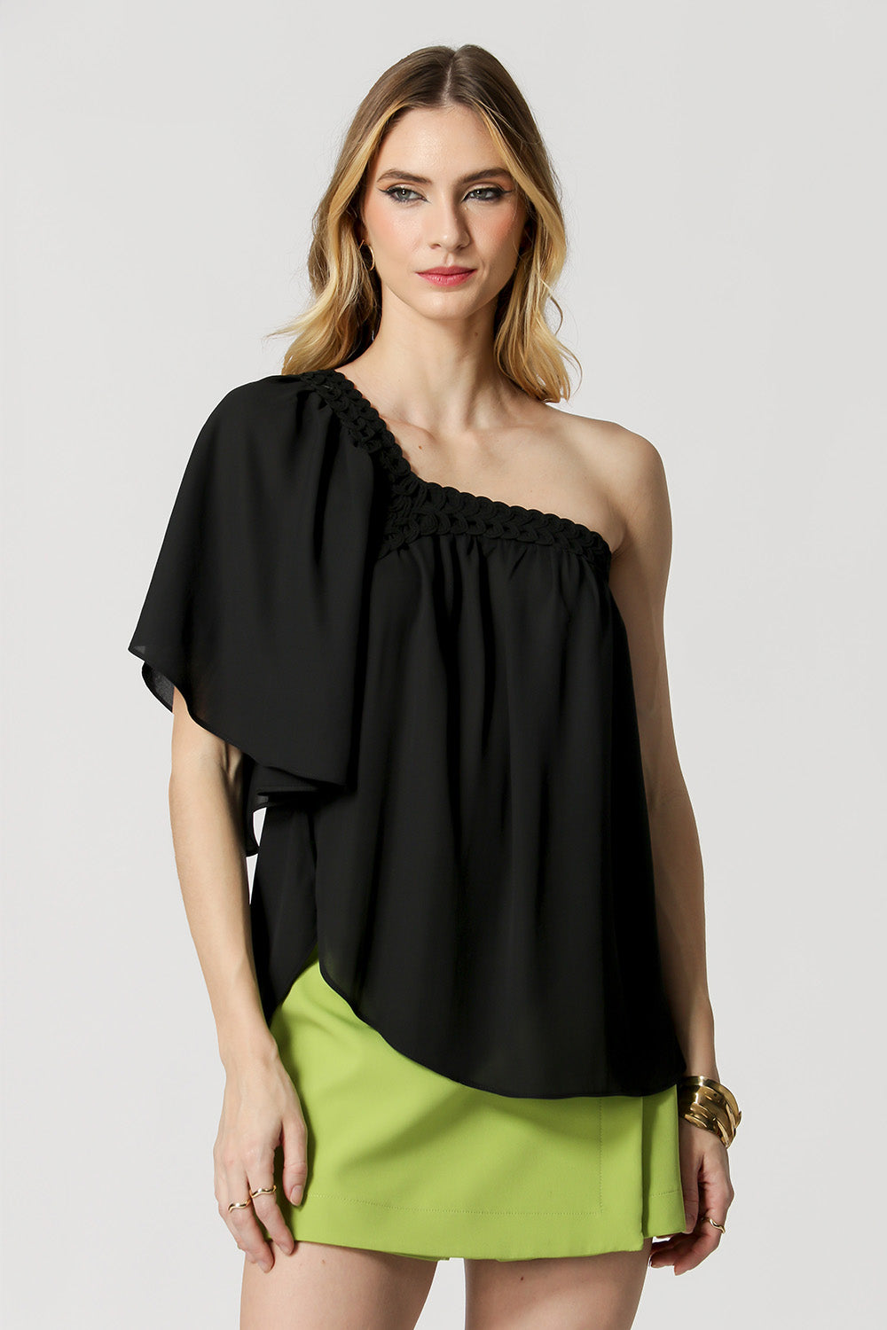 Blusa de un solo hombro con detalle de macramé. Pieza confeccionada en tejido crepé fluido. Un modelo elegante y lleno de encanto para crear looks casual.